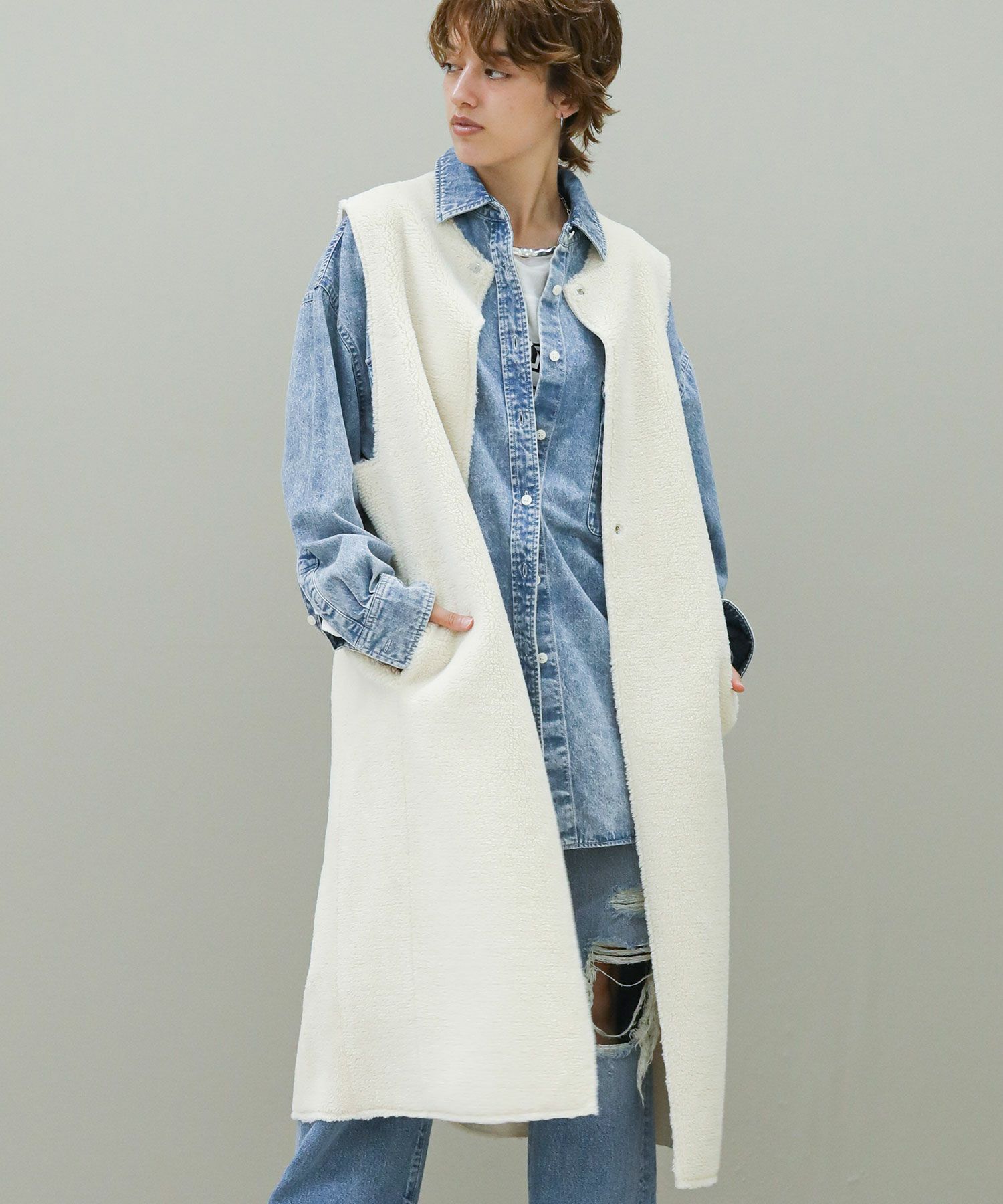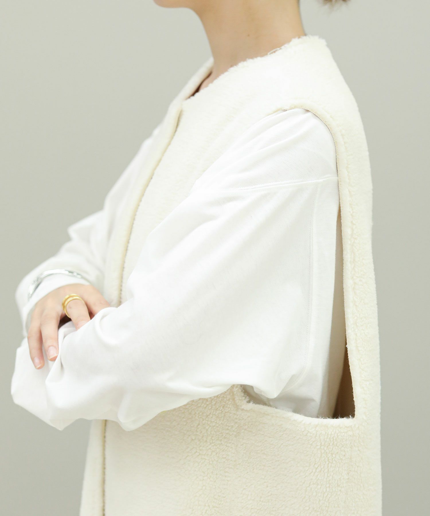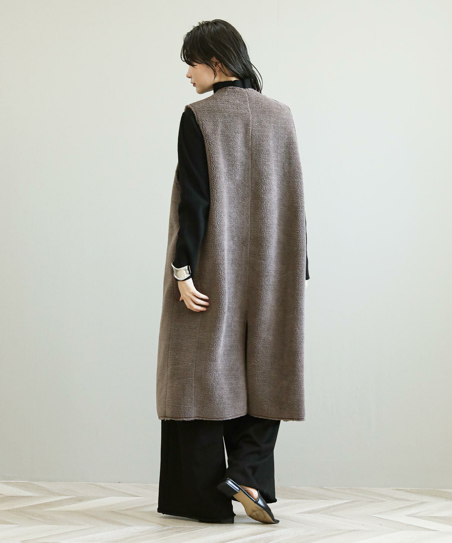 ボアファーとスウェードの両面で着用が可能です。ほっこりなりがちなムートンアイテムもすっきりとしたロング丈でモードな印象に。詰まったクルーネックやスクエアアームホール、コンパクトなサイズ感などシンプルながらも鮮度のあるデザインが魅力です。