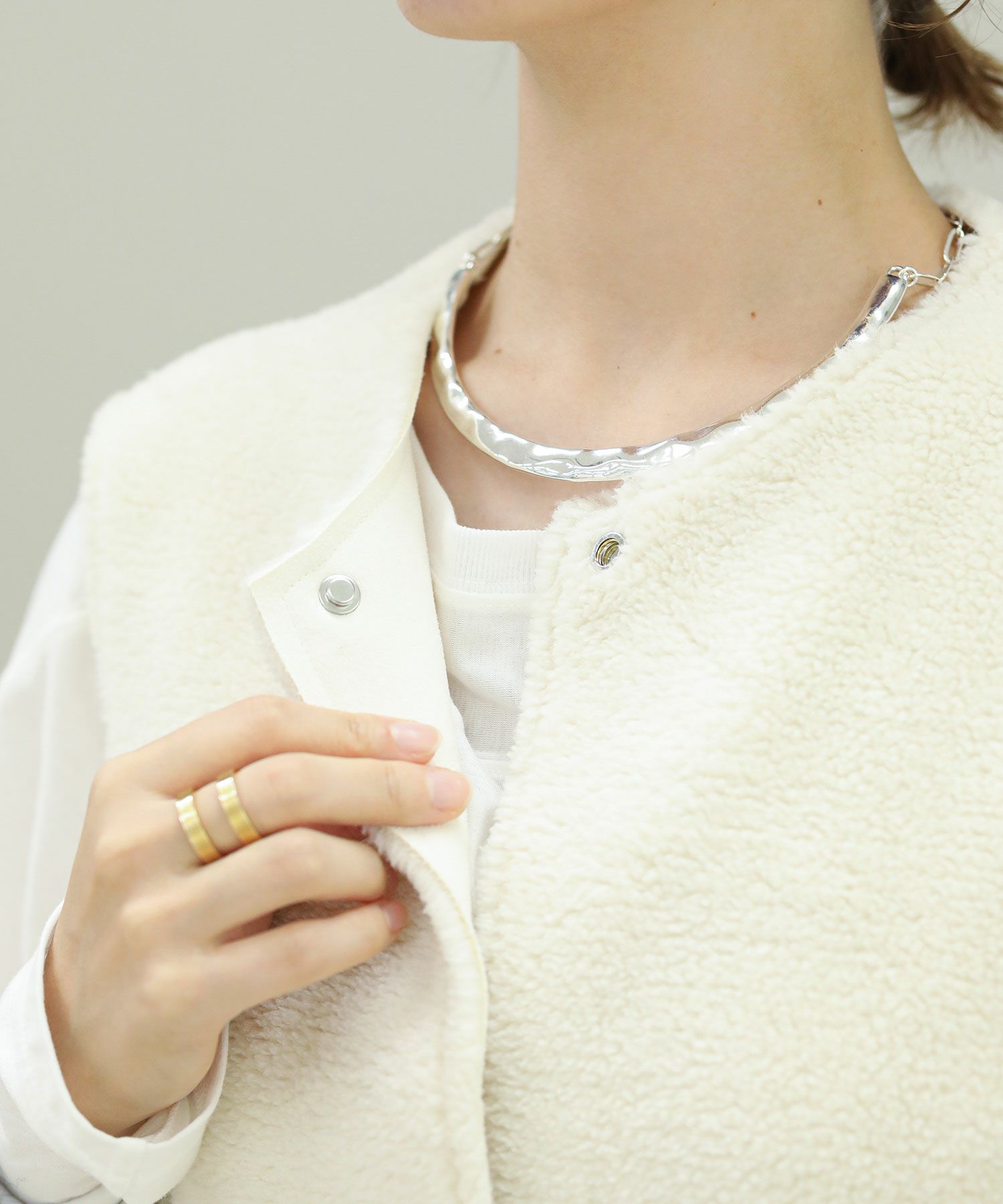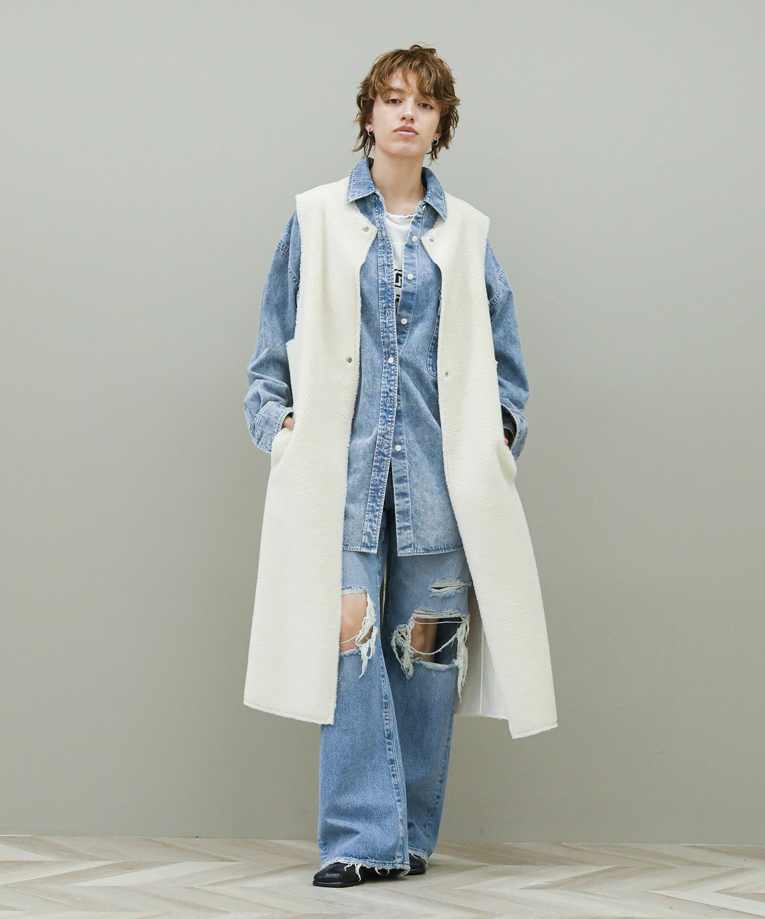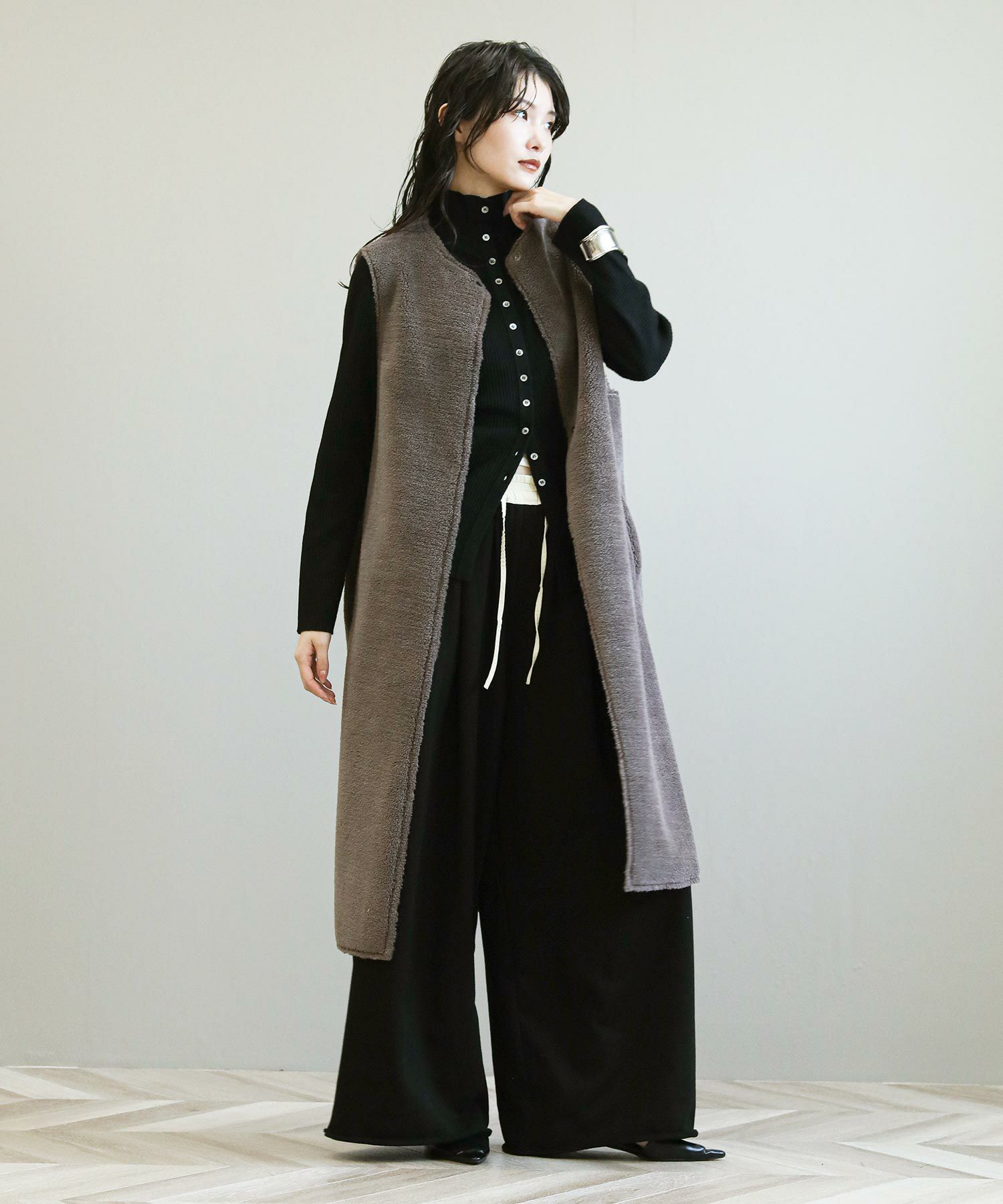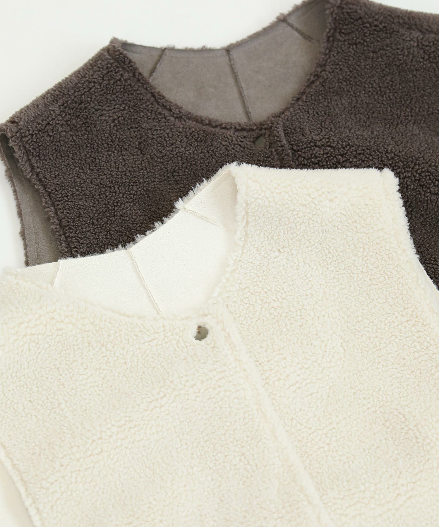 ボアファーとスウェードの両面で着用が可能です。ほっこりなりがちなムートンアイテムもすっきりとしたロング丈でモードな印象に。詰まったクルーネックやスクエアアームホール、コンパクトなサイズ感などシンプルながらも鮮度のあるデザインが魅力です。