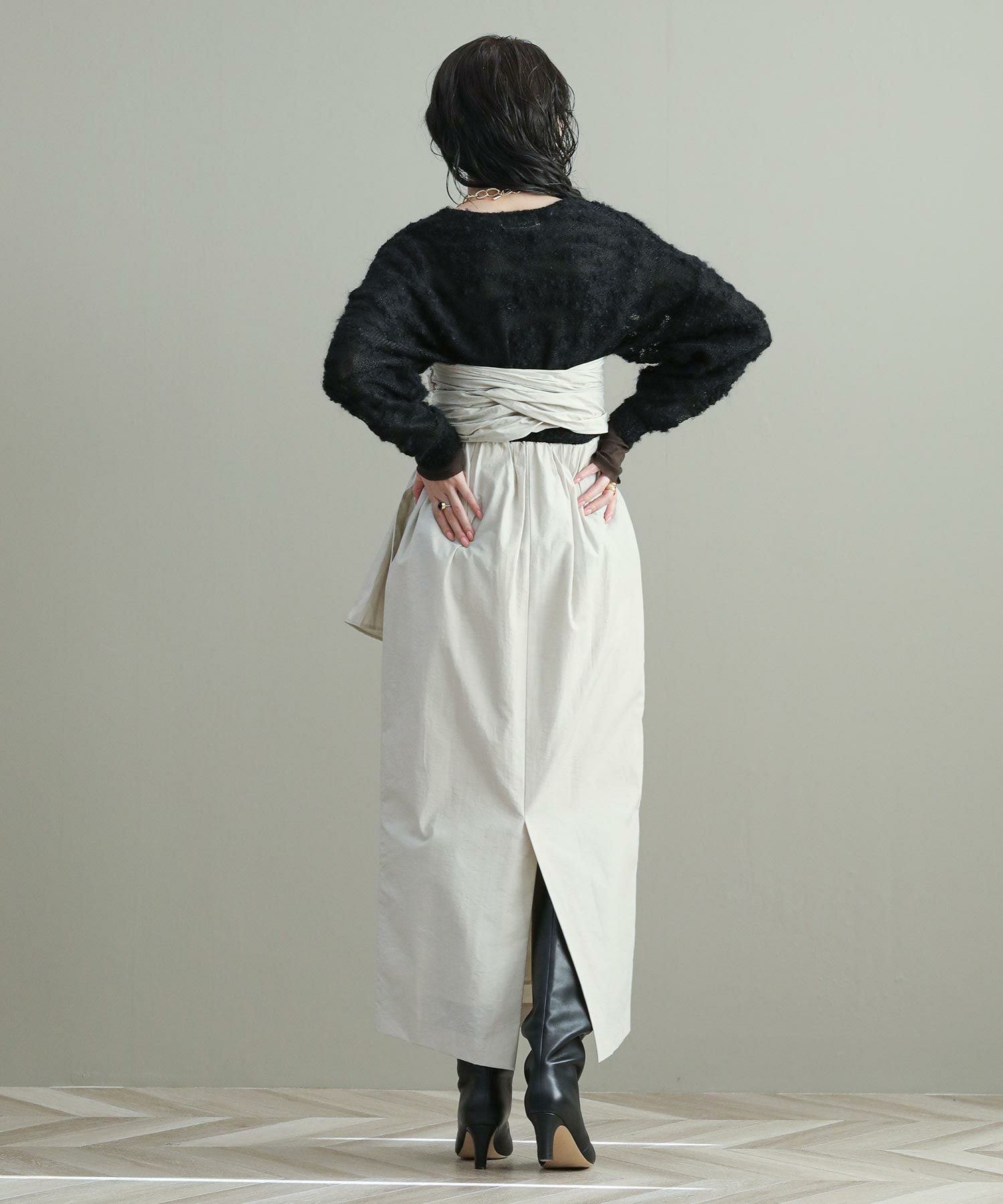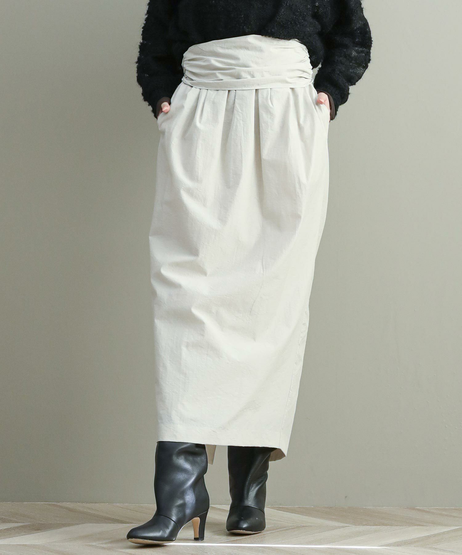 ナローシルエットのスカートは、ウエスト部分のタックが立体感をプラス。ウエストまわりもカバーしつつゴム仕様なので履き心地もストレスフリー。