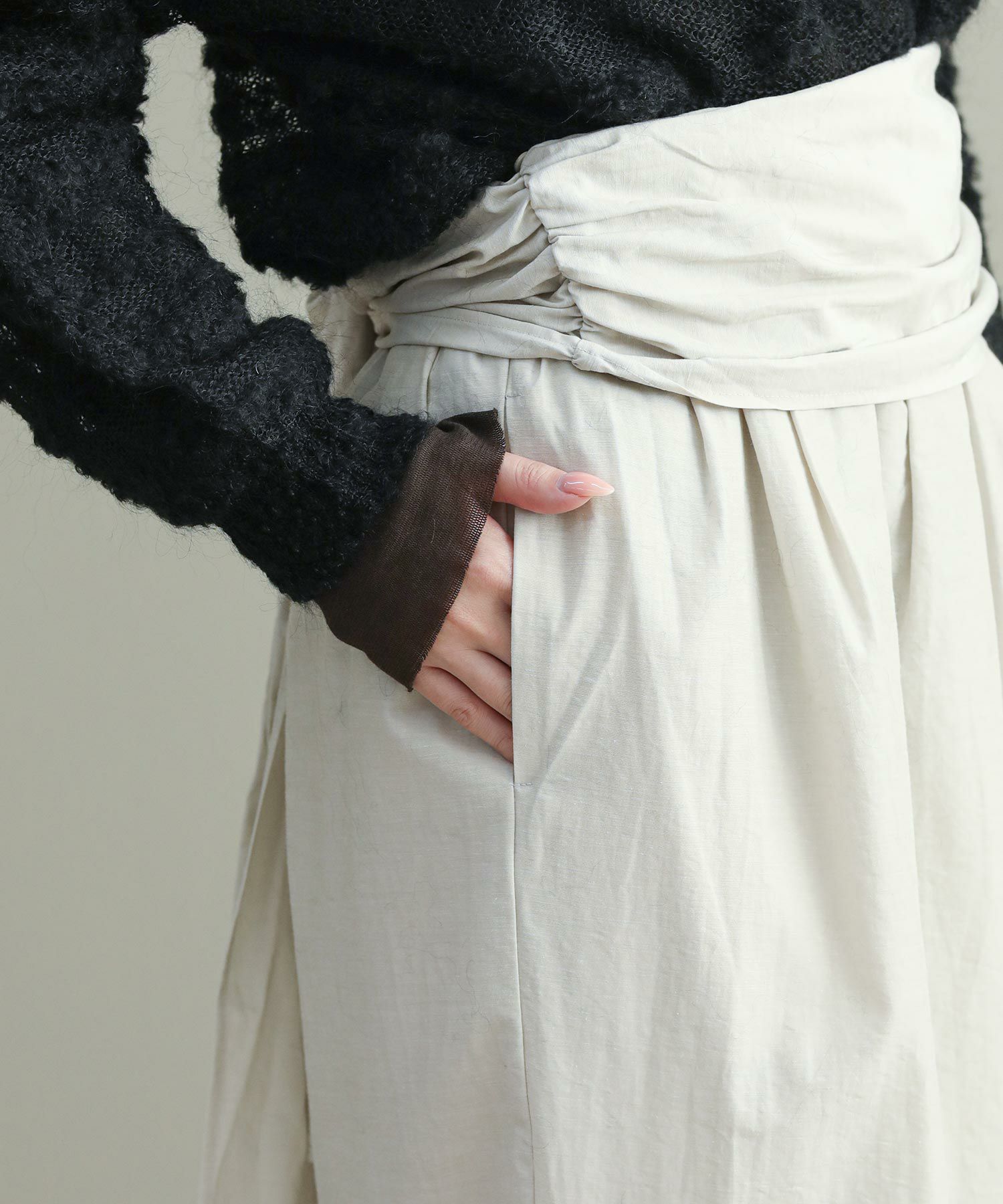 ビスチェは、ウエストに巻きつけてもスタイリング可能。スカートのウエスト部分にボタンが付いているのでズレてきてしまうこともなく安心。