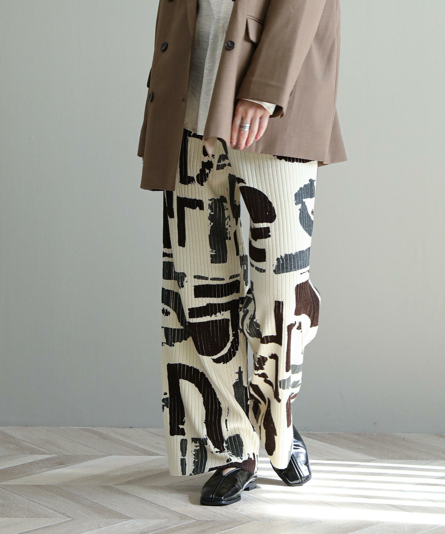 3色の内、1色は箔プリントが施されています。適度な落ち感を重視し、重みのない軽やかな履き心地が特徴です 。ニットパンツでは珍しいサイドポケットが付いており、ウエストはゴム仕様も嬉しい。編地と柄の配色が目を惹くリブニットパンツです。