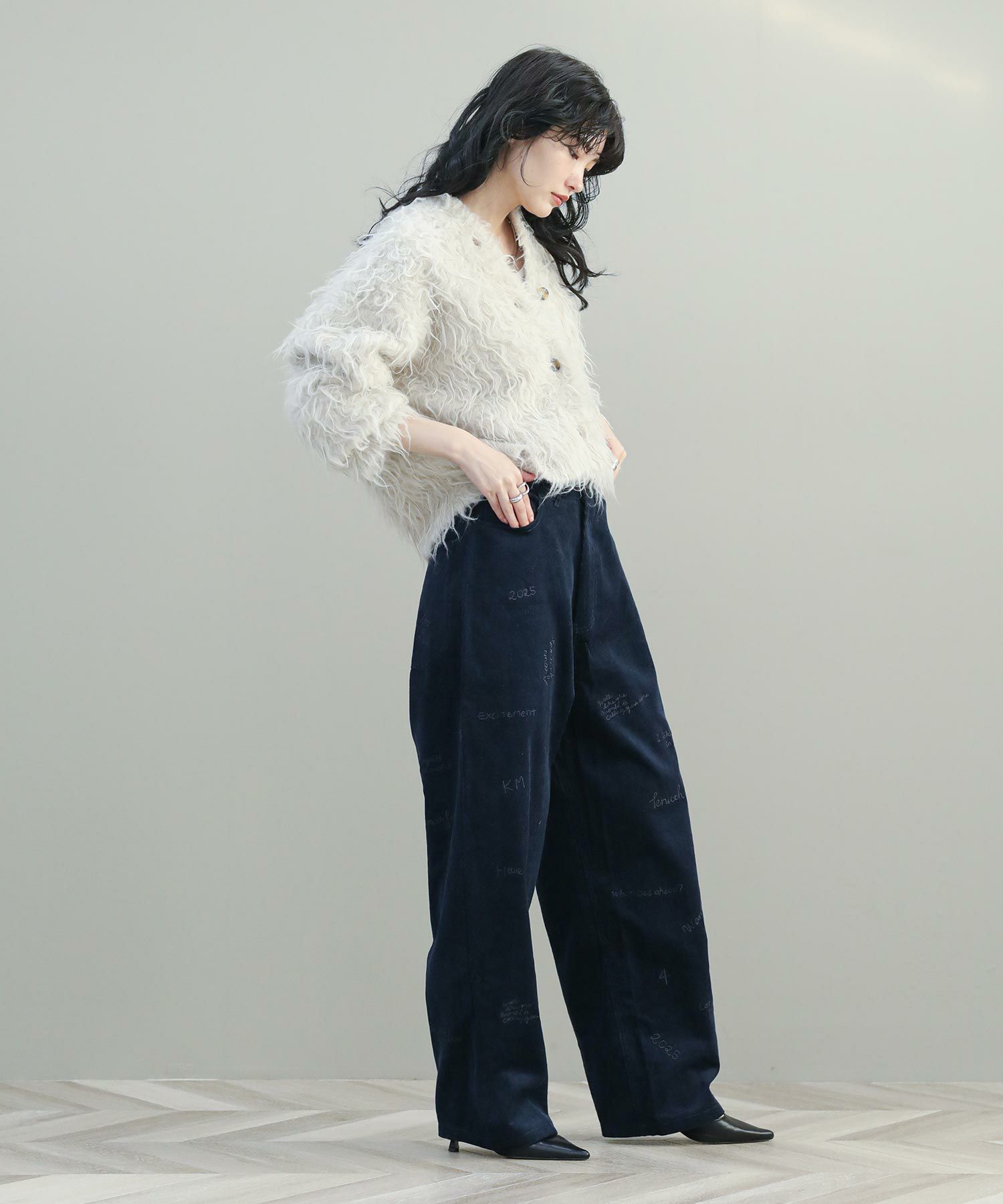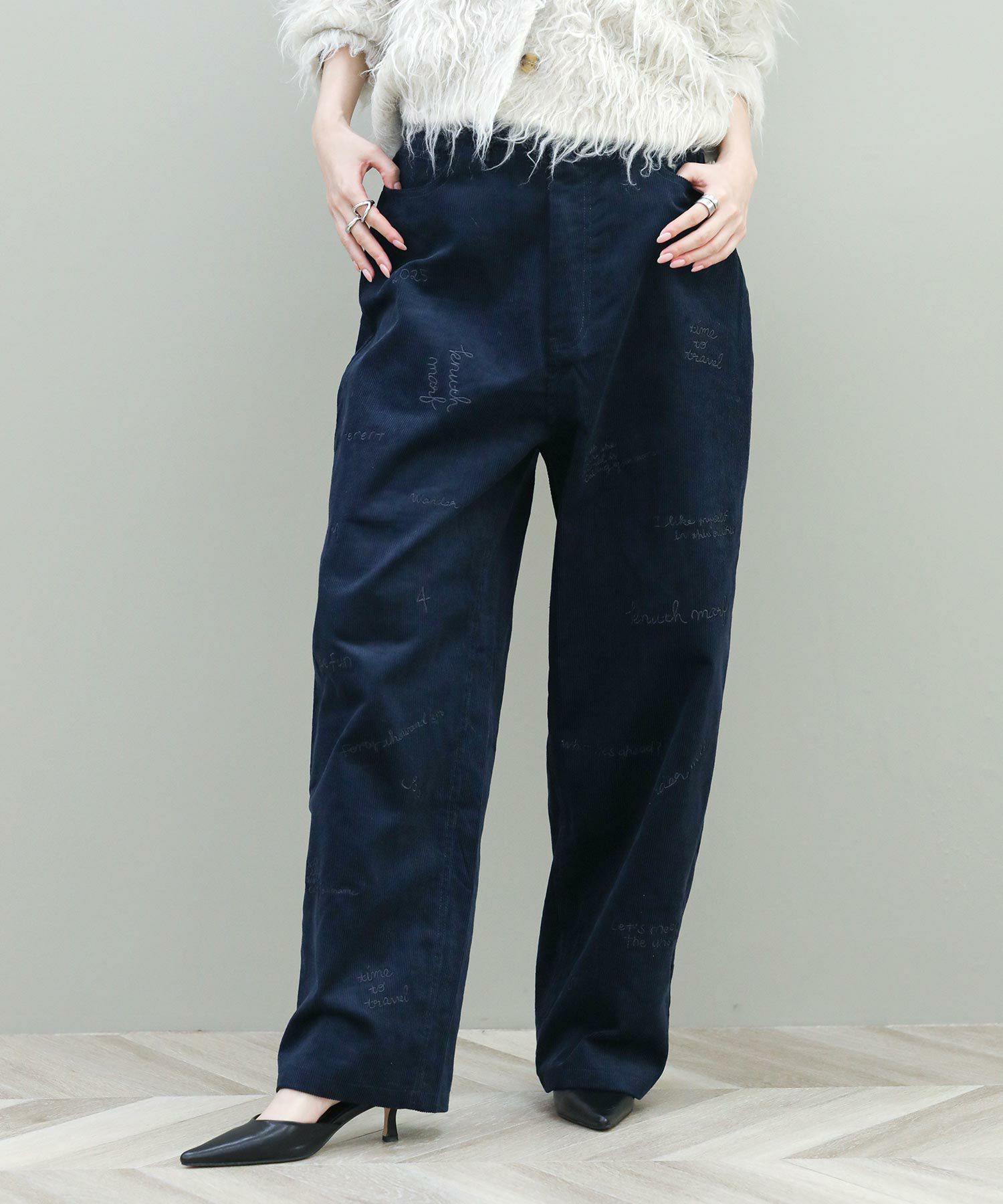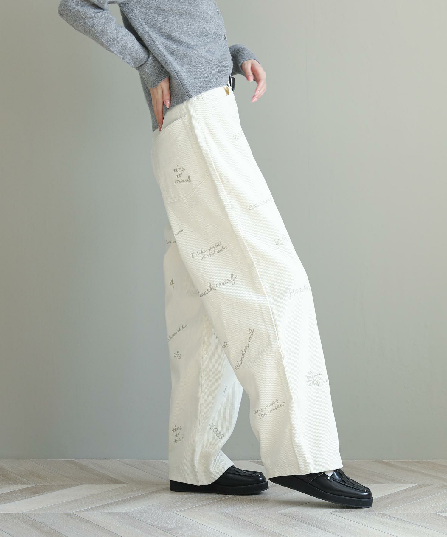 秋冬に馴染むコーデュロイ素材のパンツに、繊細な刺繍が目を惹くパンツ。