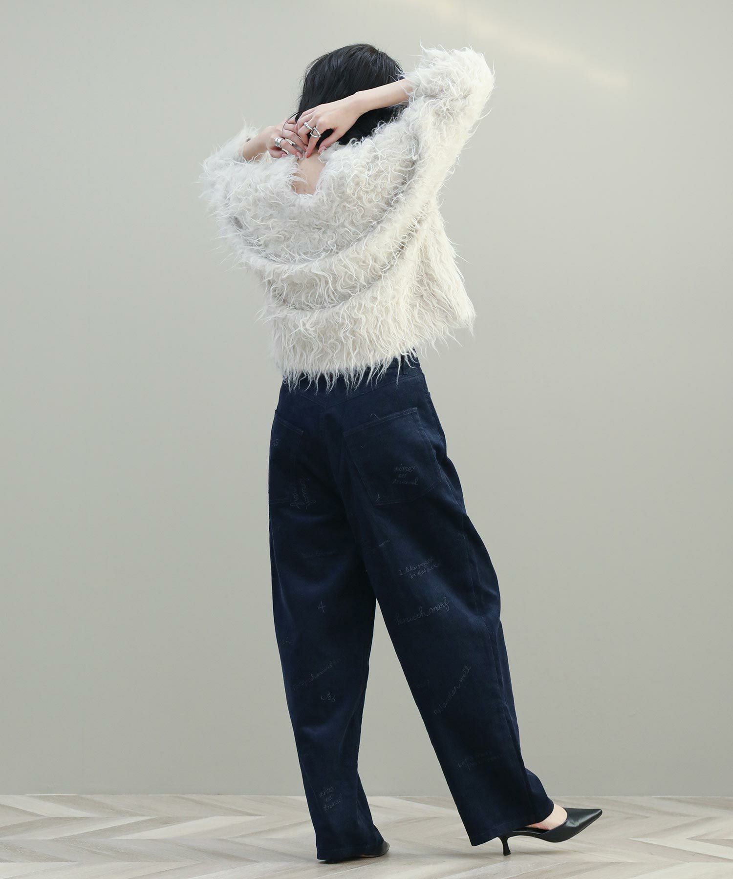 なぞるように走る刺繍は、主張しすぎない微光沢で存在感がありながらも、同一トーンでスタイリングに困りません。シルエットは腰まわりにほんのり余裕を持たせ、膝下にかけてストレートに落ちるので華奢見え効果も◎コンパクトなトップスともバランス良く着ていただけます。