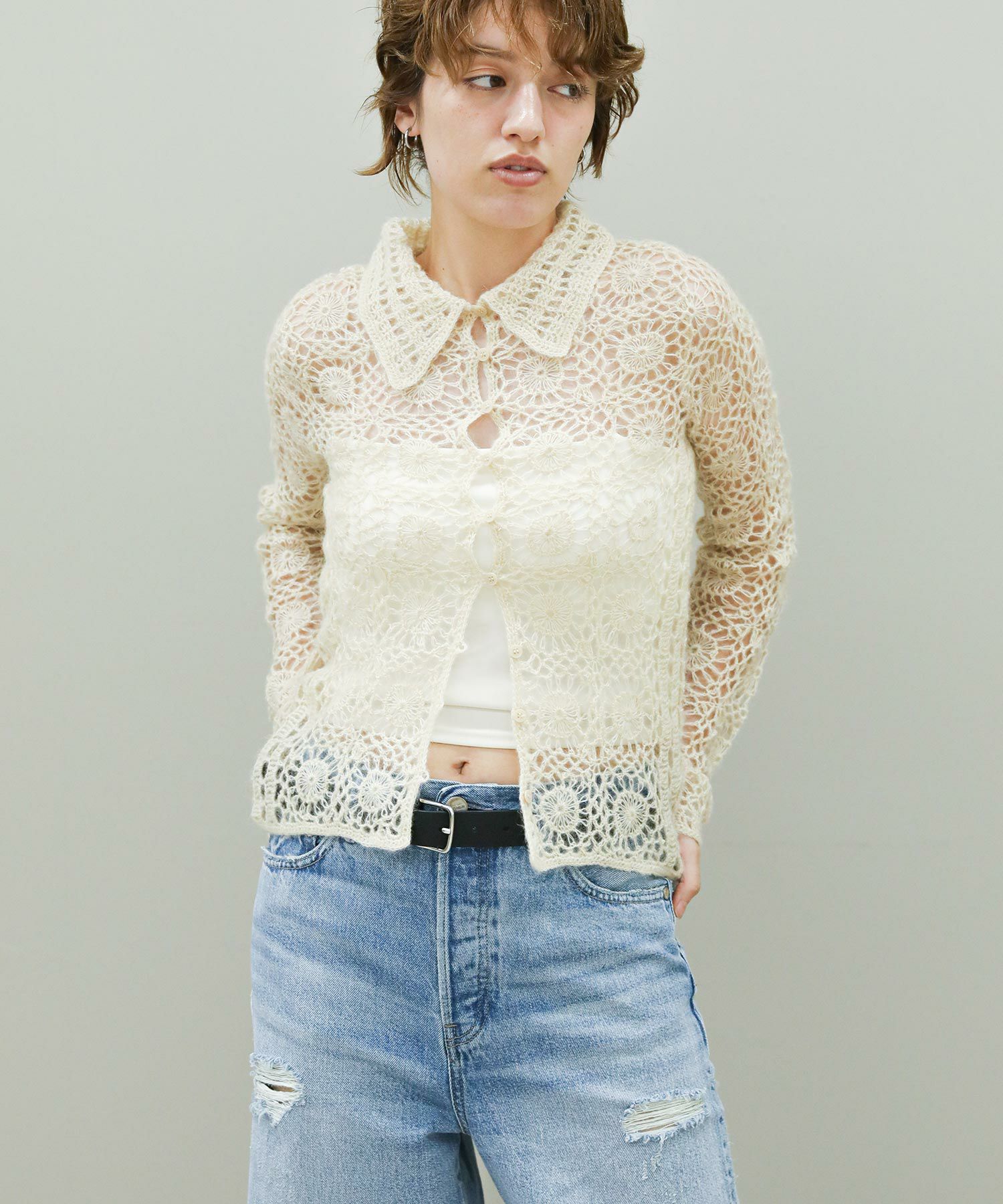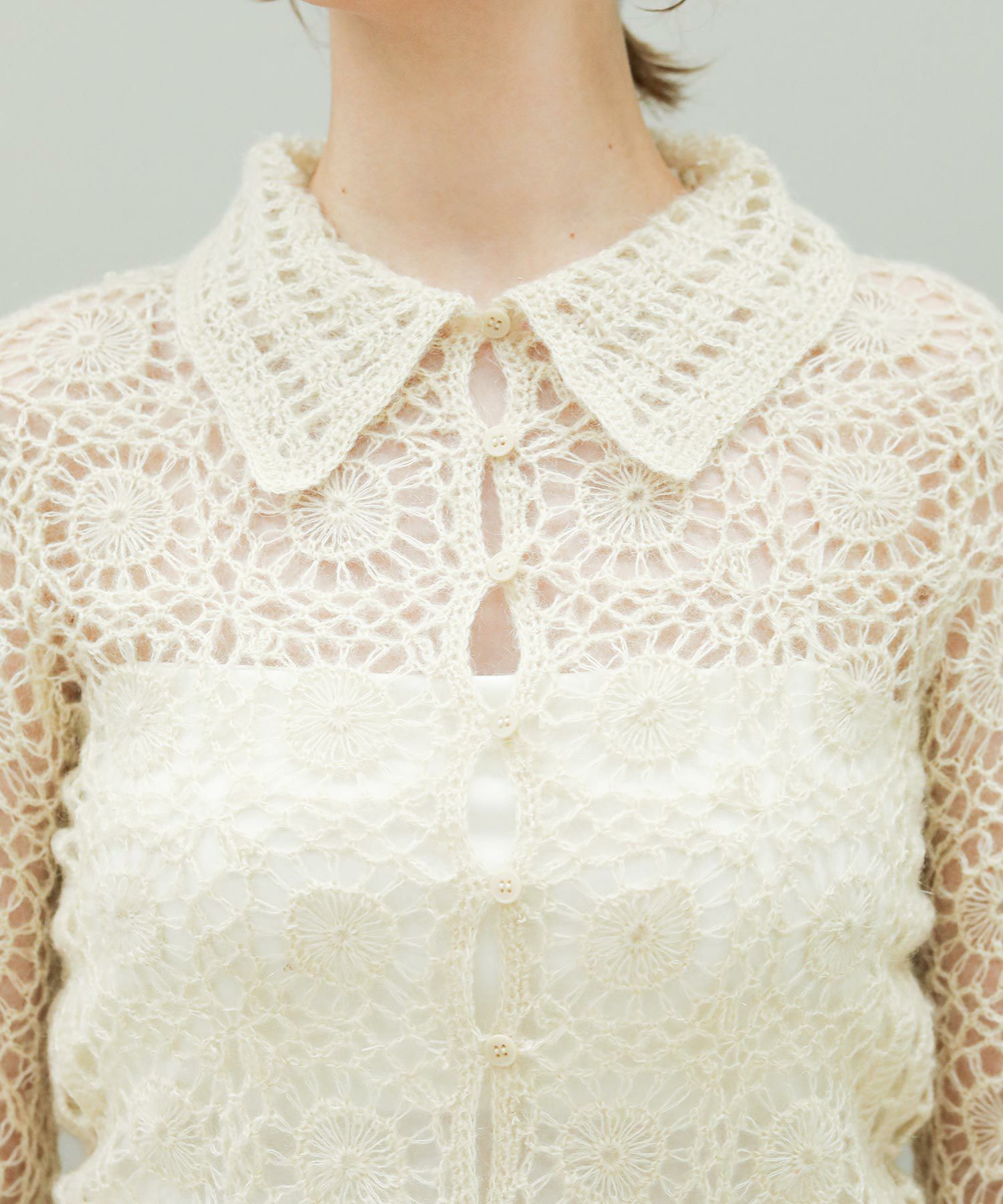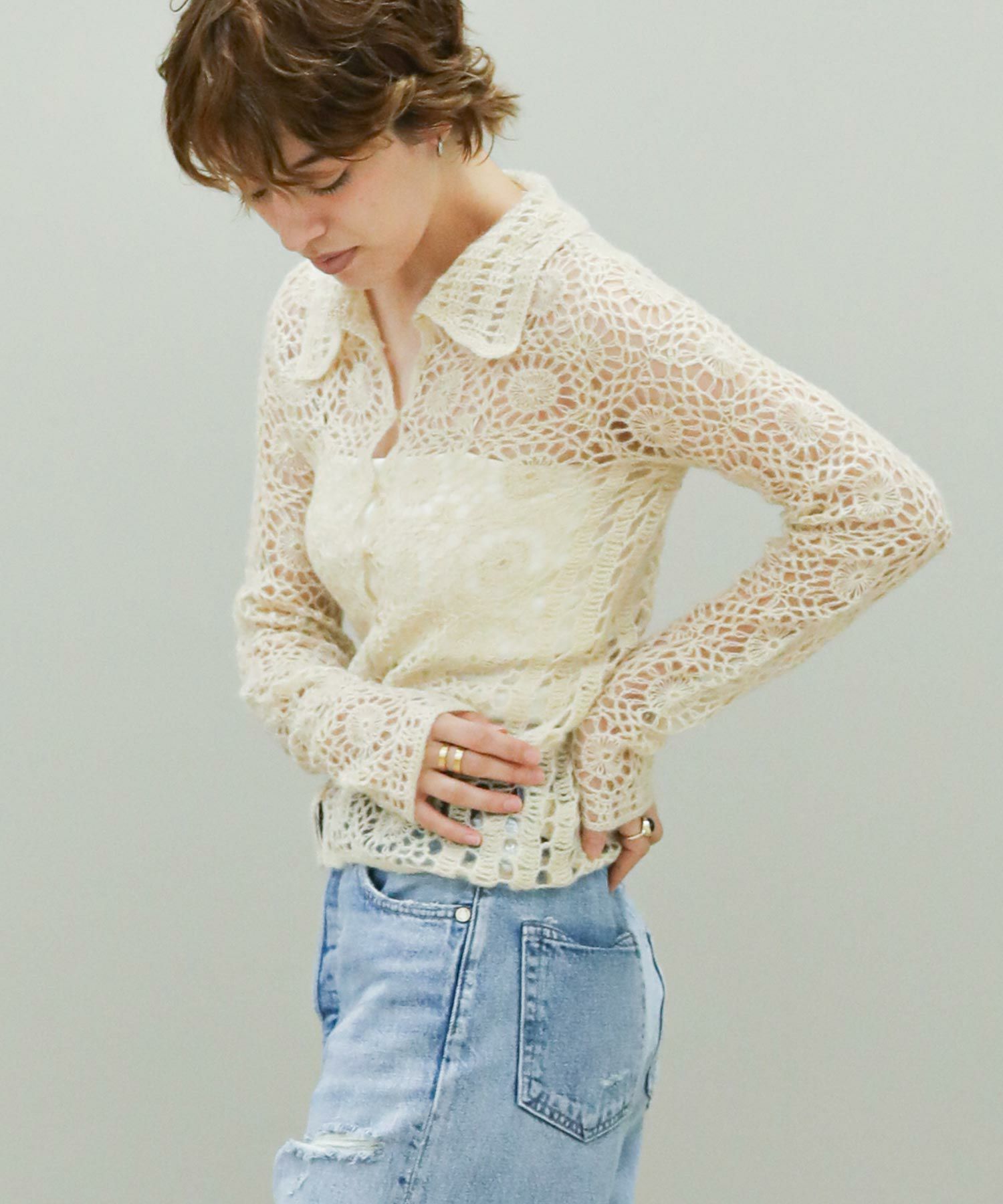 繊細な編み柄とシーズンムードたっぷりな素材感が魅力。透け感と体のラインに程良くフィットするサイズ感が女性らしく、シンプルなボトムスに合わせるだけでこなれた印象に。一つ一つ手作業で作っているため、サイズ感に個体差がある場合があります。