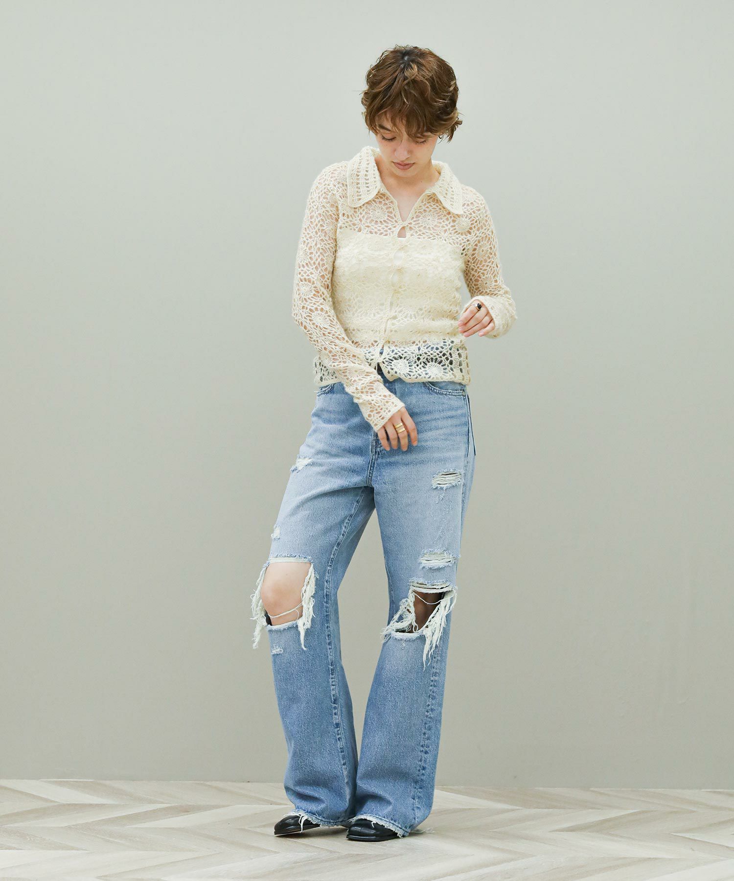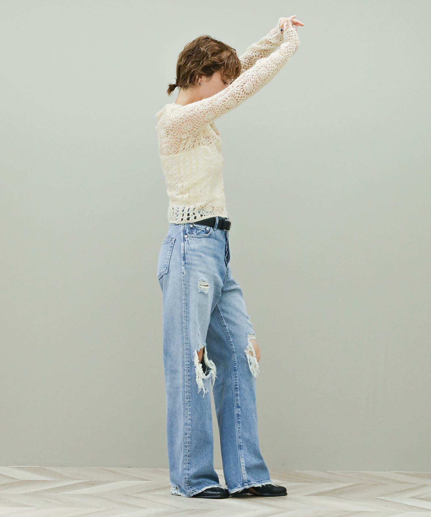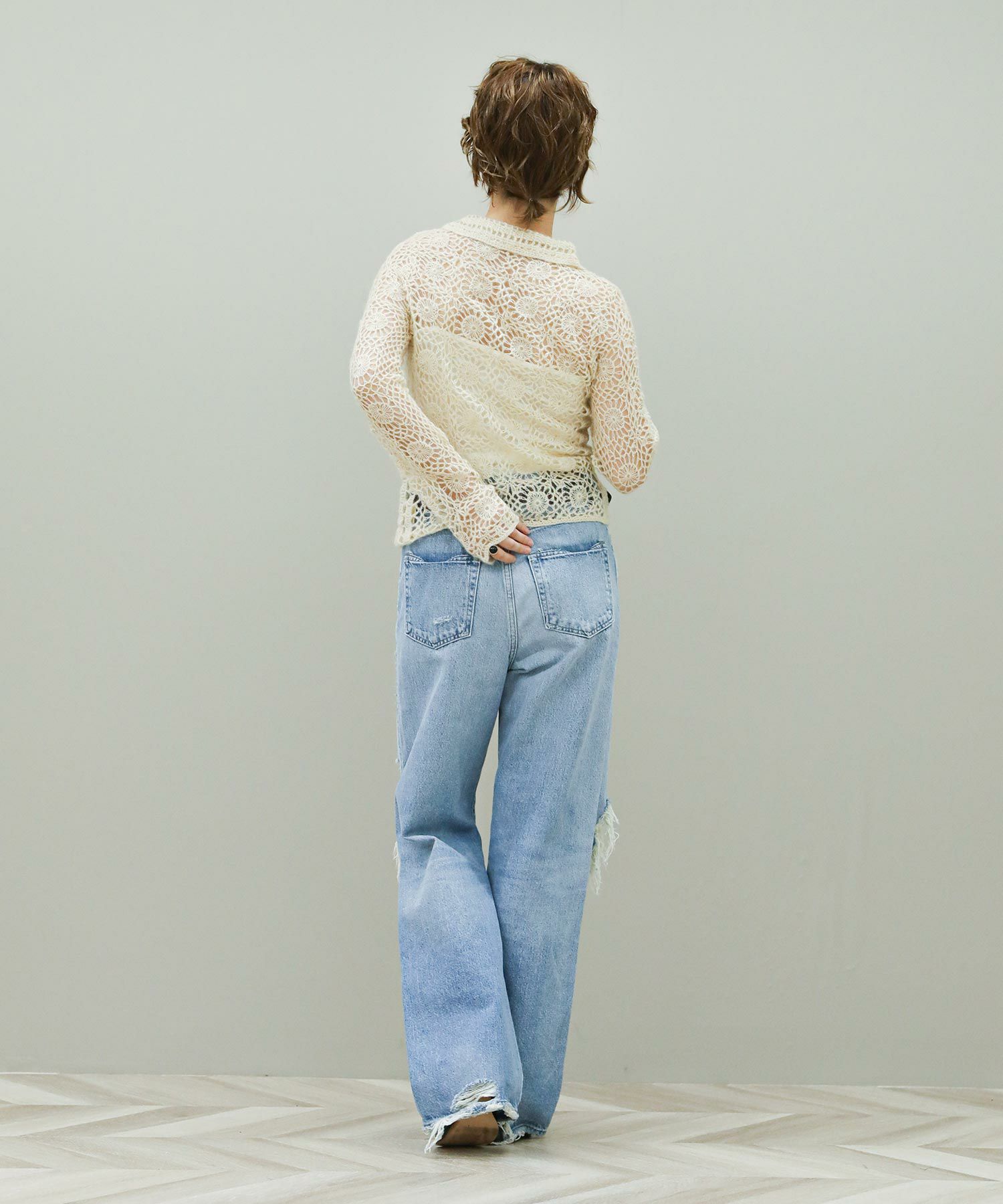 繊細な編み柄とシーズンムードたっぷりな素材感が魅力。透け感と体のラインに程良くフィットするサイズ感が女性らしく、シンプルなボトムスに合わせるだけでこなれた印象に。一つ一つ手作業で作っているため、サイズ感に個体差がある場合があります。