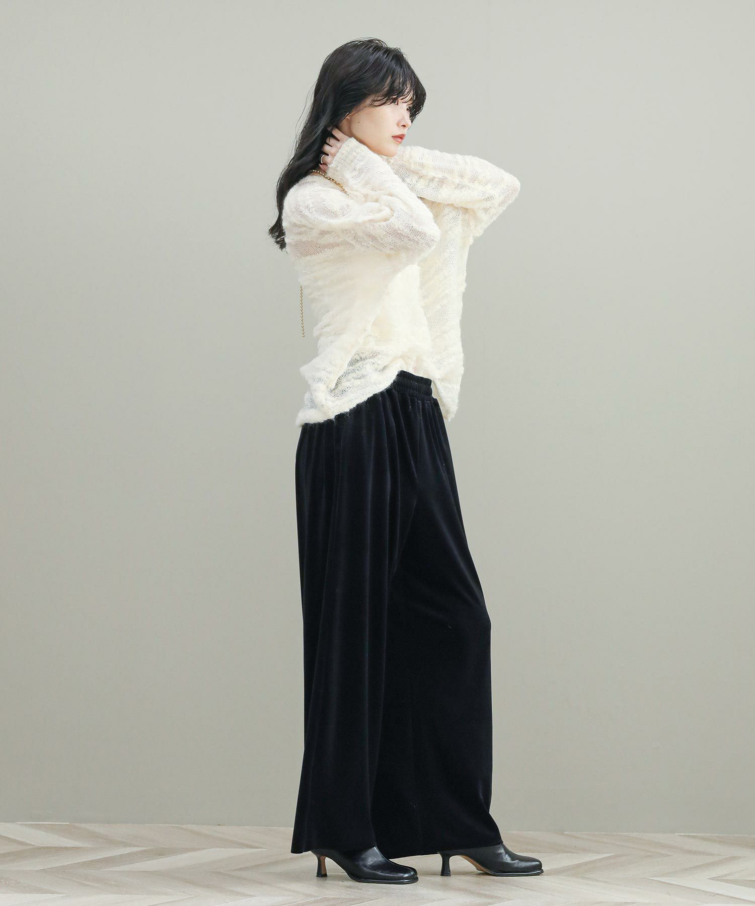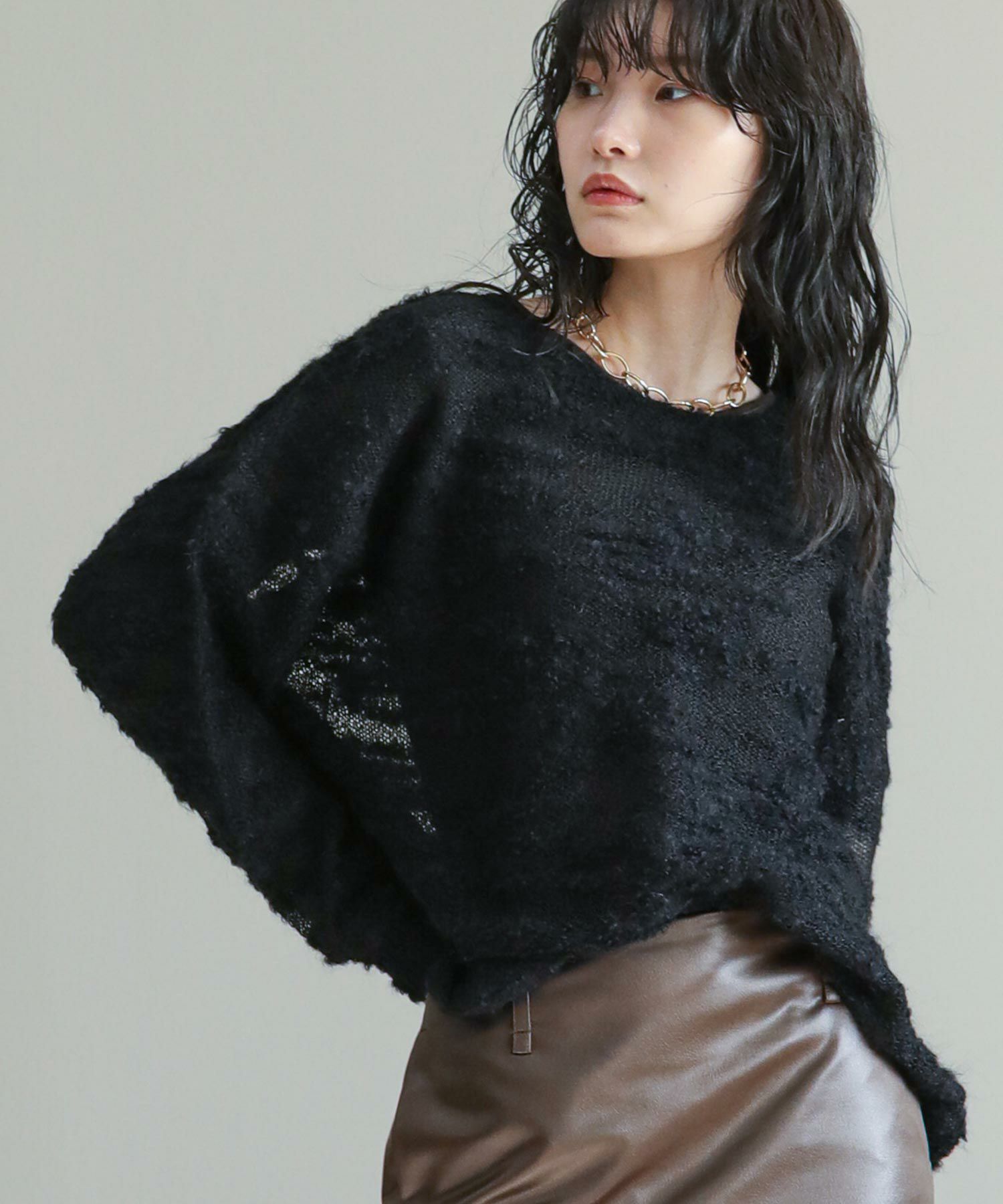 糸の繊細さやループ感を引き立てるためにざっくりとシアー感のある編地に仕上げています。ゆったりとしたサイジングに仕上げているので、シアー感を活かしたレイヤードスタイルを楽しんでいただけます。