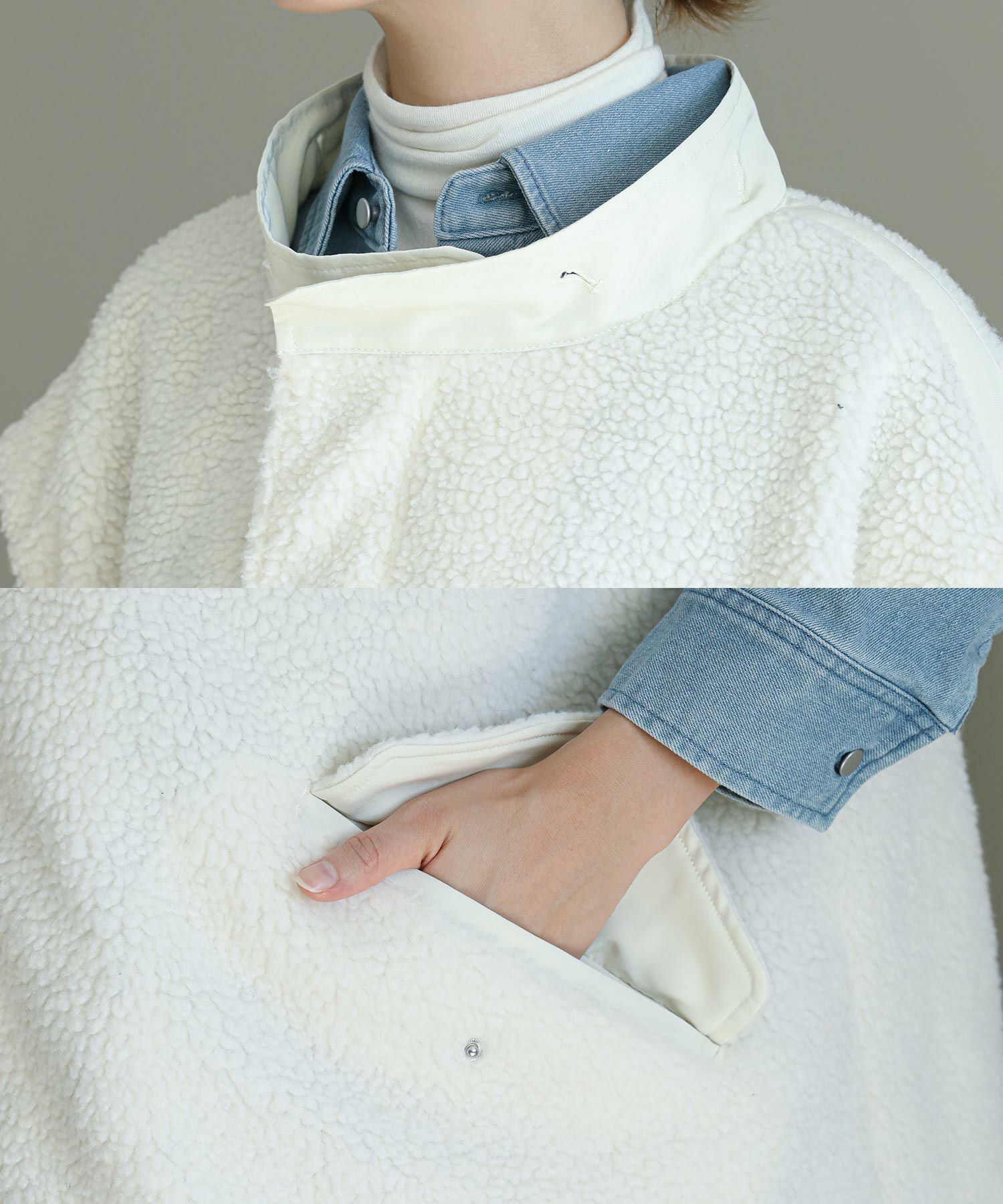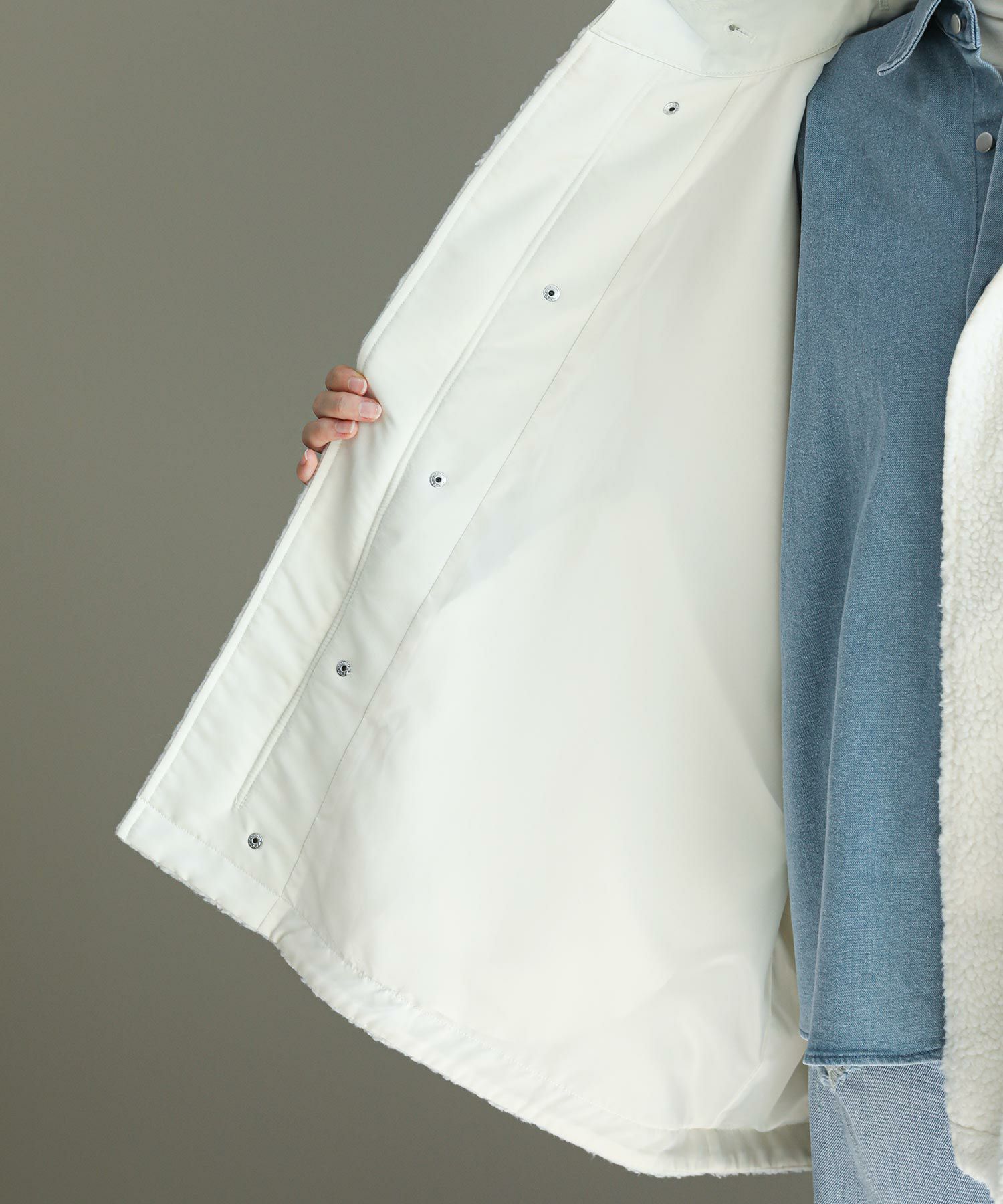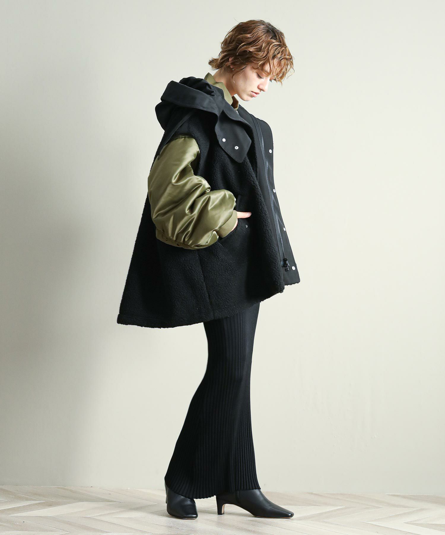 ゆったりとしたサイズ感で厚手のニットやスウェットはもちろん、アウターの上からでも羽織れるデザイン。M65の外付けフードをデザインソースに、しっかり立つ首回りとフードの大きさにこだわり、小顔効果も◎ハリ感のある素材できれいなシルエットを作ります。テーラードジャケットやMA-1の上から羽織るとこなれ感も出ておすすめです。ボアとタフタを同トーンでまとめワーク感が出すぎないようにしています。