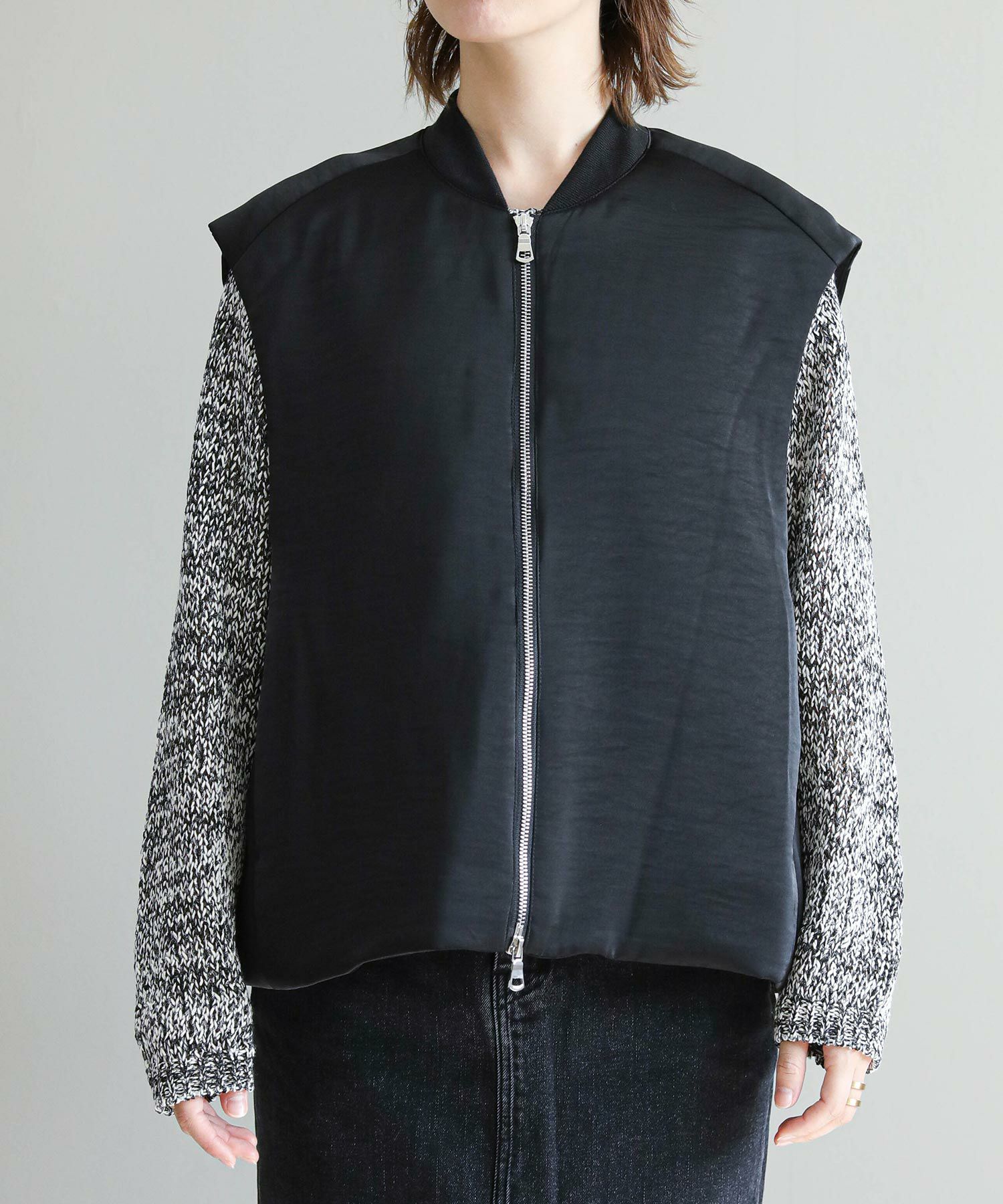 肌寒くなった時にさっと羽織るだけで、今年らしく決まる1枚です。アームも大きめなので、ニットやブルゾンの上にも着ていただける着回しの効くベストです。リブ衿がポイントなのと、裾のドロストでお好みのバルーン感で着用が可能です。ころんとしたフォルムが女性らしく、サテン素材でカジュアルすぎないのも嬉しいポイントです。