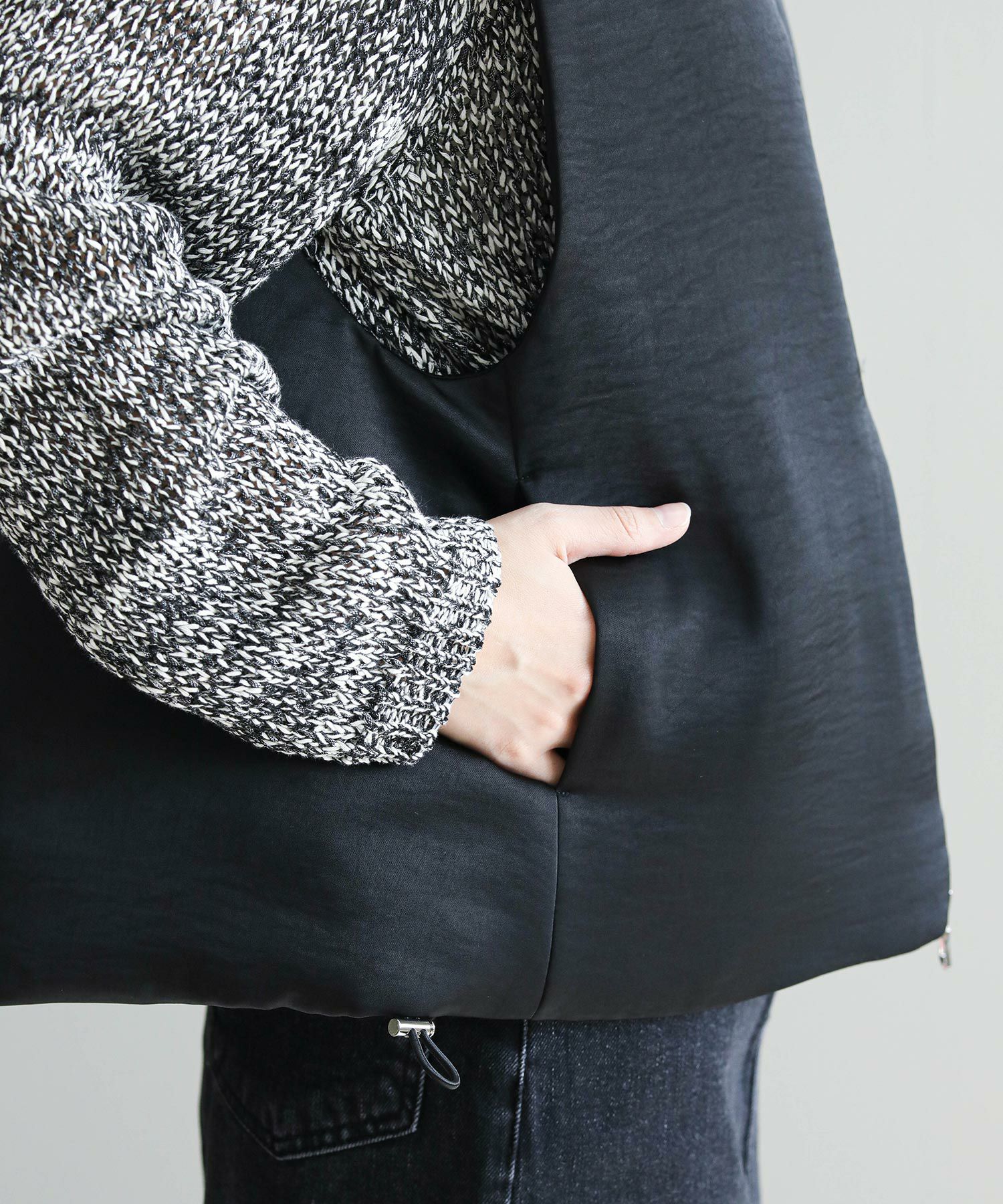 程よい光沢感のサテンを使用した、中綿入りベスト。