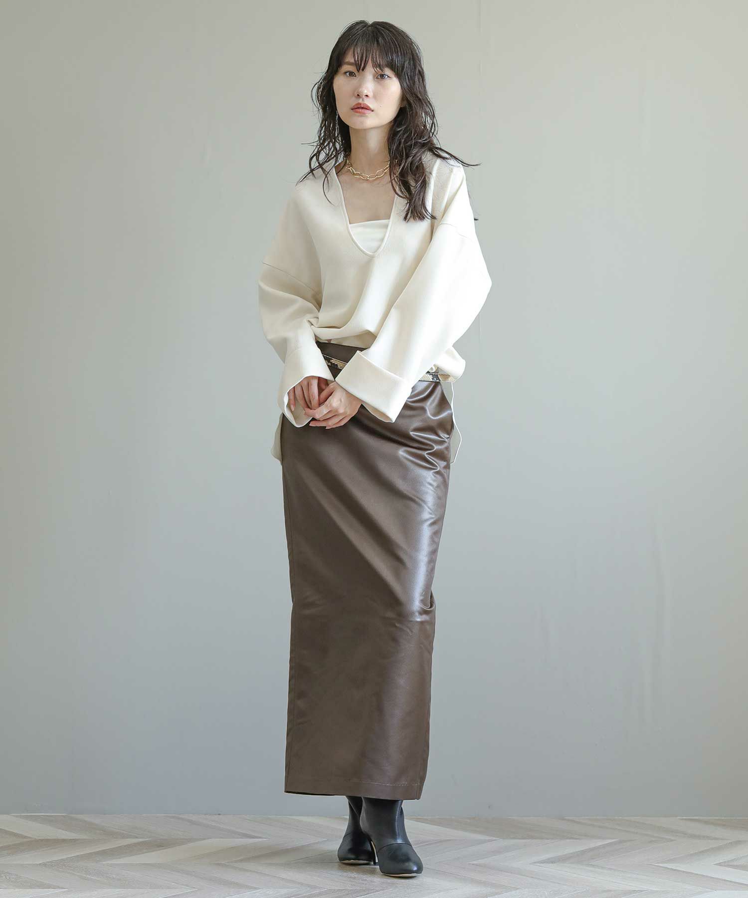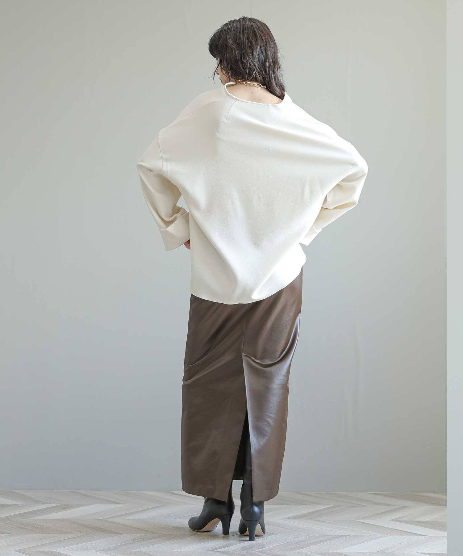 フロントの深いスリットが大人の抜け感をプラスしてくれます。ヒップまで隠れる丈感で、体型カバーにも◎