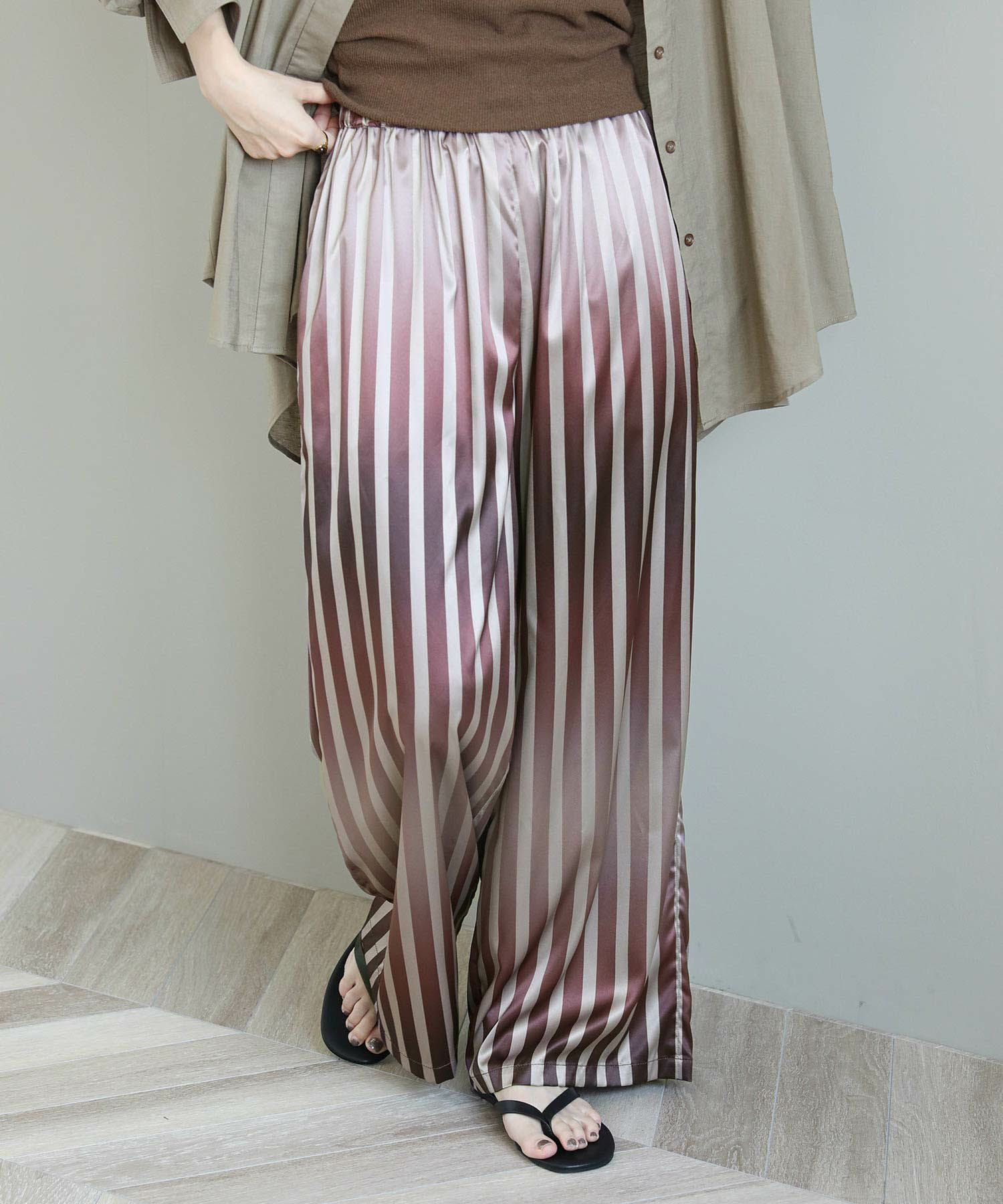 ストライプ柄がすっきりとした縦のラインを強調してくれます。柔らかくしなやかな素材感で脚のラインを自然に拾わないのも嬉しいポイント。上品な光沢感が際立ち女性らしい雰囲気を引き立ててくれます。着心地も良く、華やかなシーンにもデイリーにも使いやすい万能な生地感です。