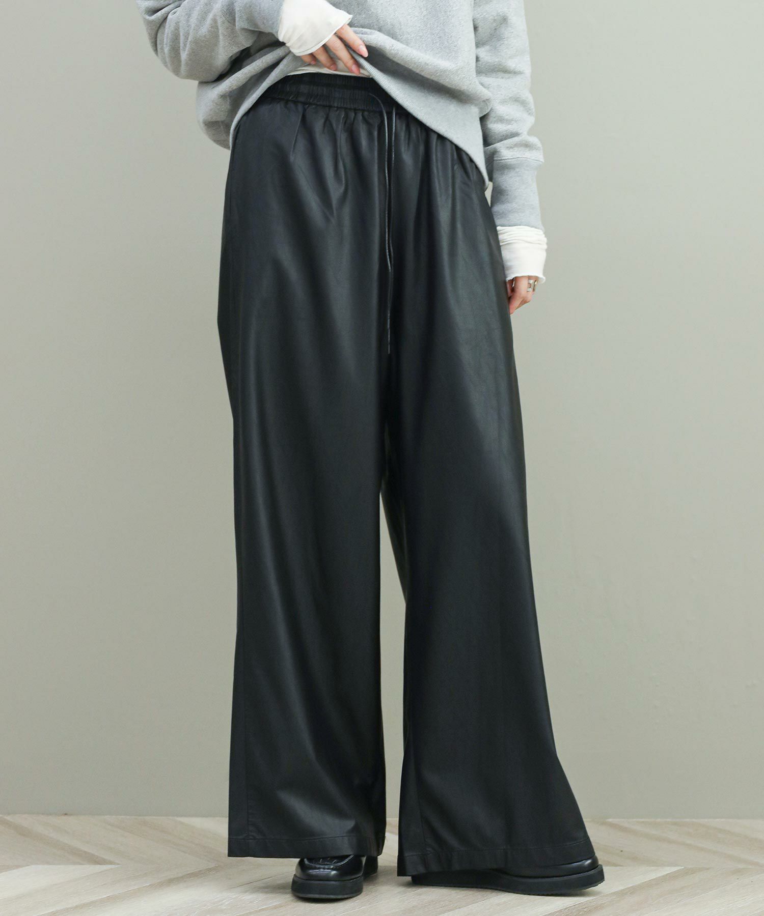 たっぷりのワイドシルエットもポイント。柔らかいフェイクレザーなのでギャザーが入っていても腰回りが張らず、すっきりと着ていただけます。シンプルにスウェットやニットを合わせるだけで、サマになるアイテムです。