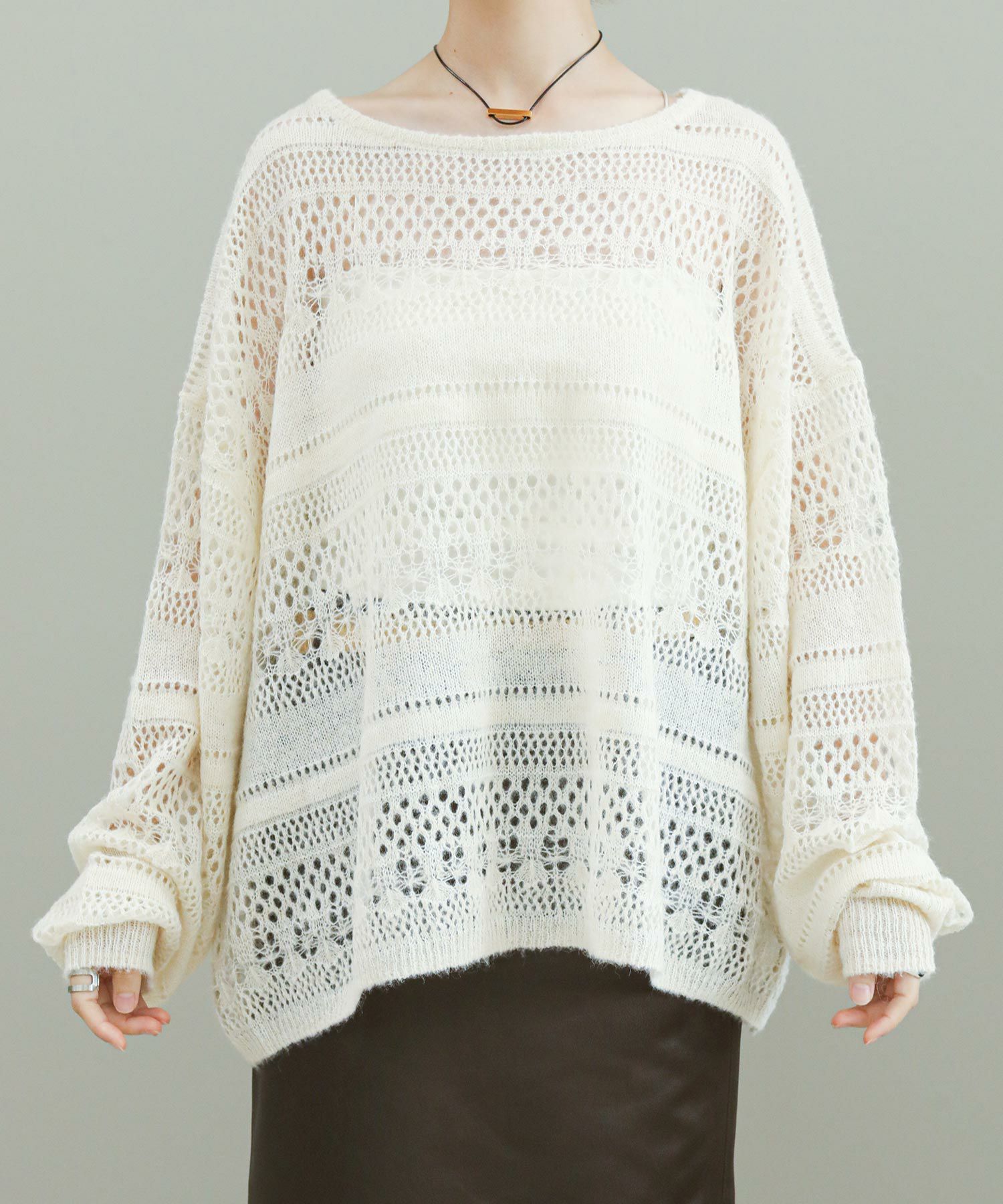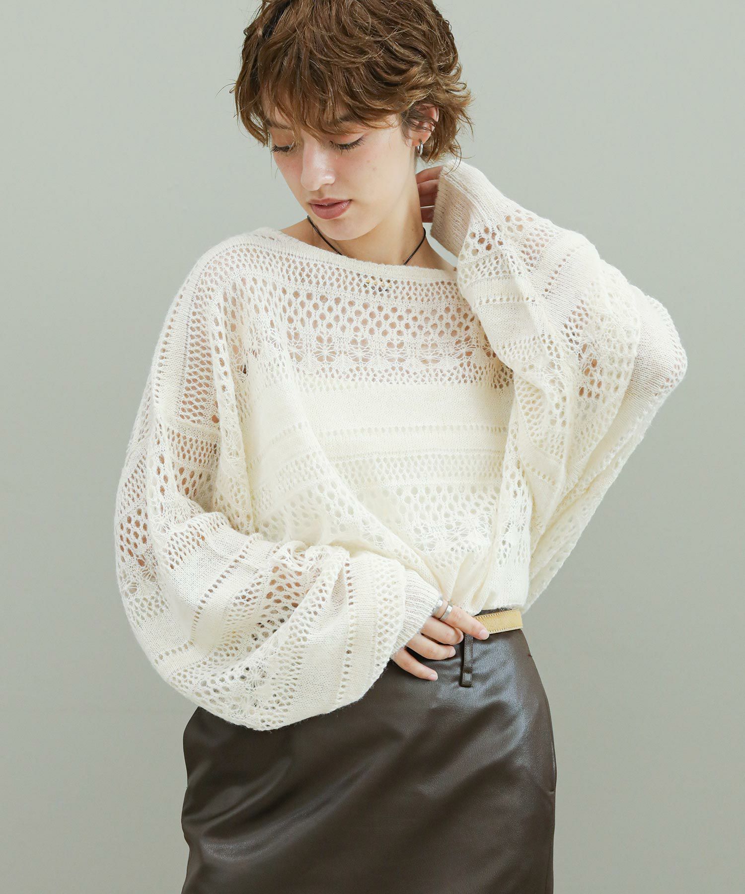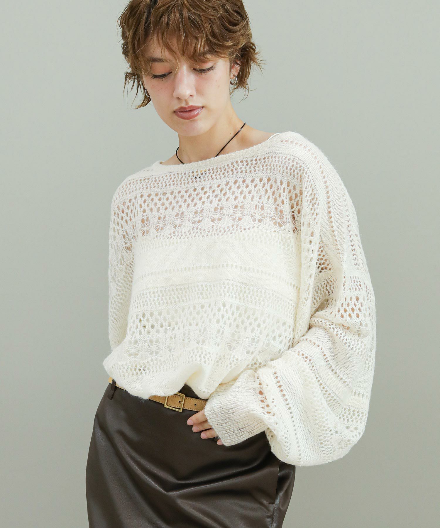 Tシャツやシャツとレイヤードスタイルを楽しめます。繊細なすかし柄が女性らしい雰囲気でデニムスウェットなどカジュアルボトムとも好相性。デコルテをきれいに見せてくれる衿の開きもポイントです。
