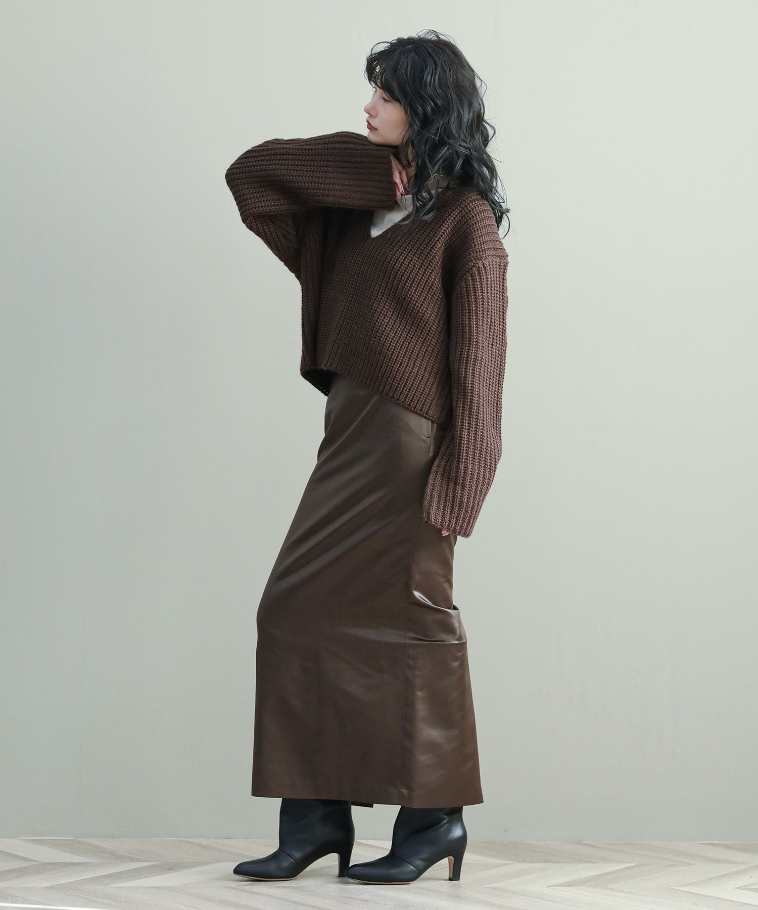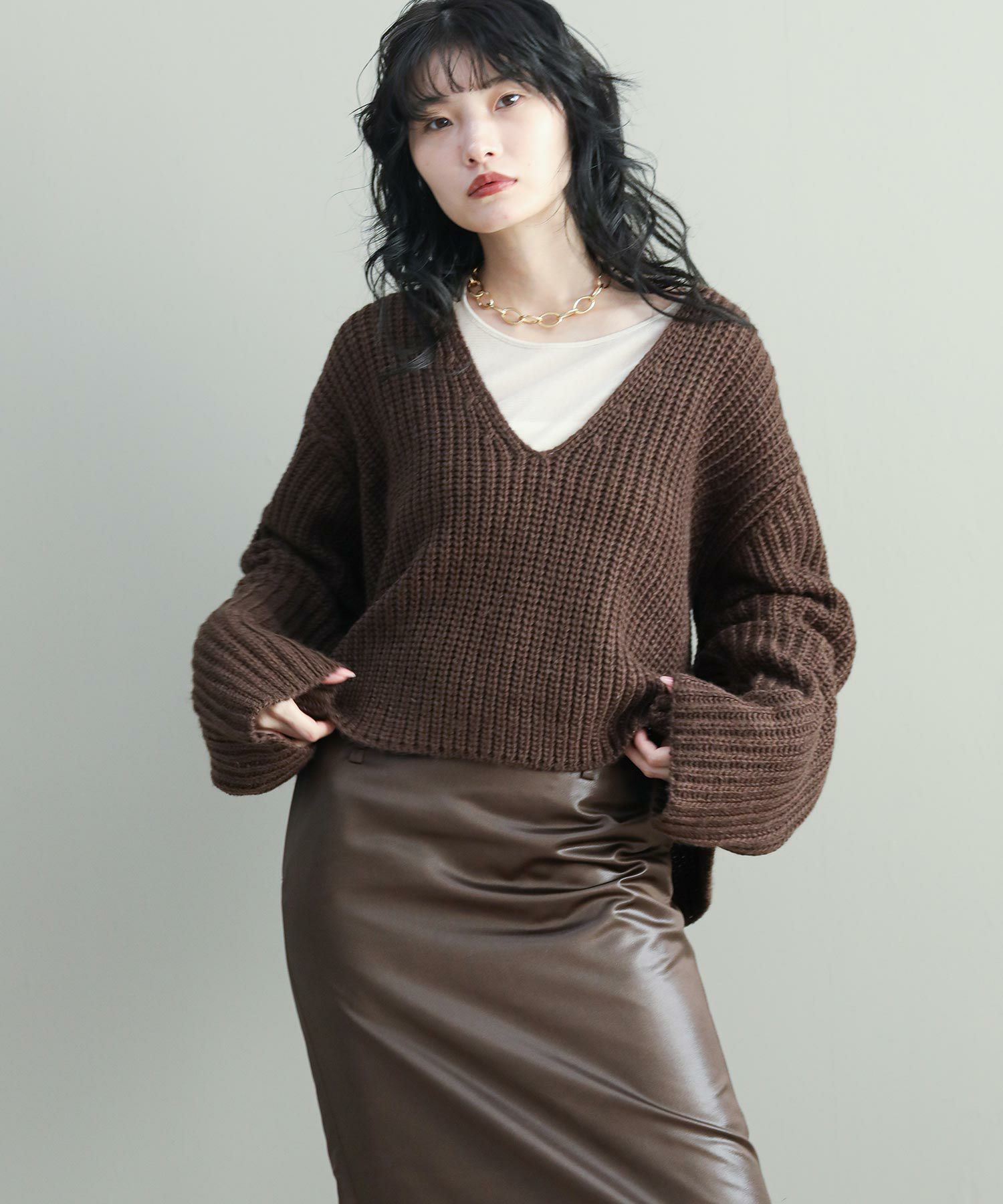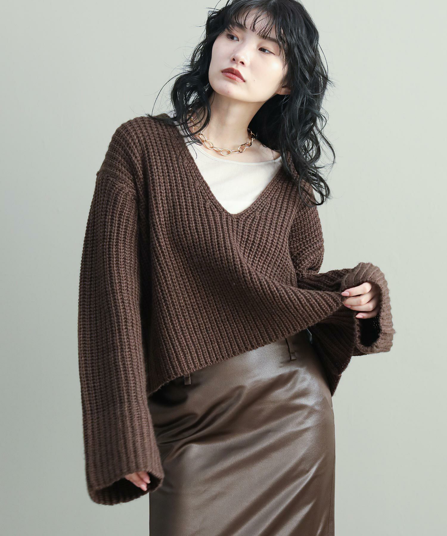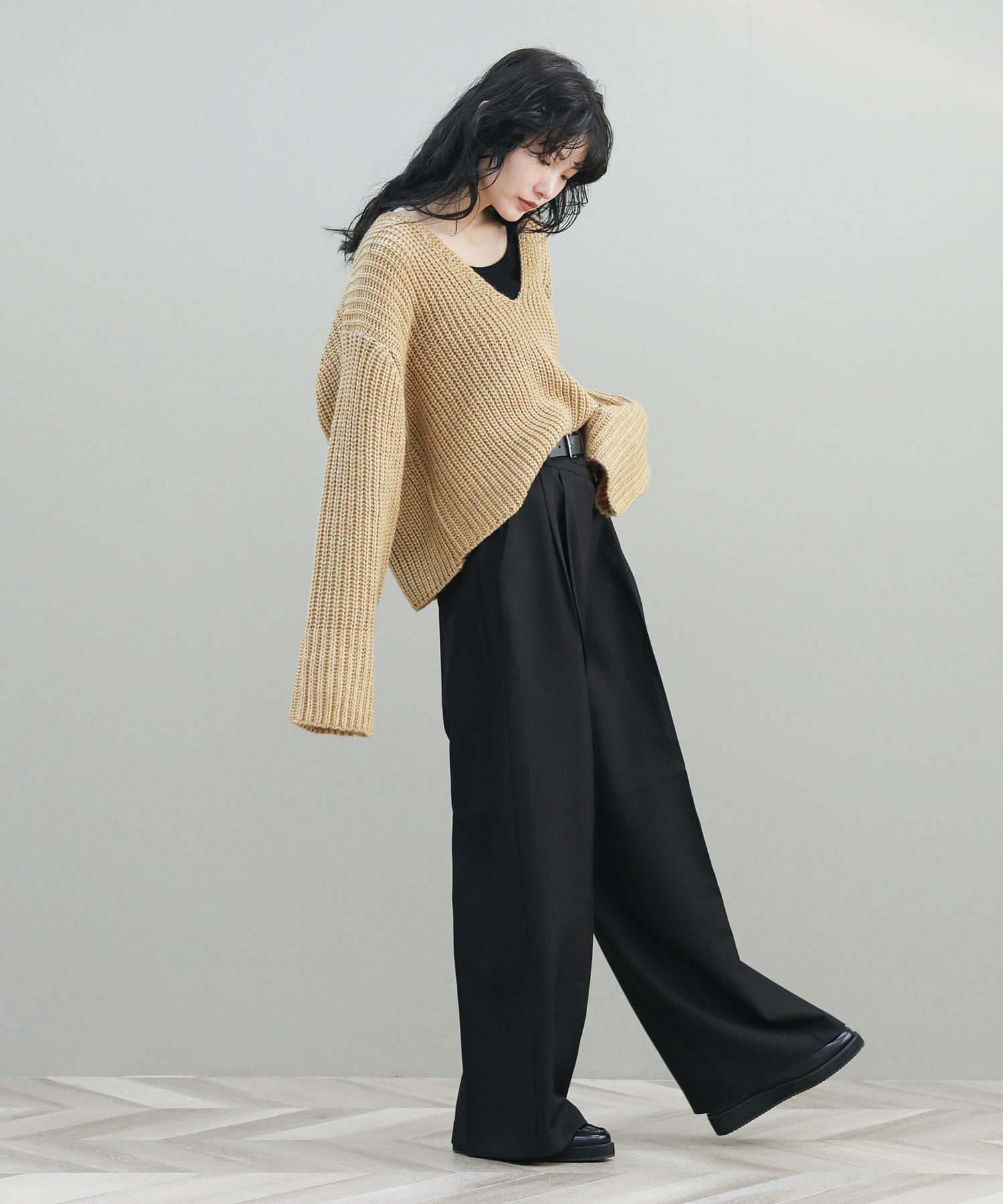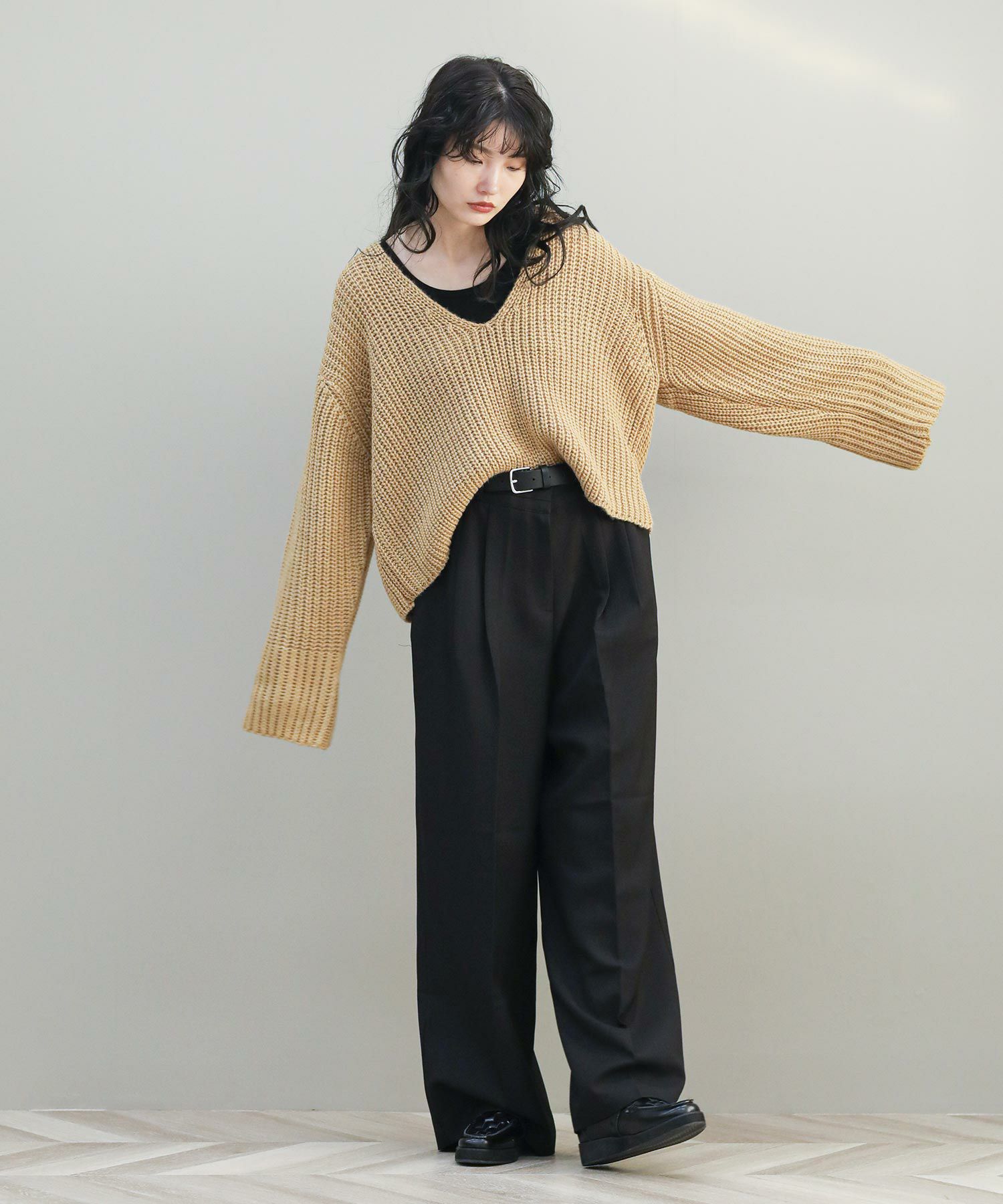 ベーシックな畦ニットですが、幅広の袖やネックラインでトレンド感を出しています。タートルネックやシャツとのレイヤードはもちろん、シンプルにロンTに重ねるだけでもサマになります。