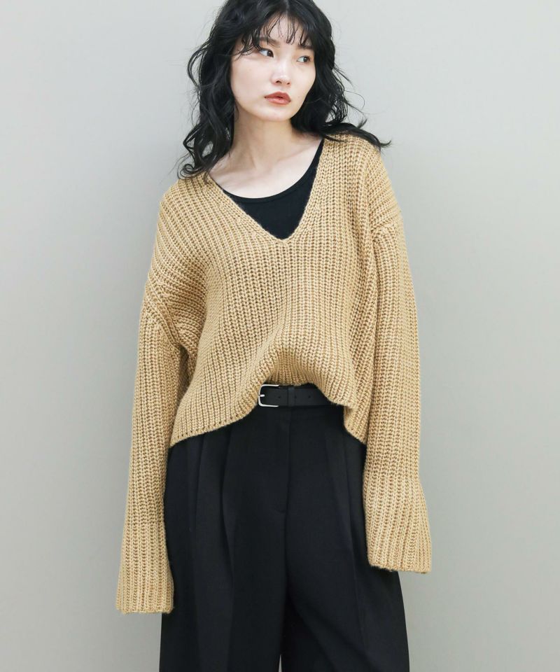 深いVネックデザインがポイントのプルオーバーニット。