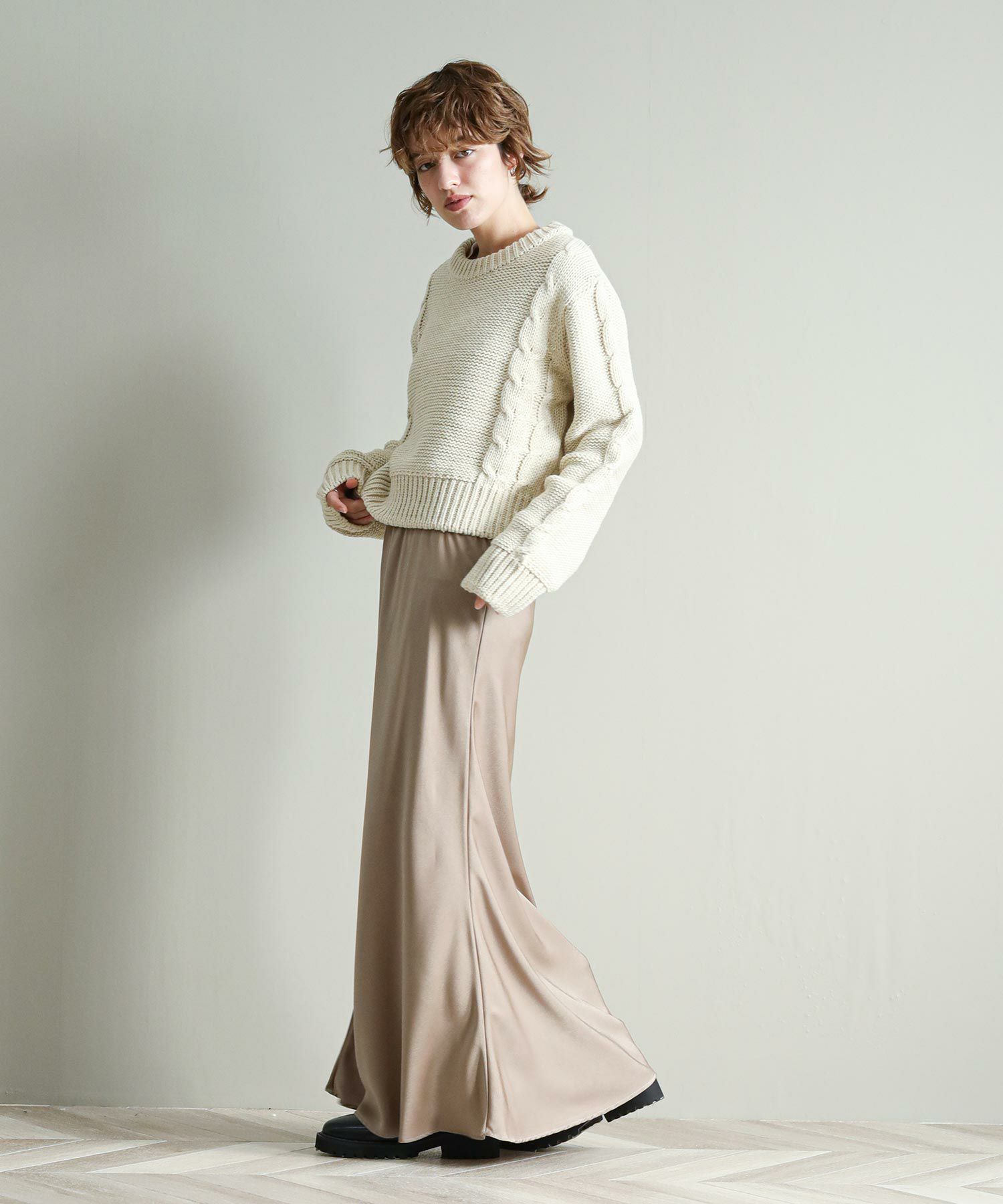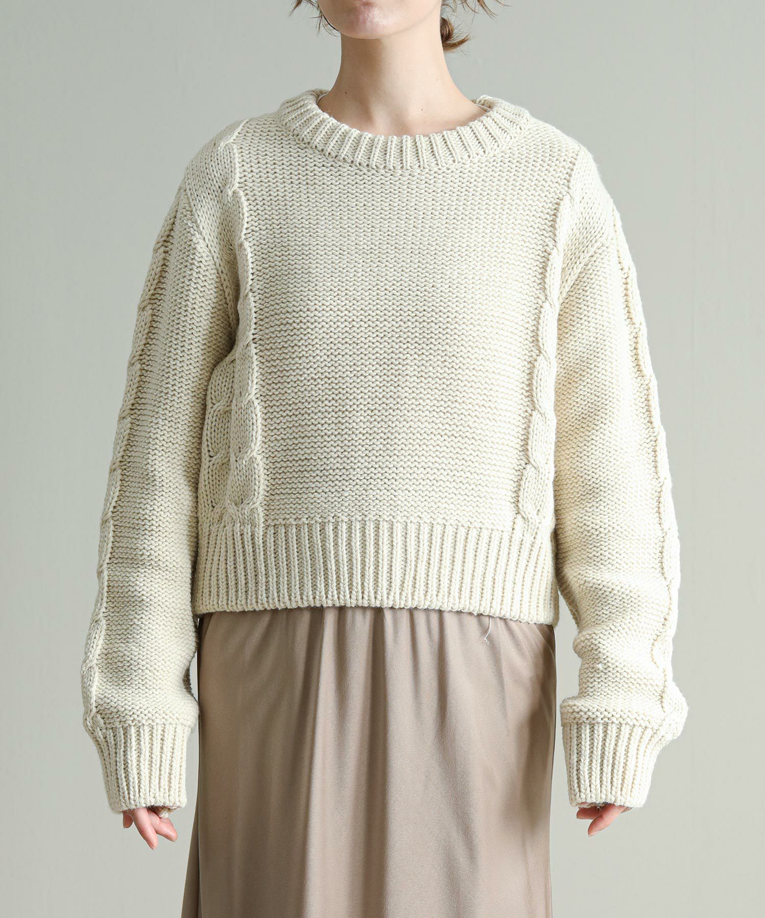 背中の開きとレースアップのリボンがポイントに。シンプルなボトムと合わせてもサマになります。袖のケーブルのさりげないアクセントに。タートネックやシャツはもちろん、シアーのインナーをレイヤードするのもおしゃれ感アップ◎
