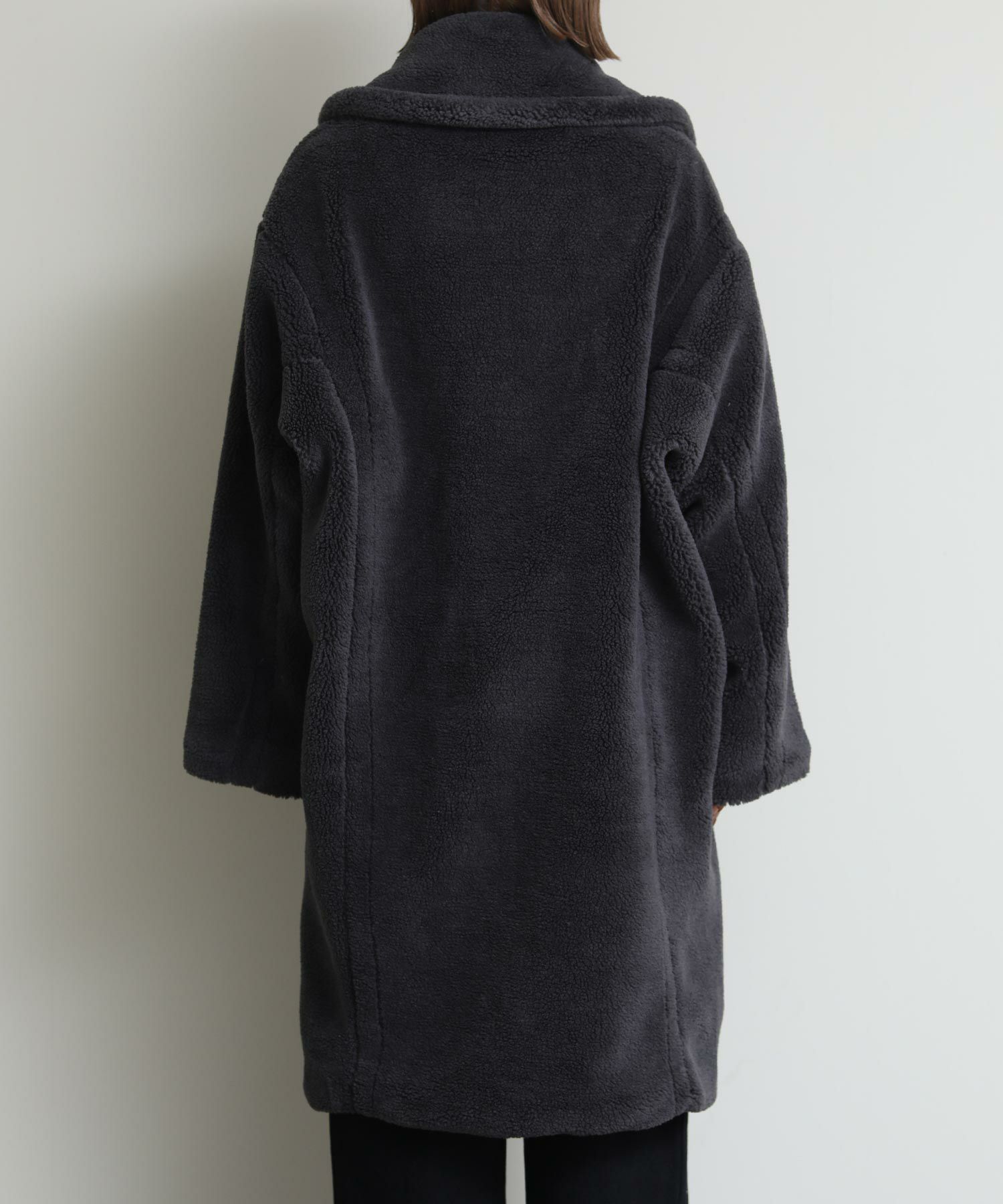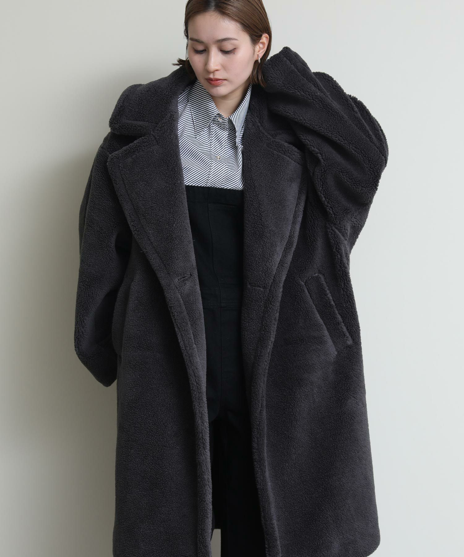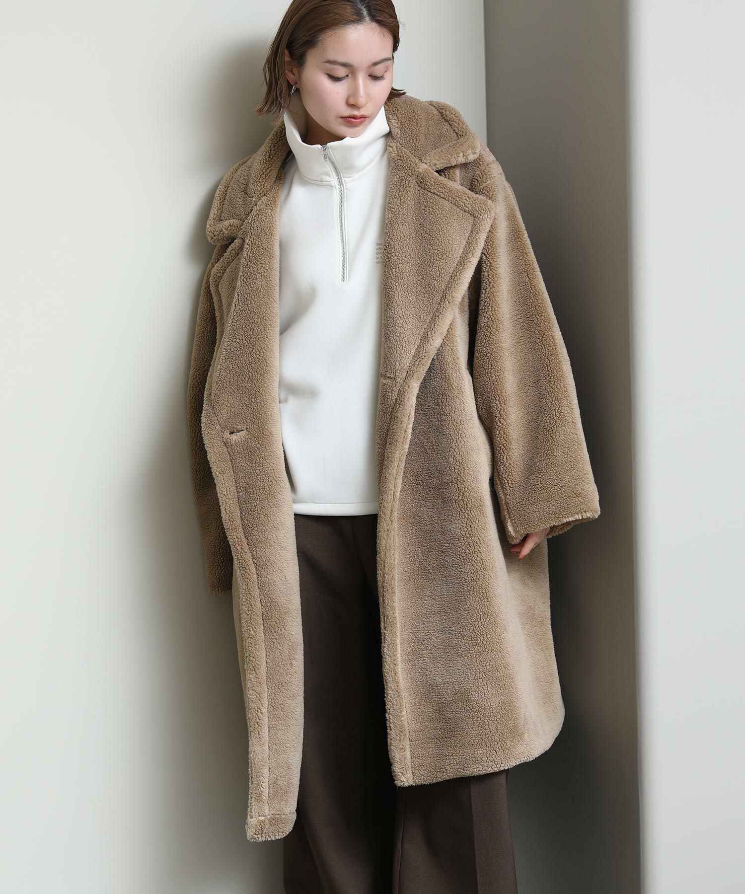 テディベアのようなミニボアを使用したロングコート。