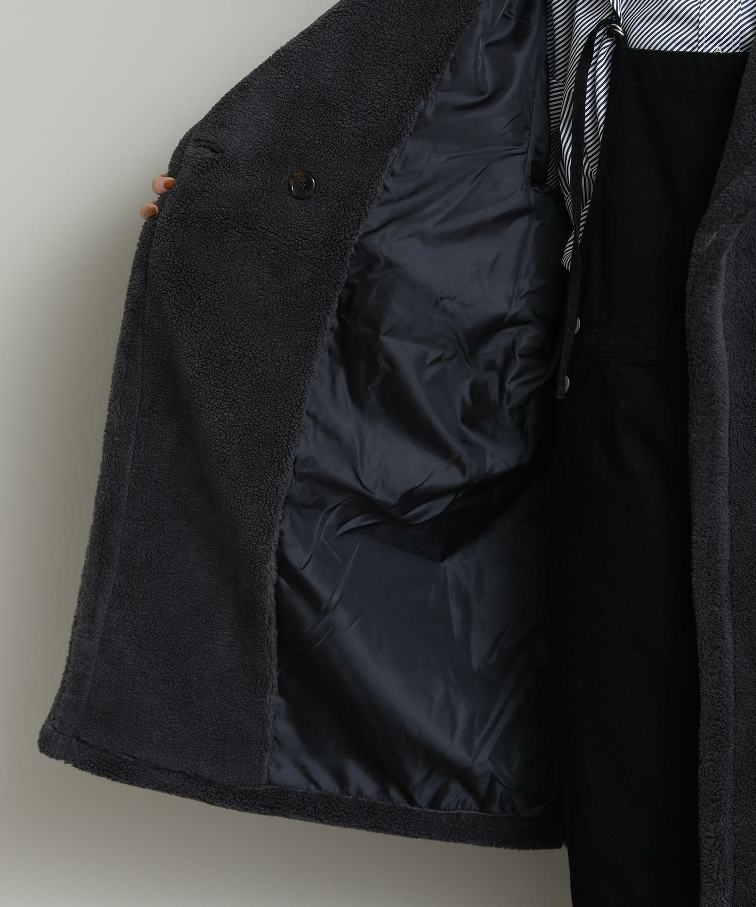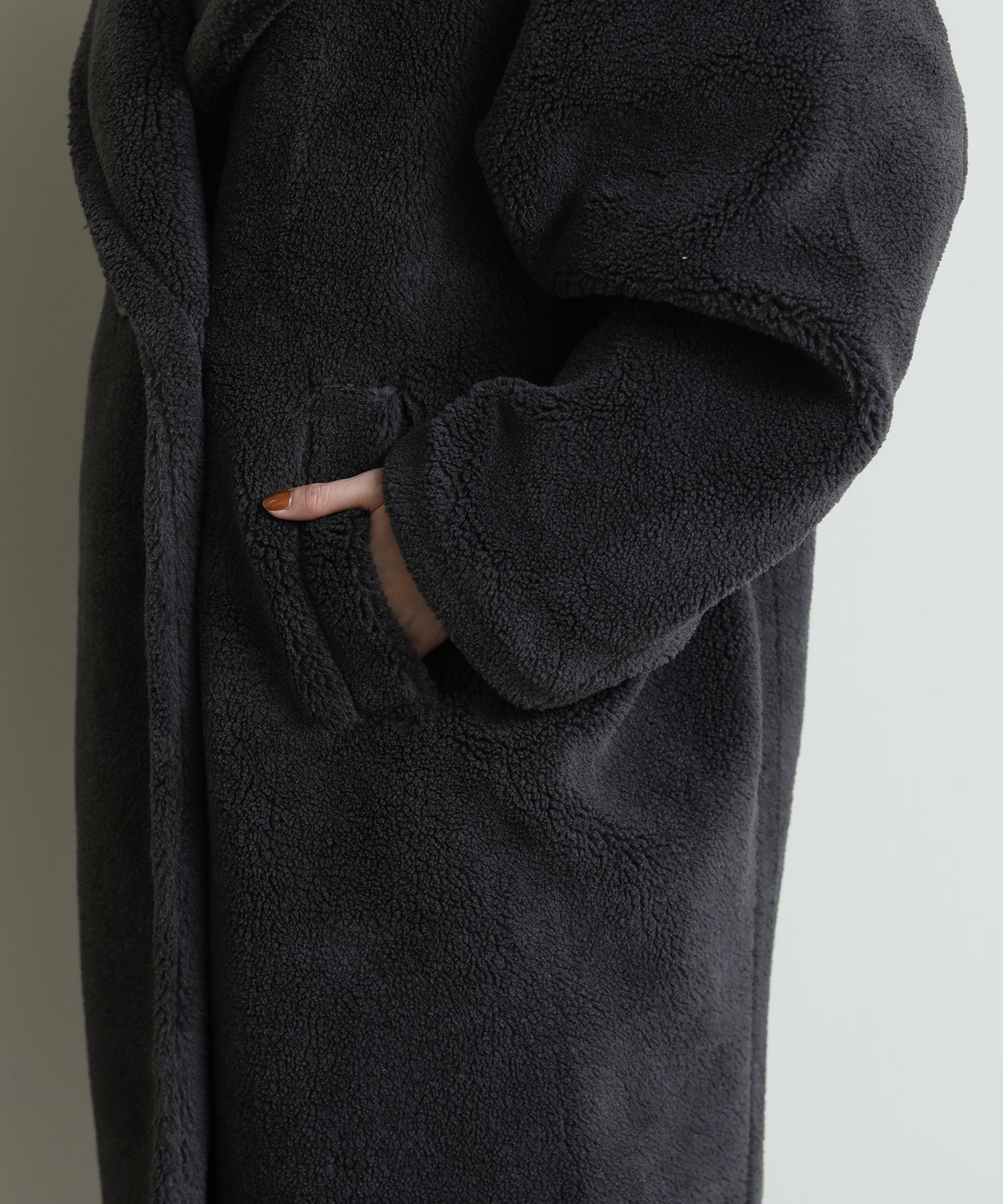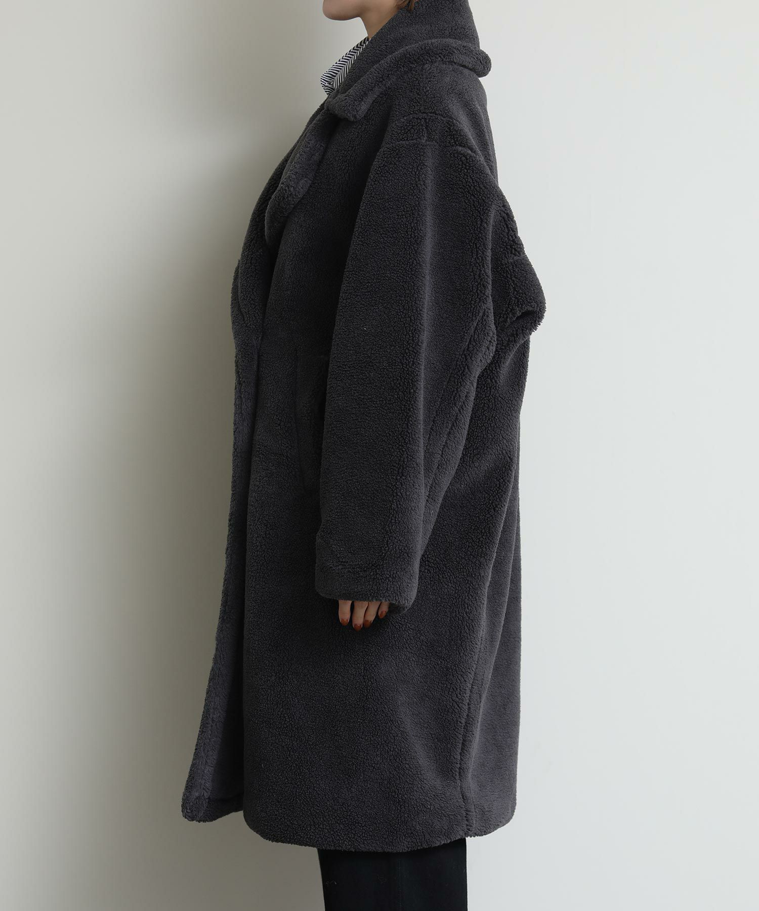 テディベアのようなミニボアを使用したロングコート。