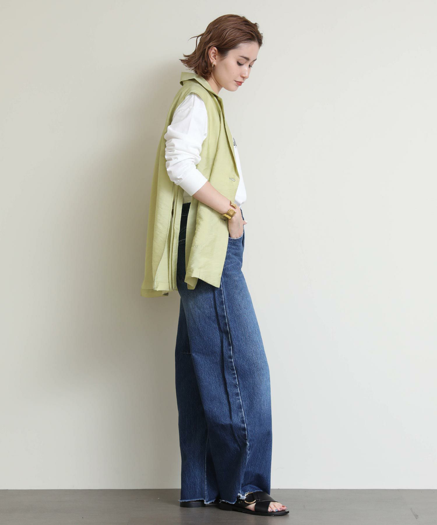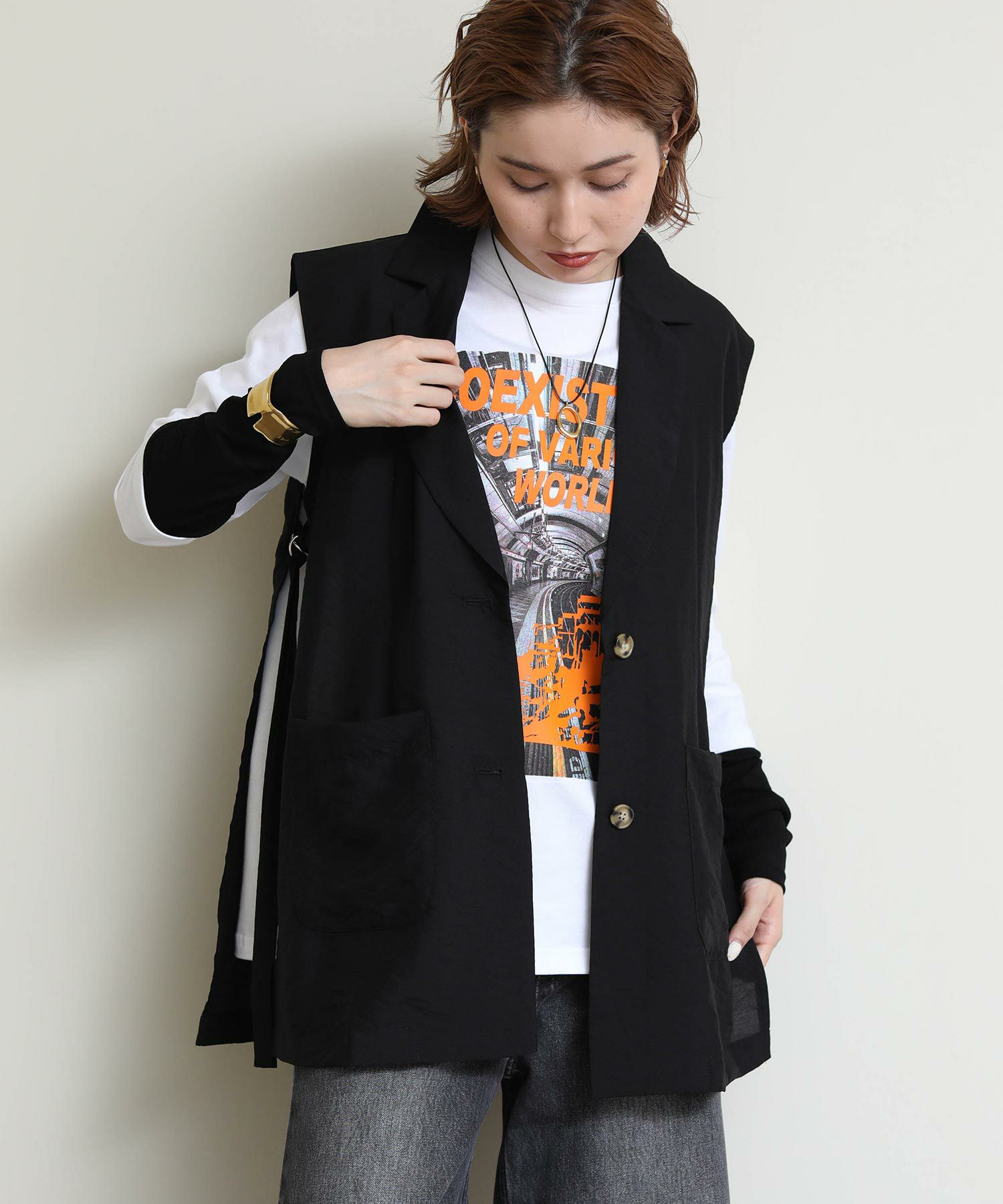 両サイドのバックルがポイントのジレ。