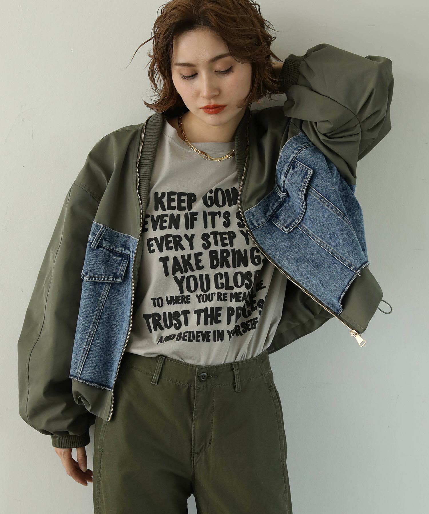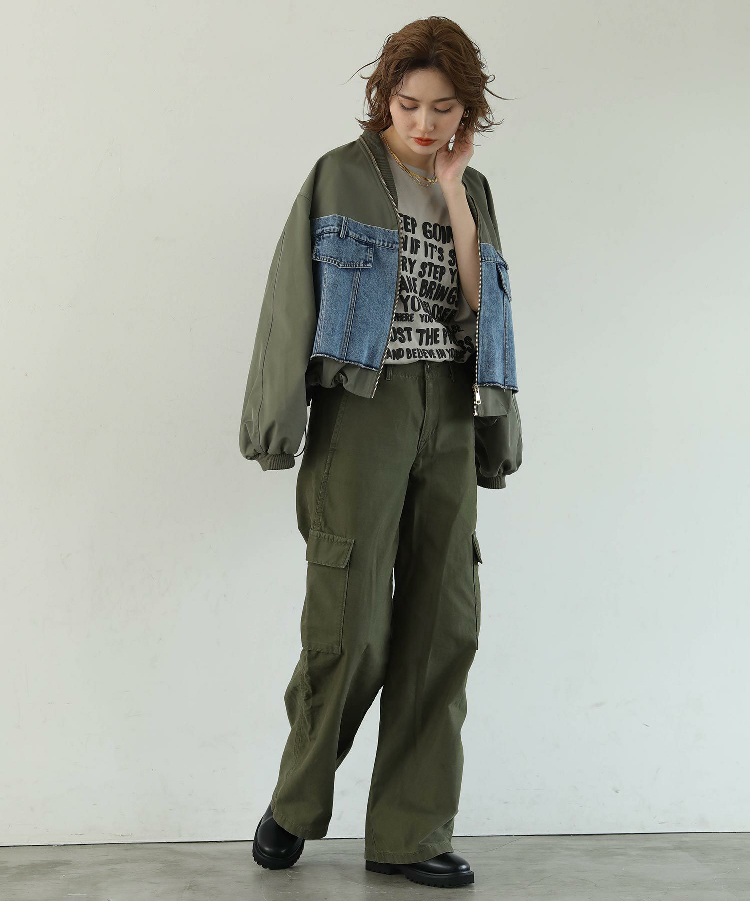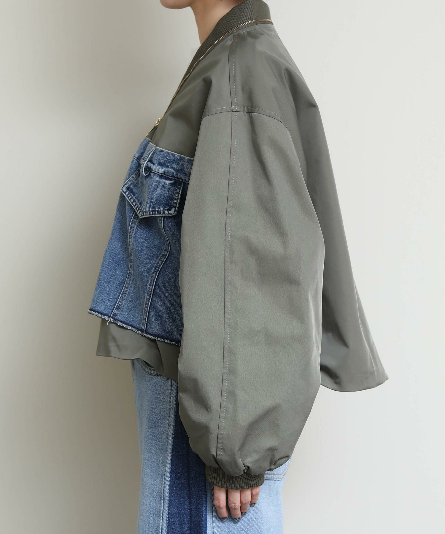 MA-1風のミリタリーテイストのブルゾンで、袖がバルーン使用になっているのでより女性らしいシルエットになっています。