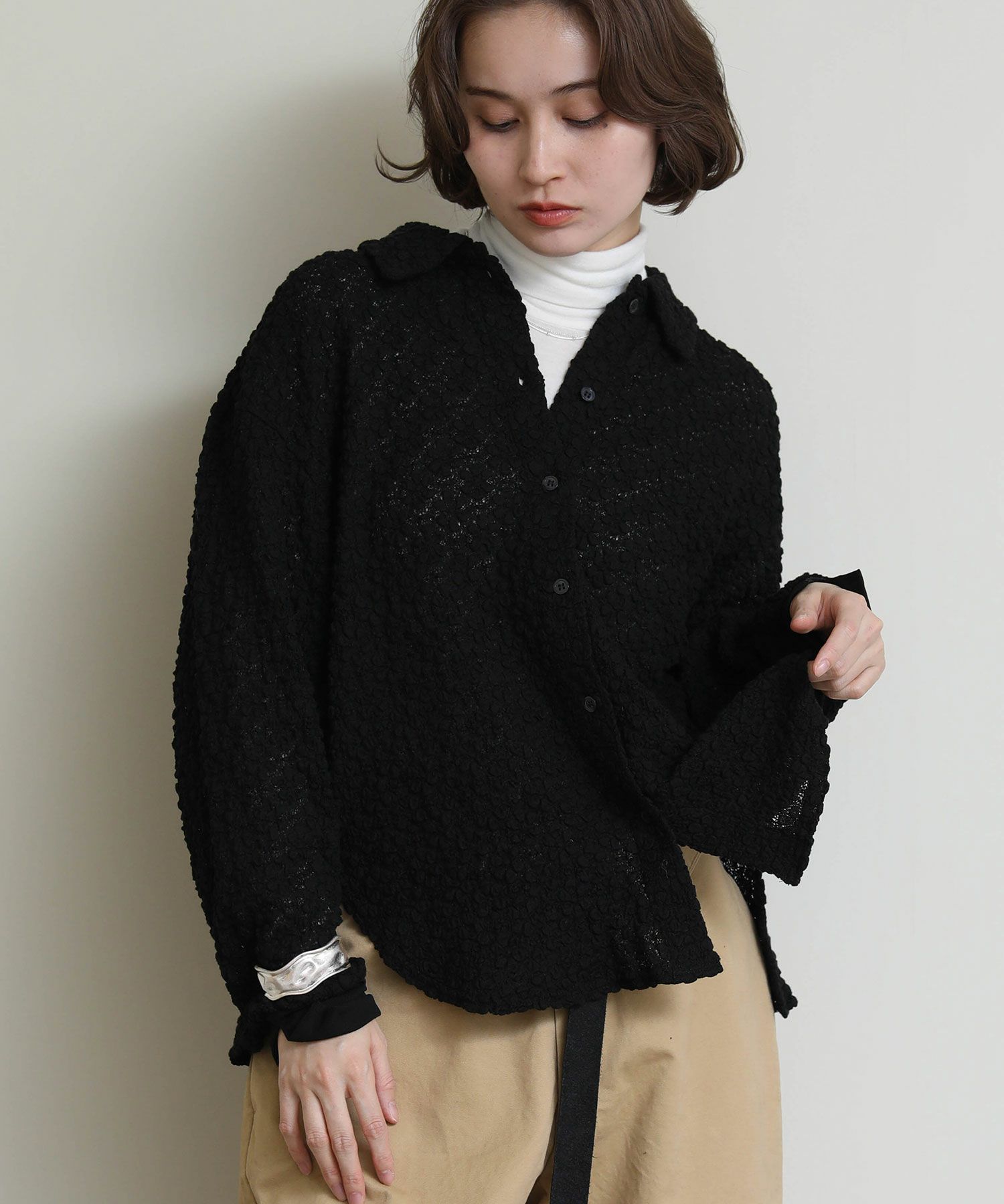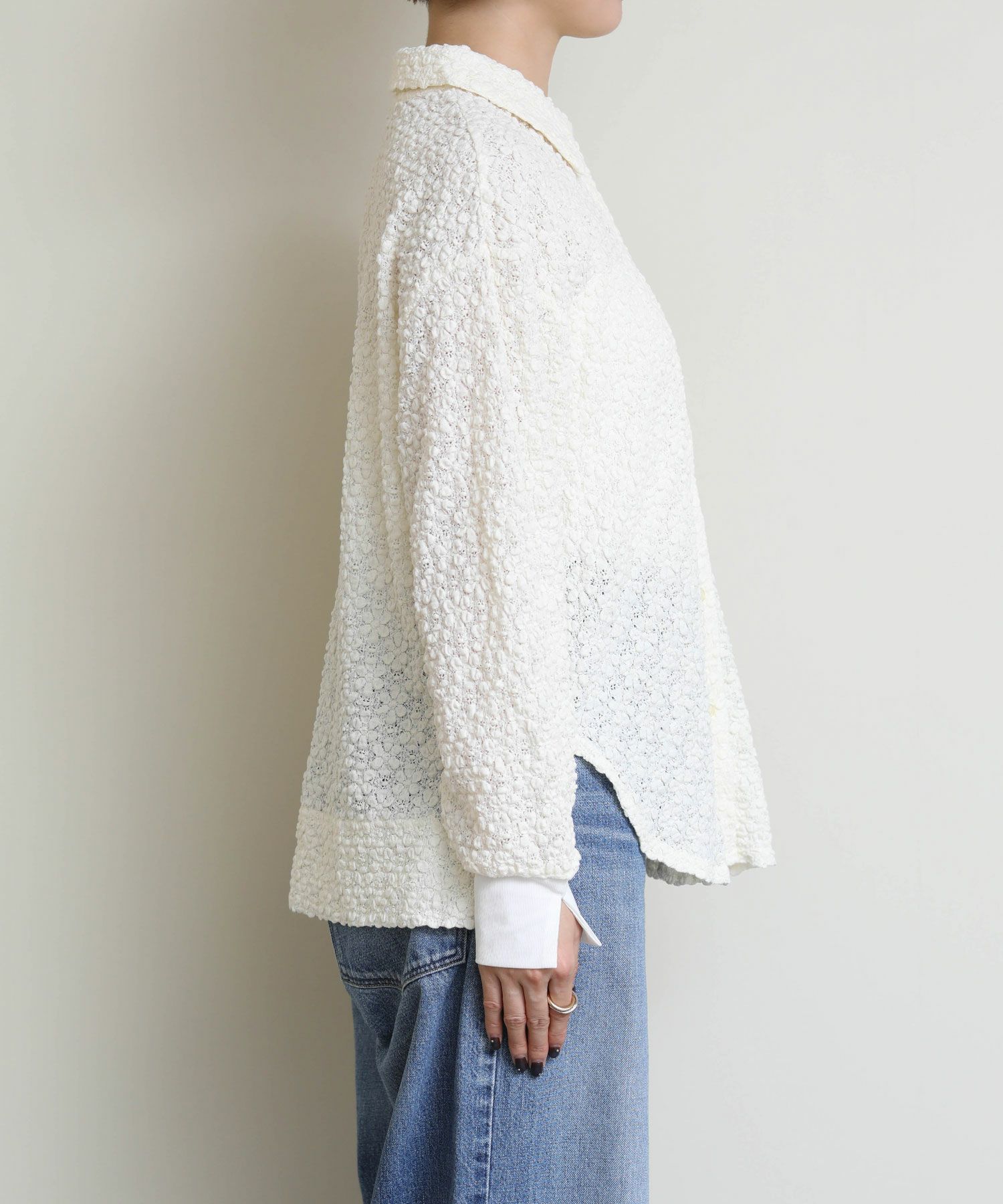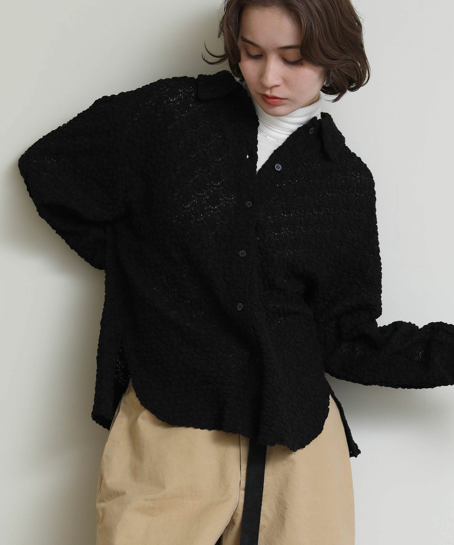立体的なフラワーモチーフのデザインに包まれた、エレガントな魅力を放ちつつもカジュアルにも綺麗目にも着回しできるロングスリーブシャツが登場。
