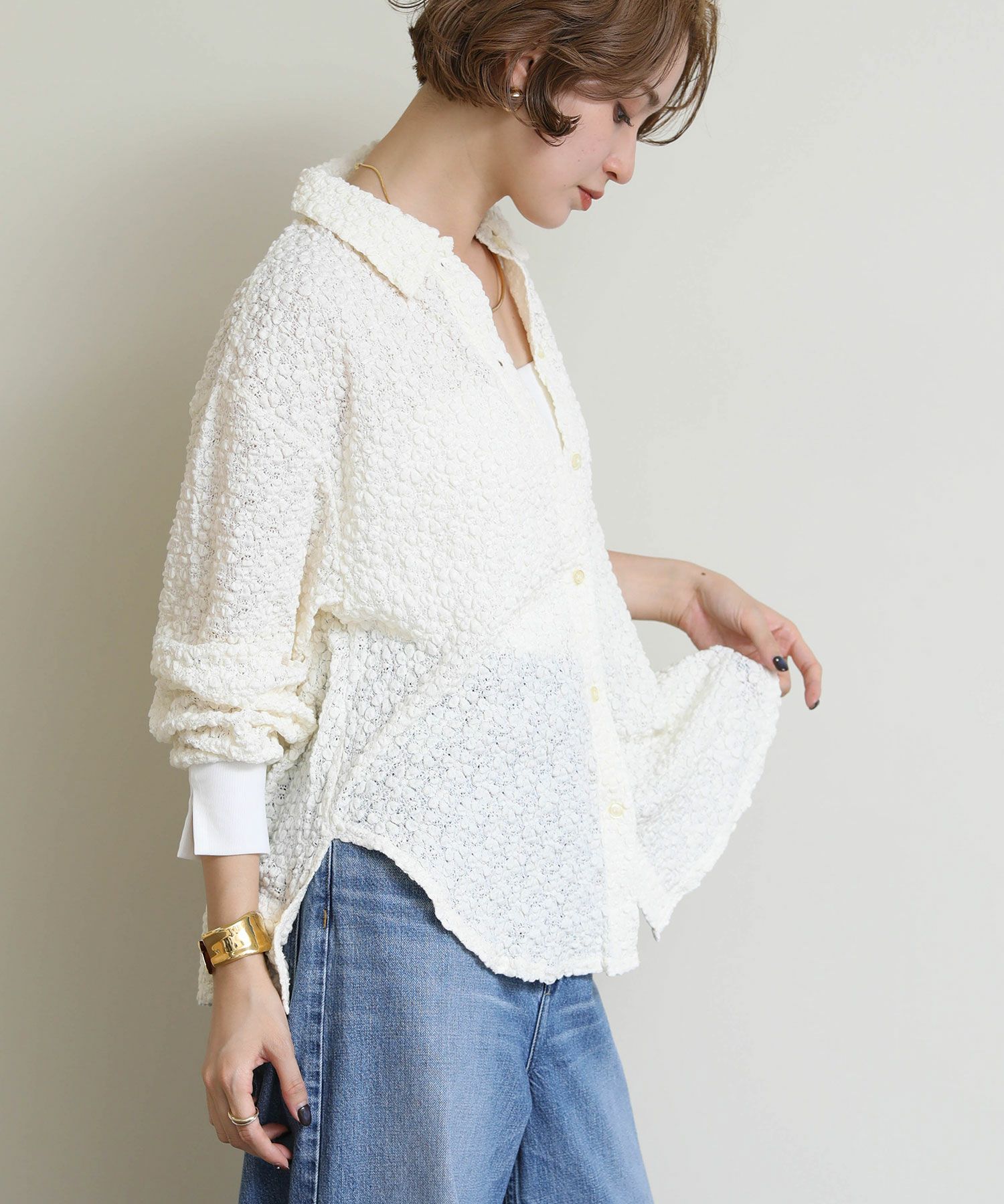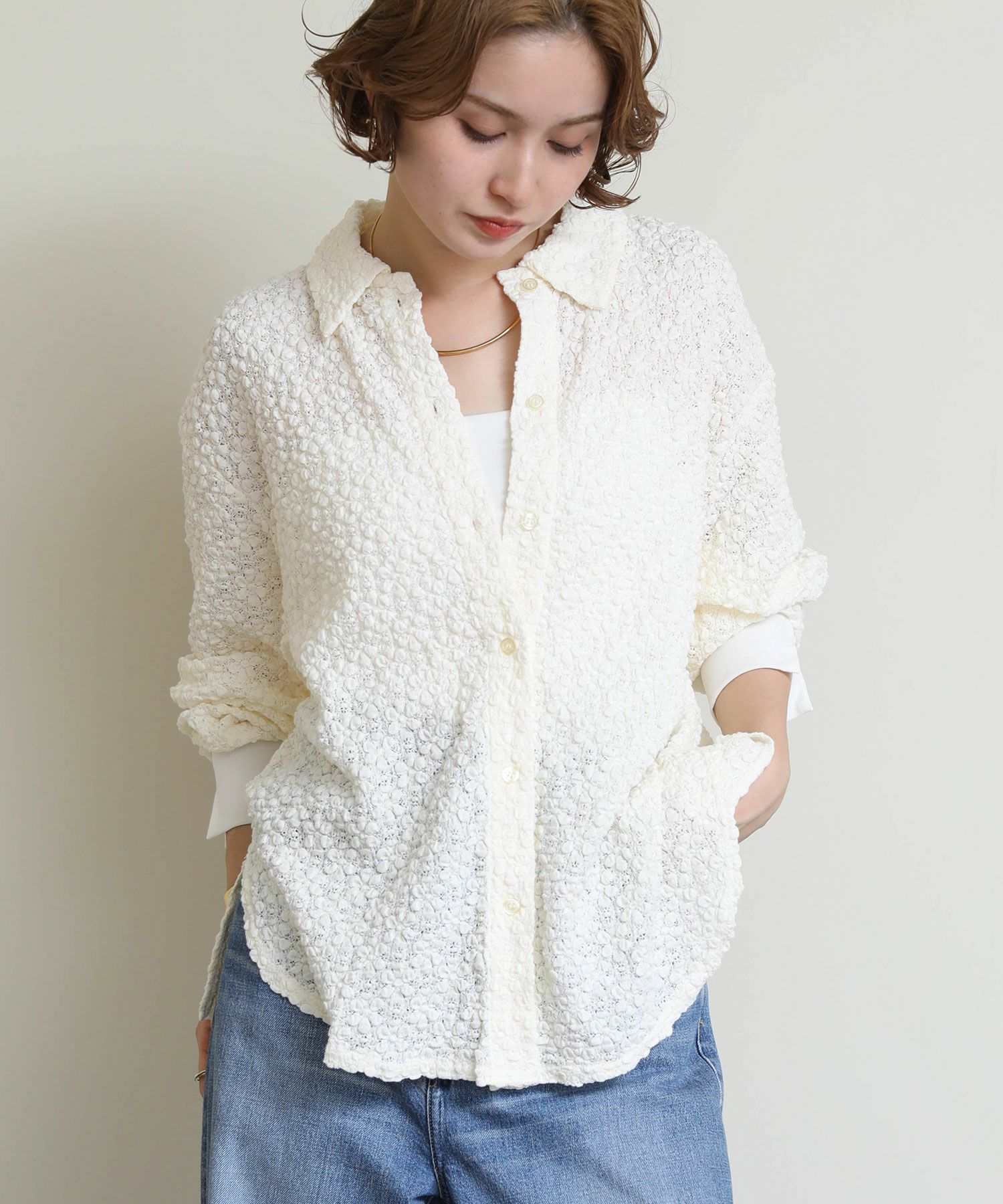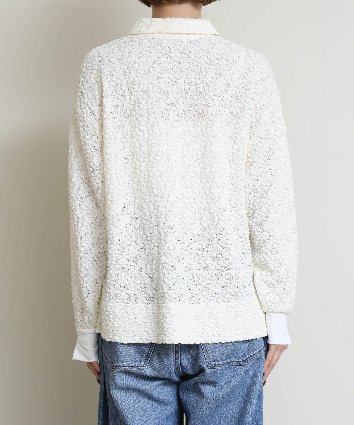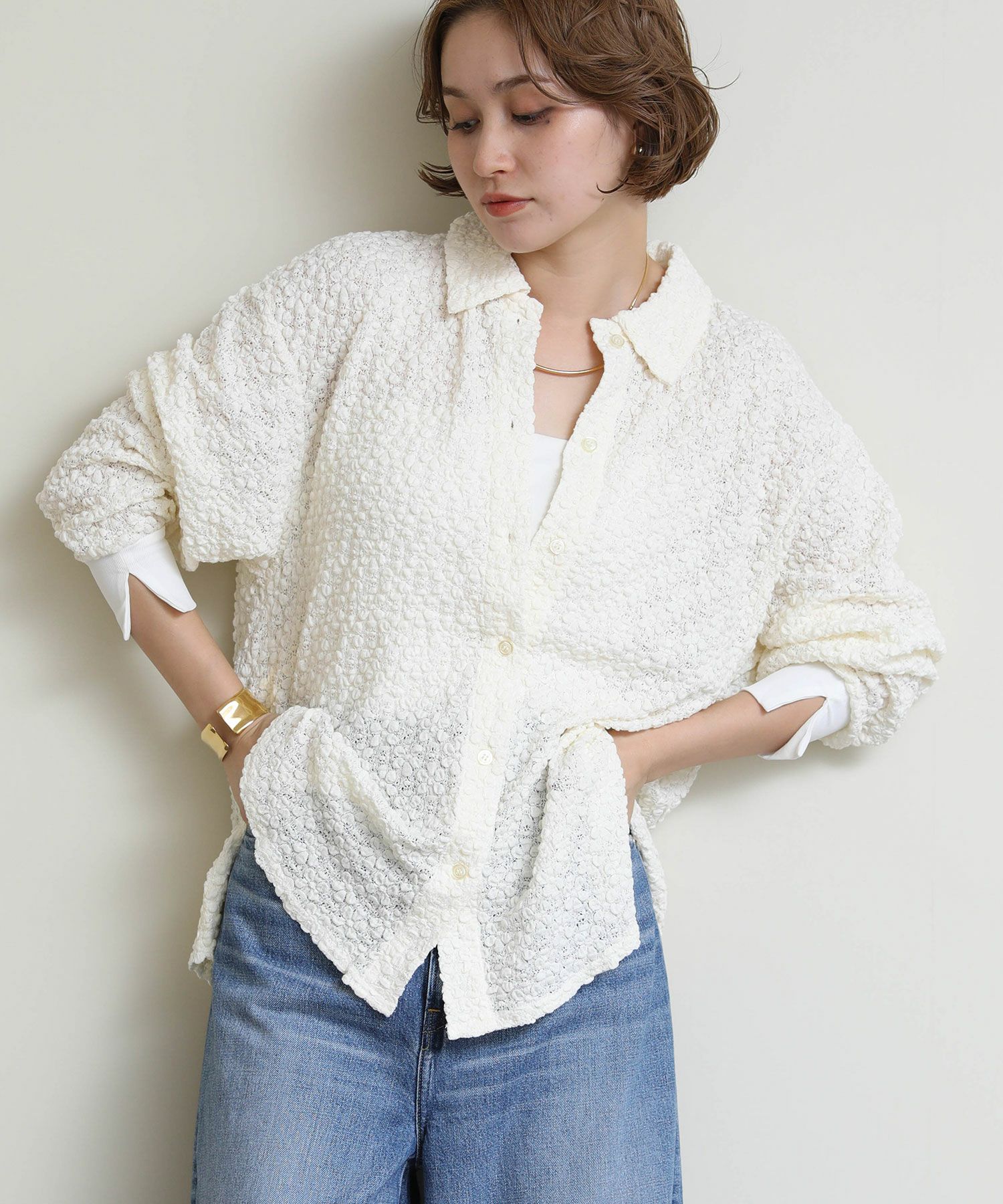 立体的なフラワーモチーフのデザインに包まれた、エレガントな魅力を放ちつつもカジュアルにも綺麗目にも着回しできるロングスリーブシャツが登場。