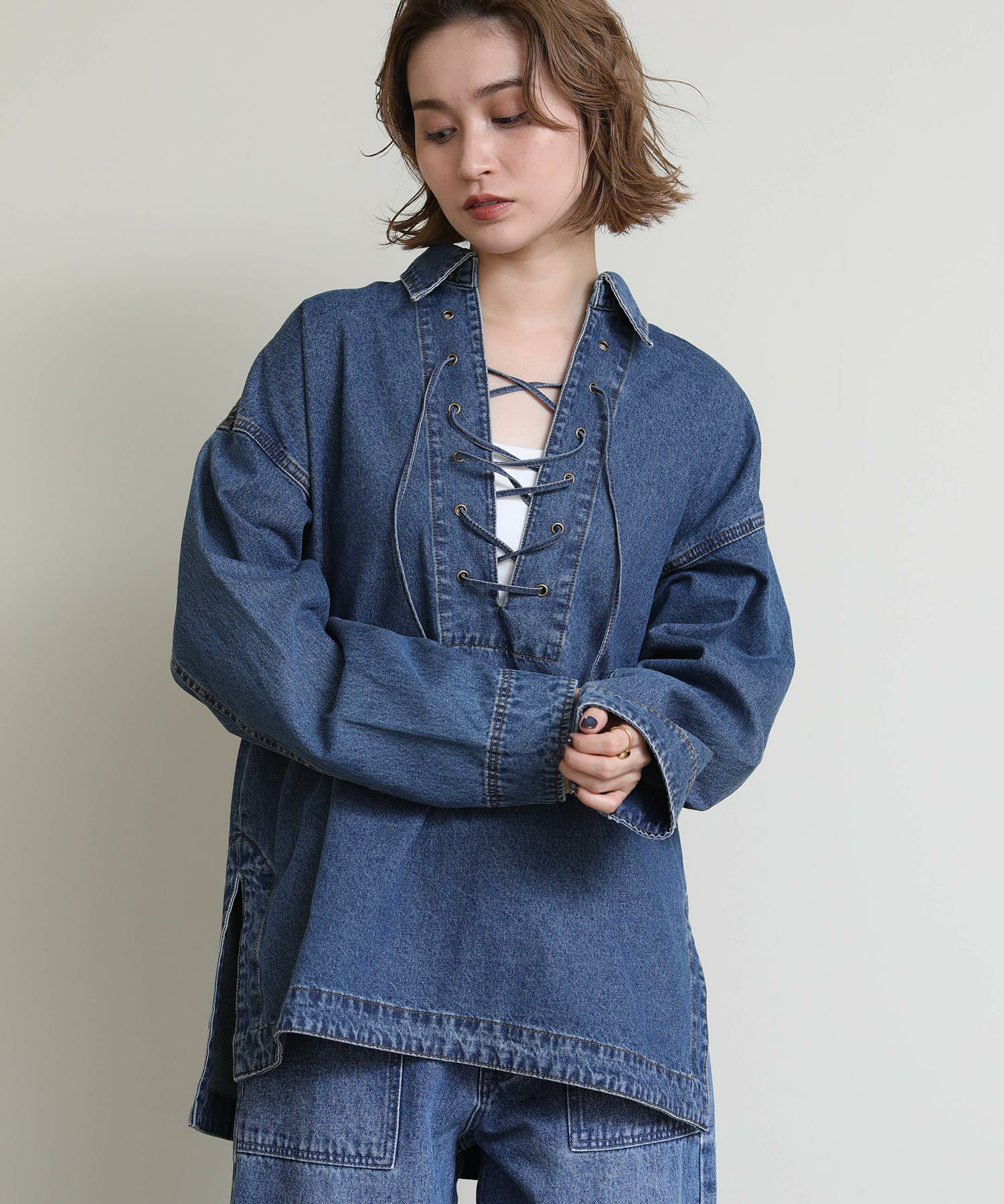 フロントのレースアップデザインがアクセントとなり1枚で着映えが叶うのも嬉しい一着。