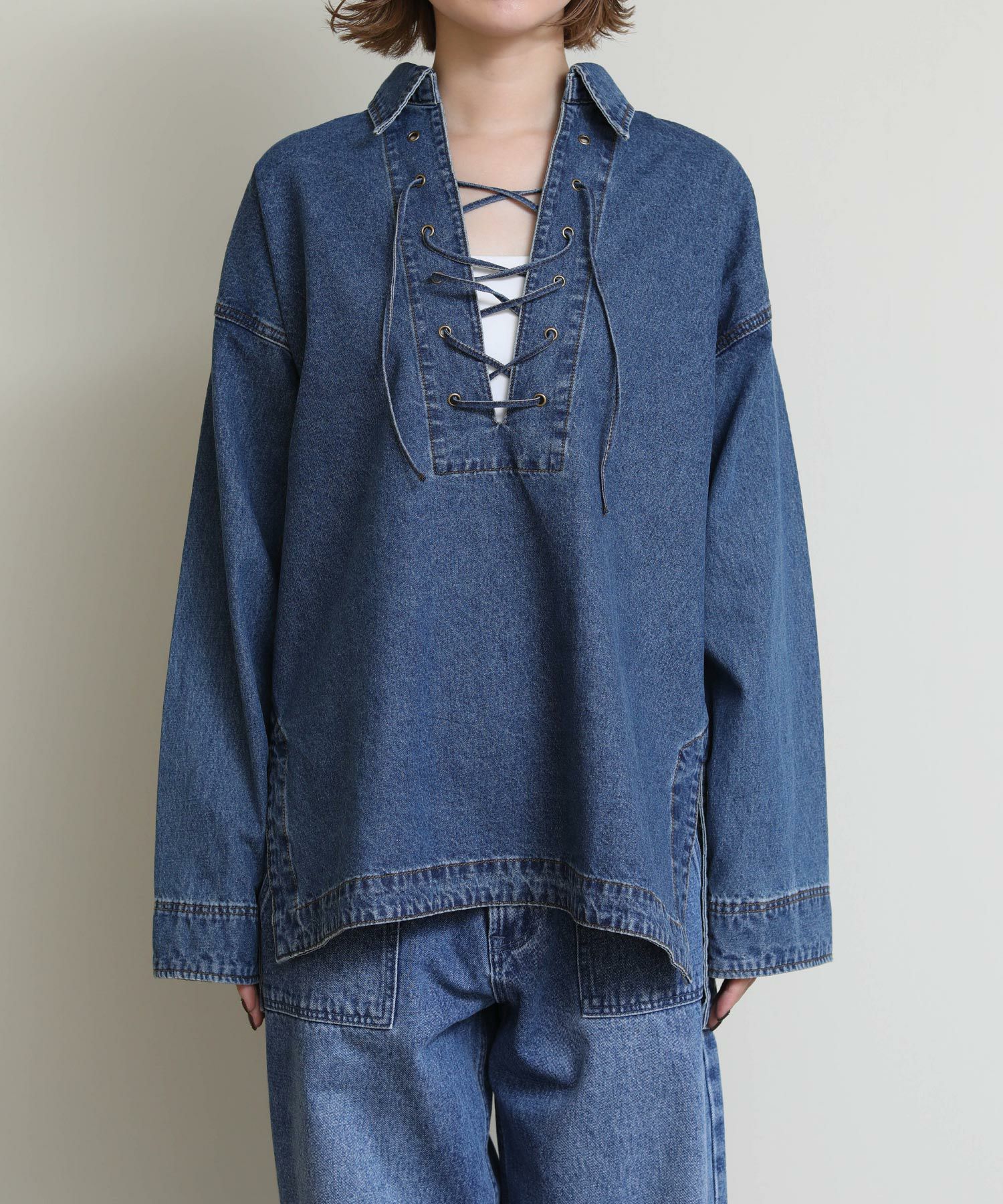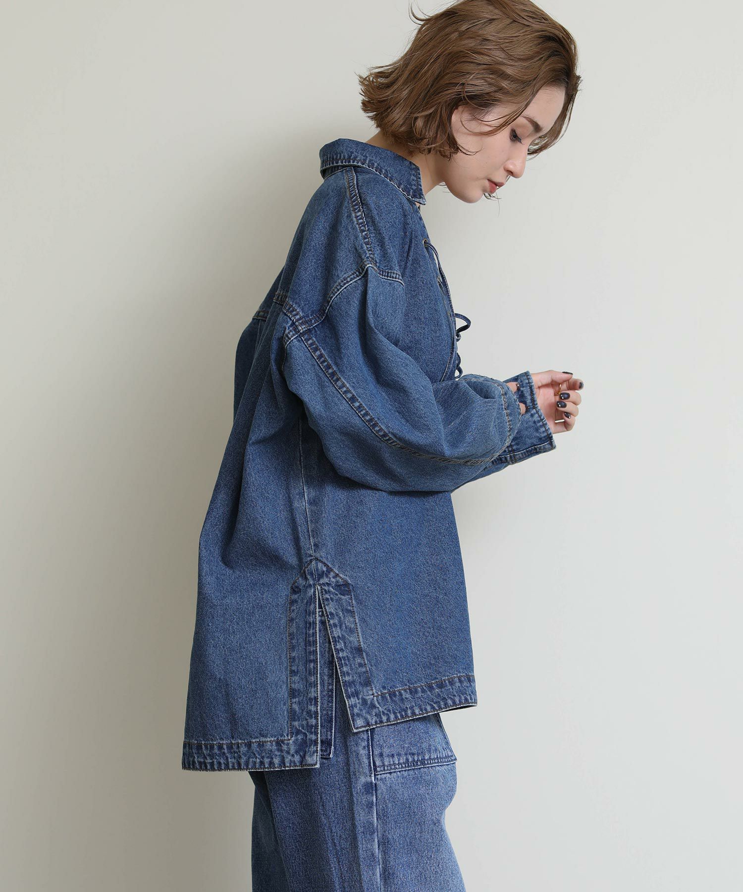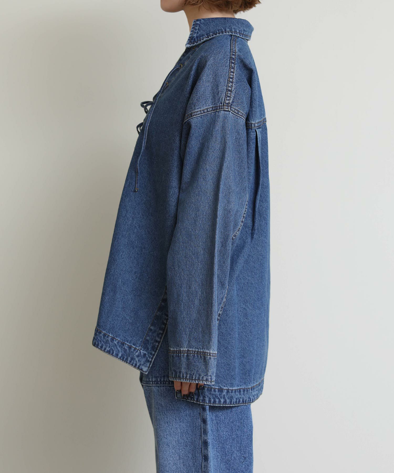 やや厚みのある素材感と美しい表面感が特徴のデニム地を採用し、女性らしく纏えるデニムシャツ。