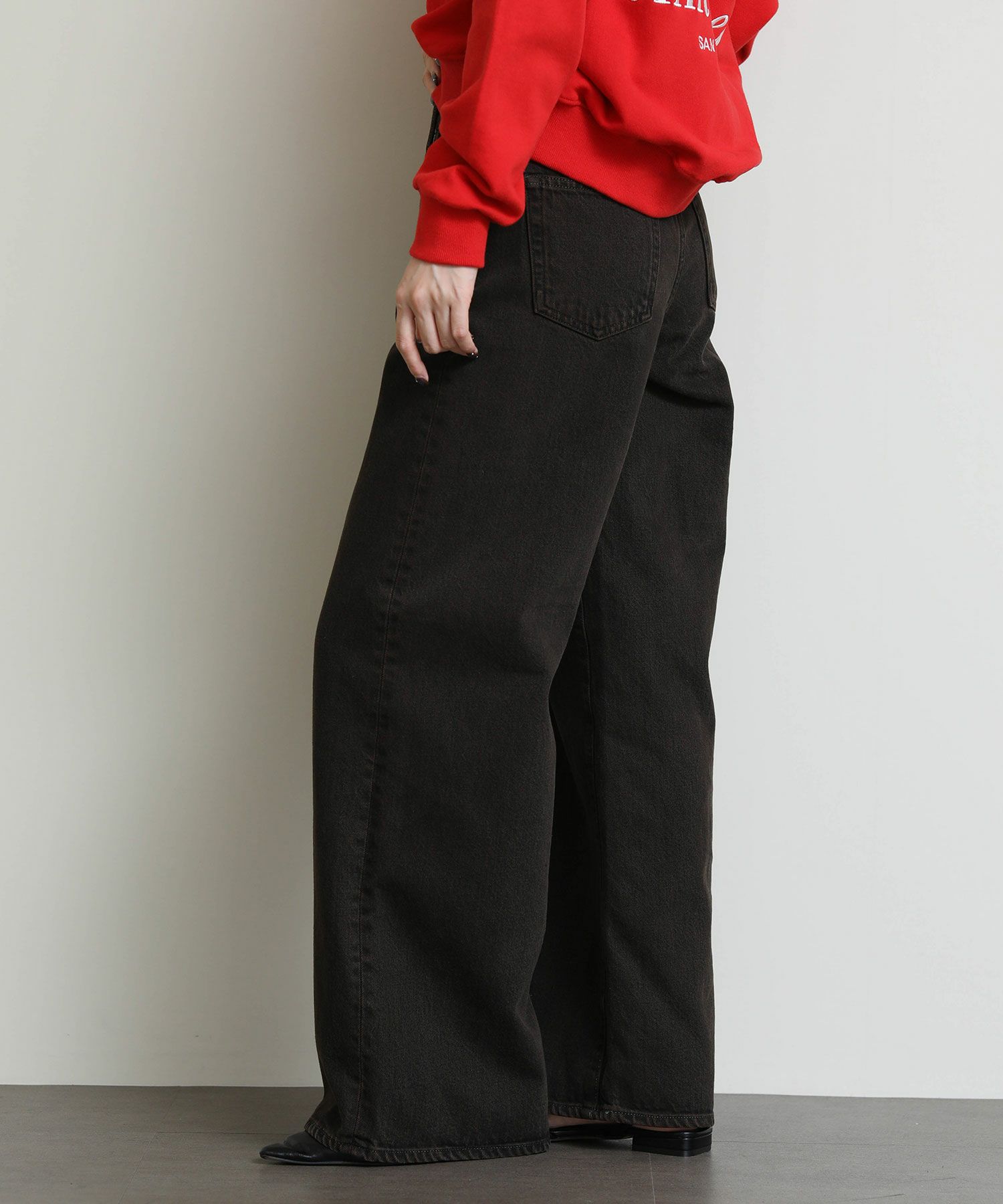 ウエストからヒップにかけてコンパクトな設計になっている為、ワイドながらルーズさはなく上品なシルエットが特徴です。13ozリサイクルブラックデニム使用し、製品染を施した一枚。