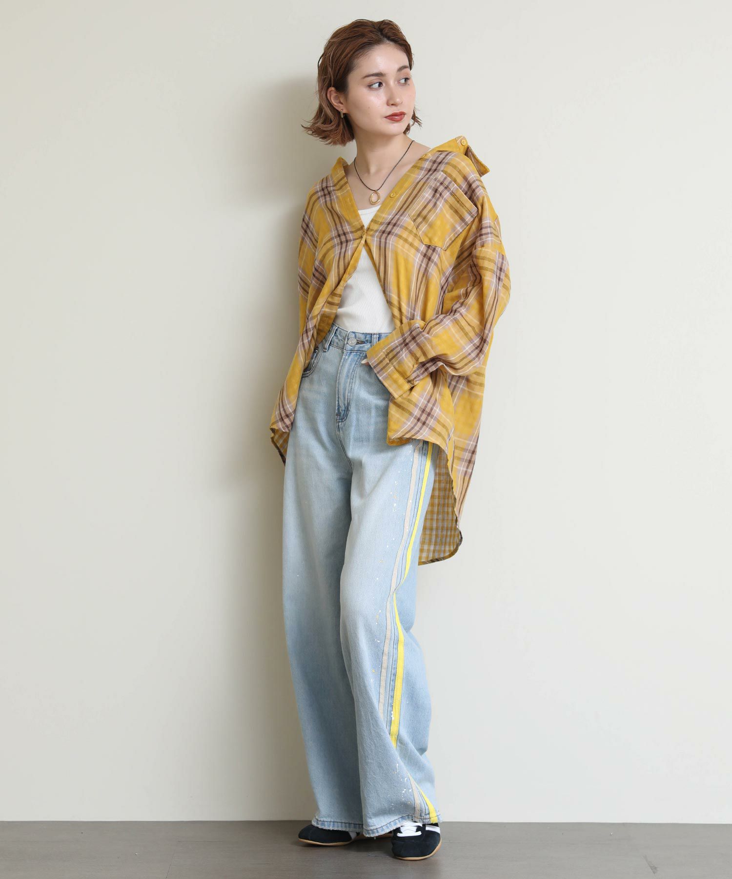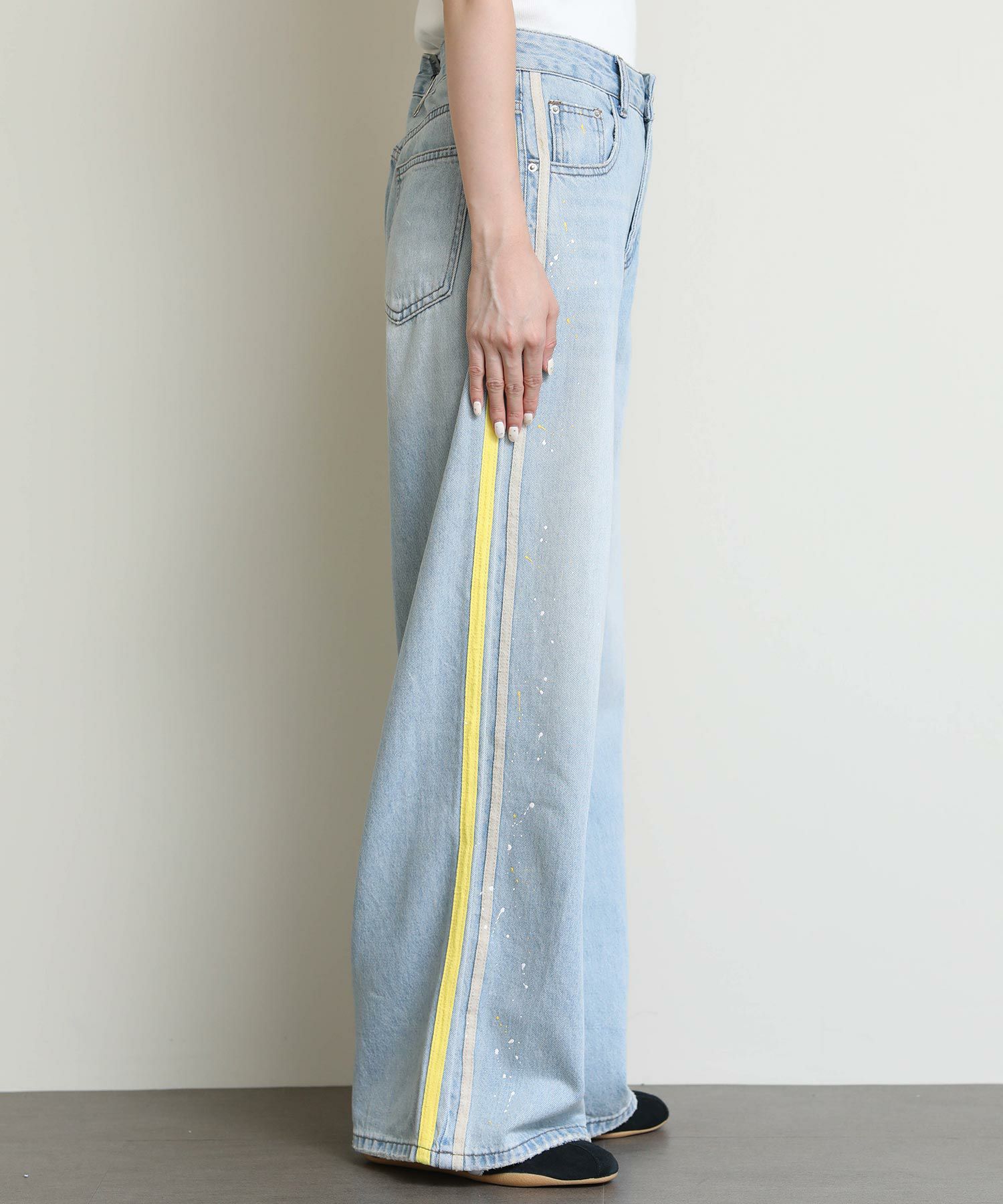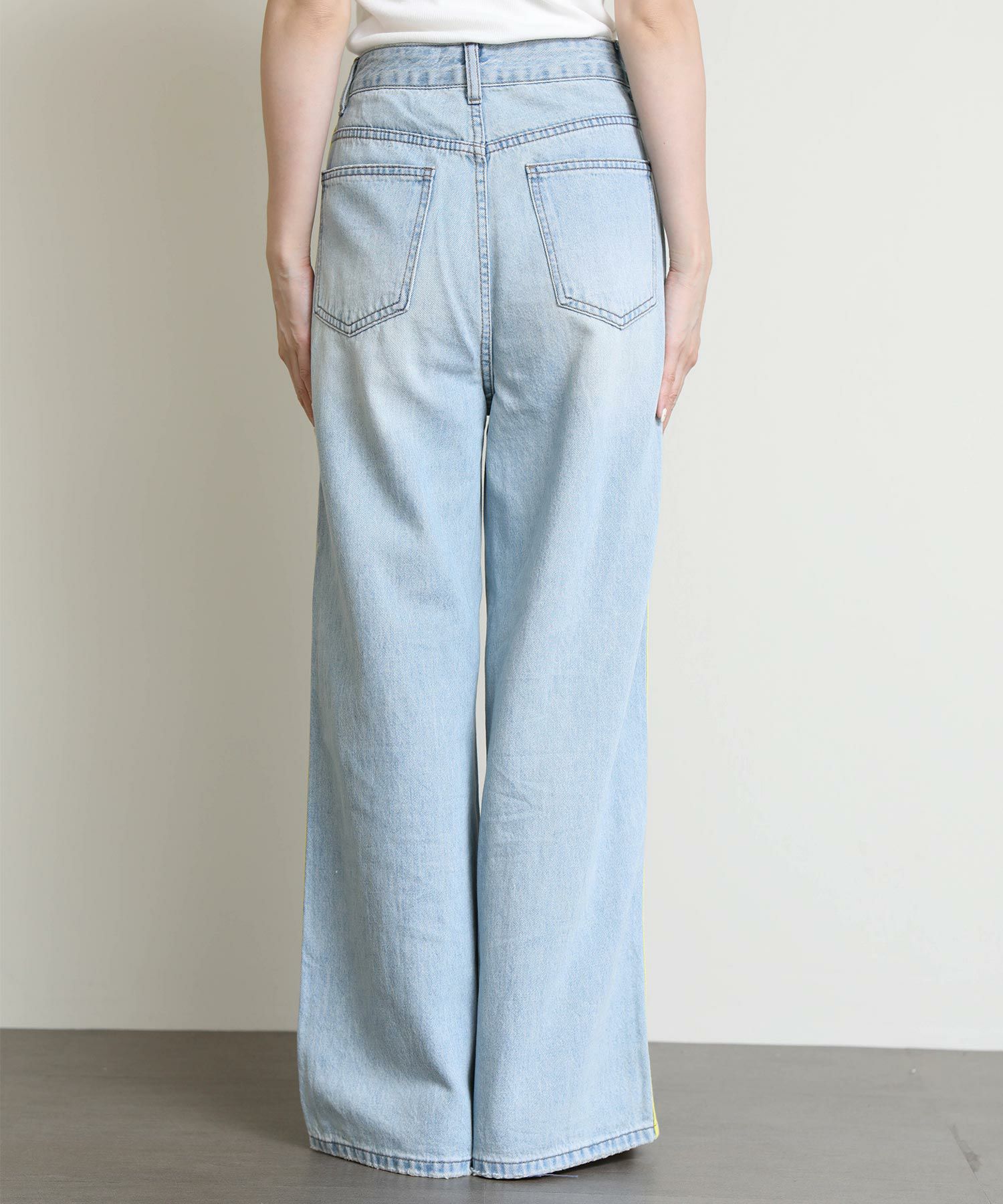 ルーズなシルエットとサイドに入ったイエローのラインがポイントのデニム。