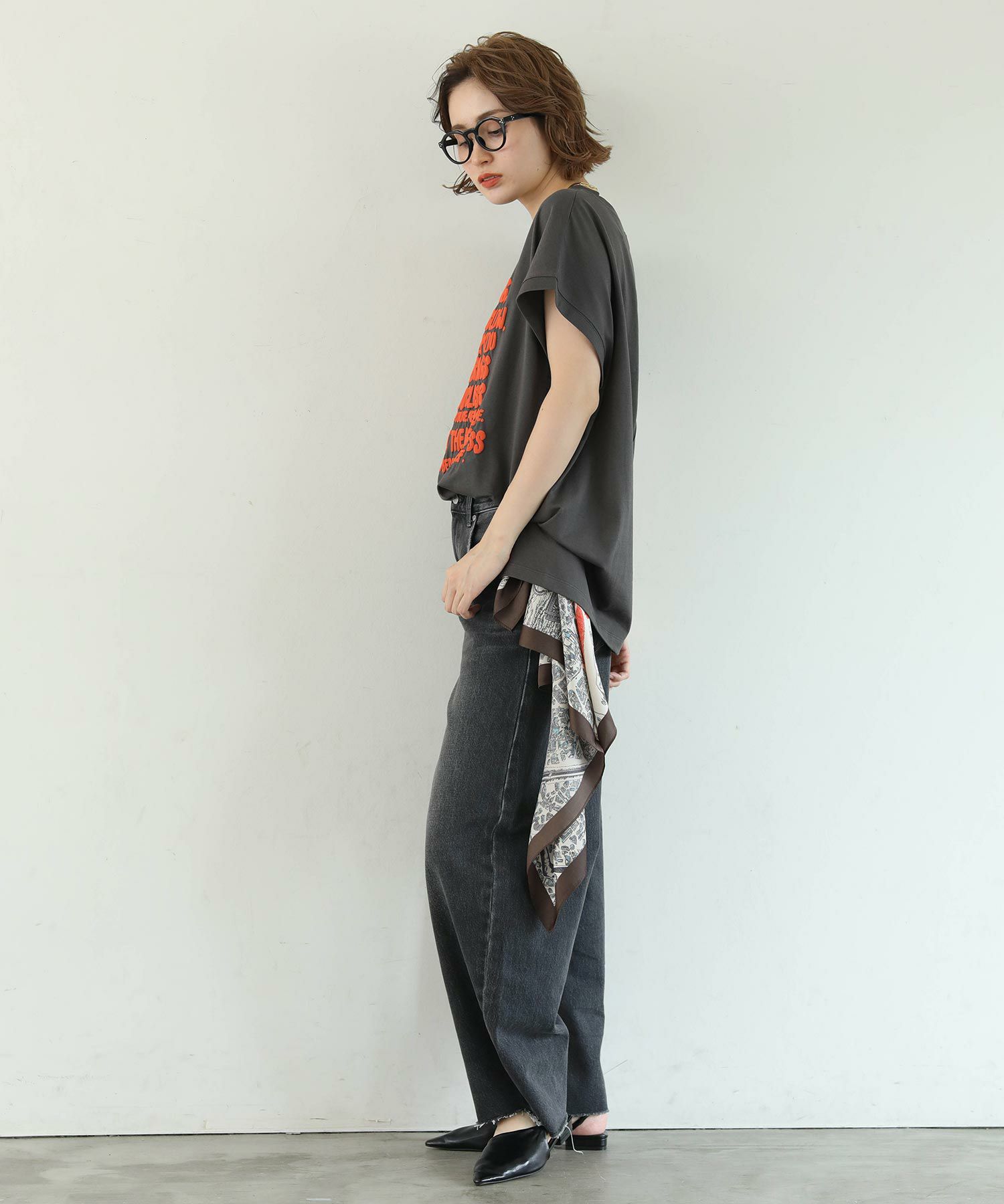 裾はアウトでタイトスカート合わせにしたり、前だけインしてワイドパンツを合わせても◎