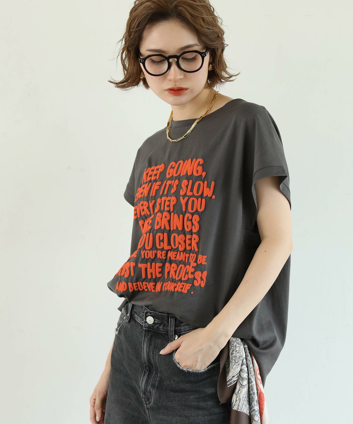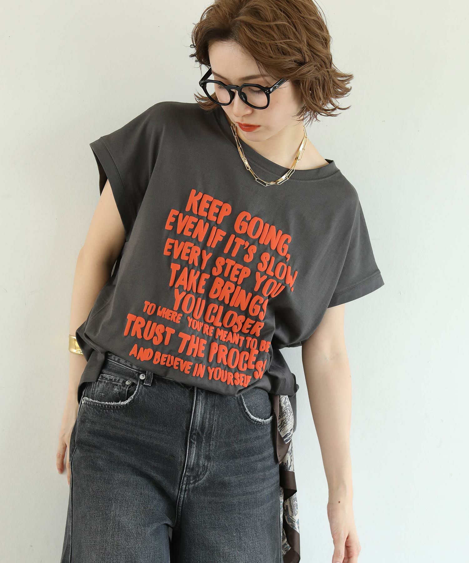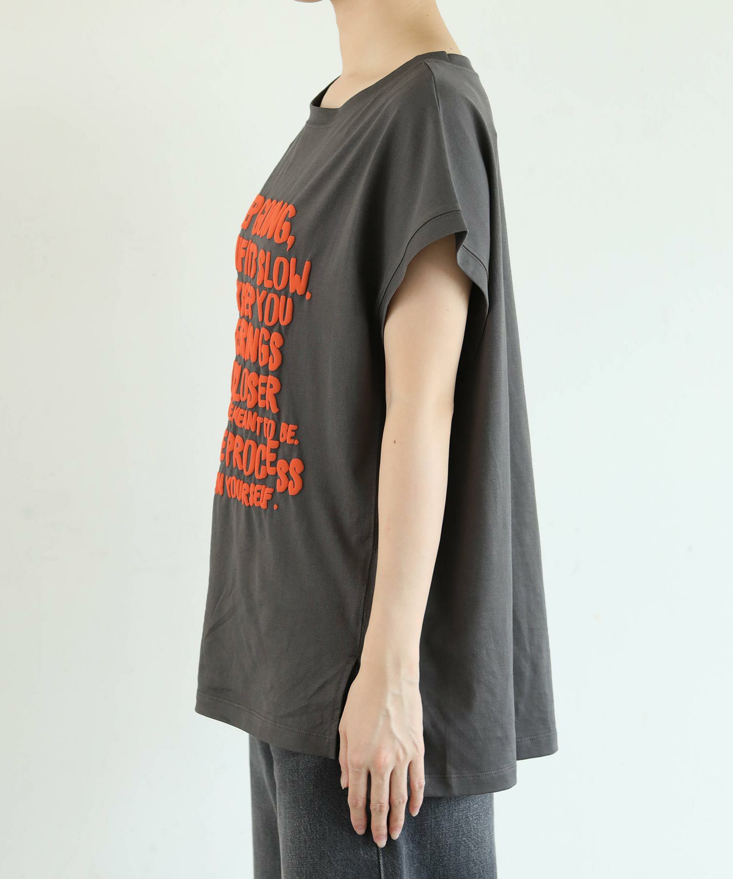 フロントに大きく主張する立体的な発砲プリントが印象的なロゴカットソー。