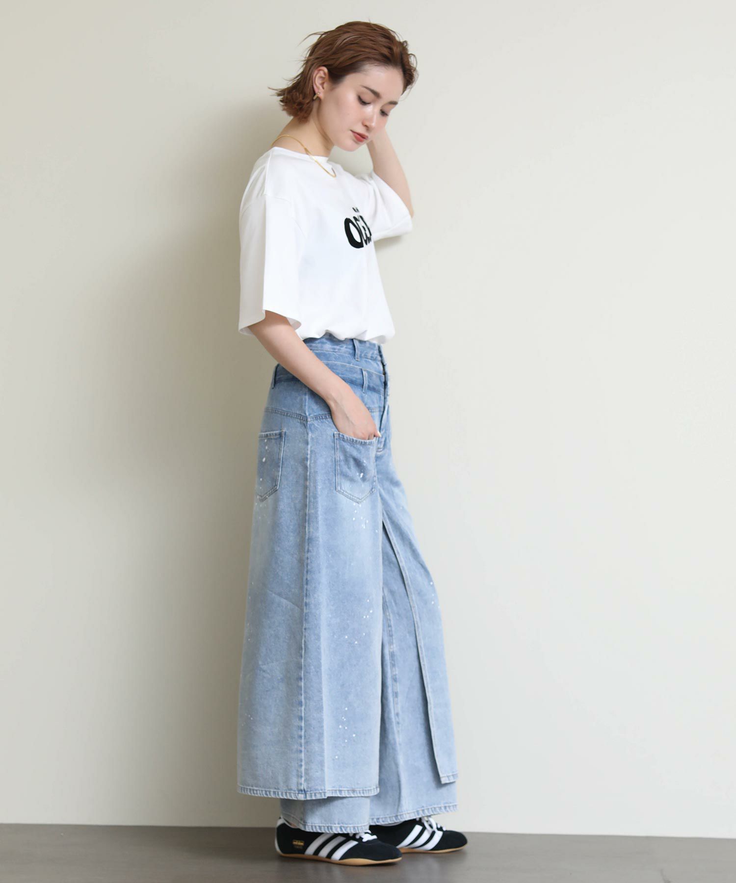 前後差のあるヘムラインで、前だけインでもキレイなシルエットに。