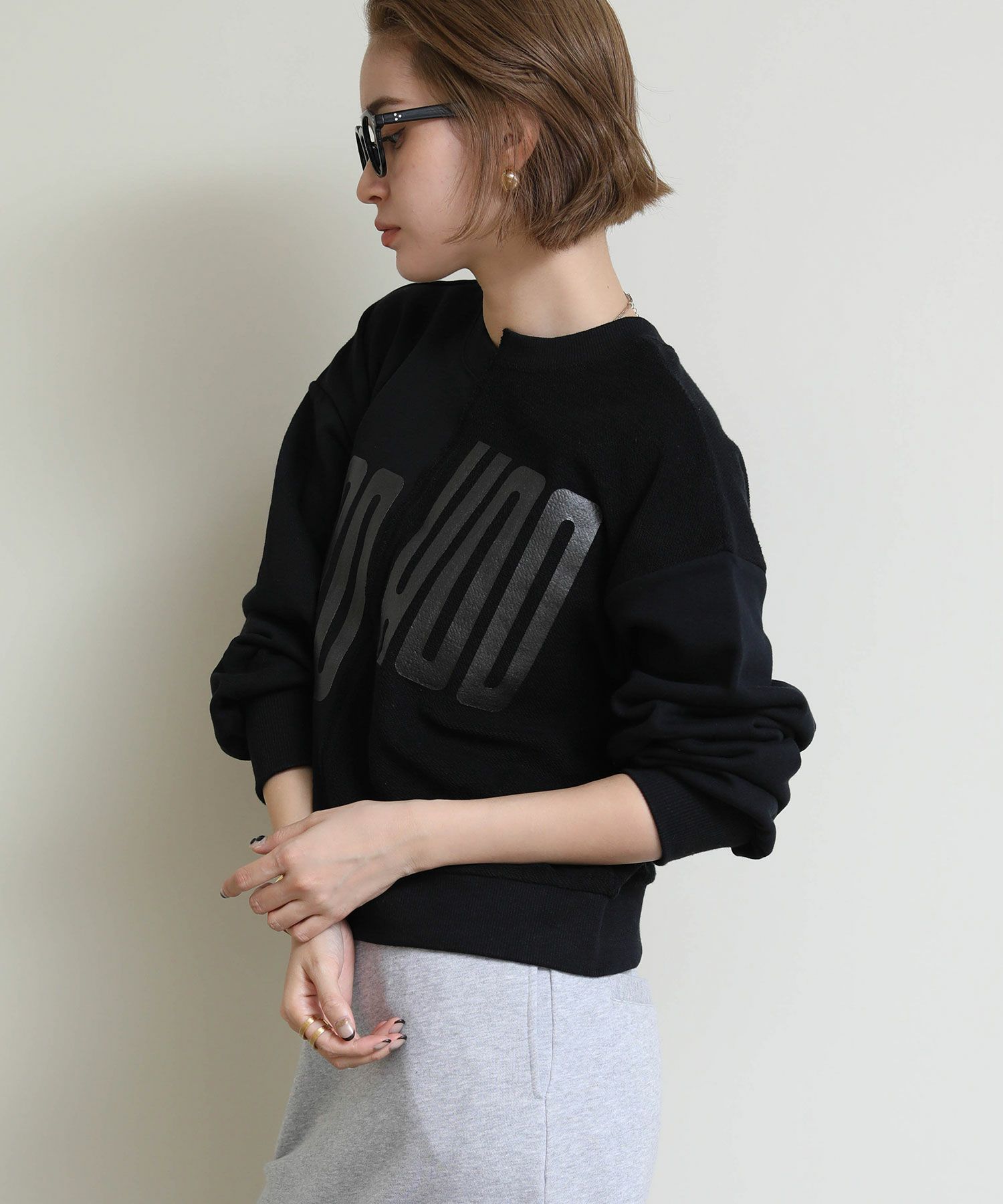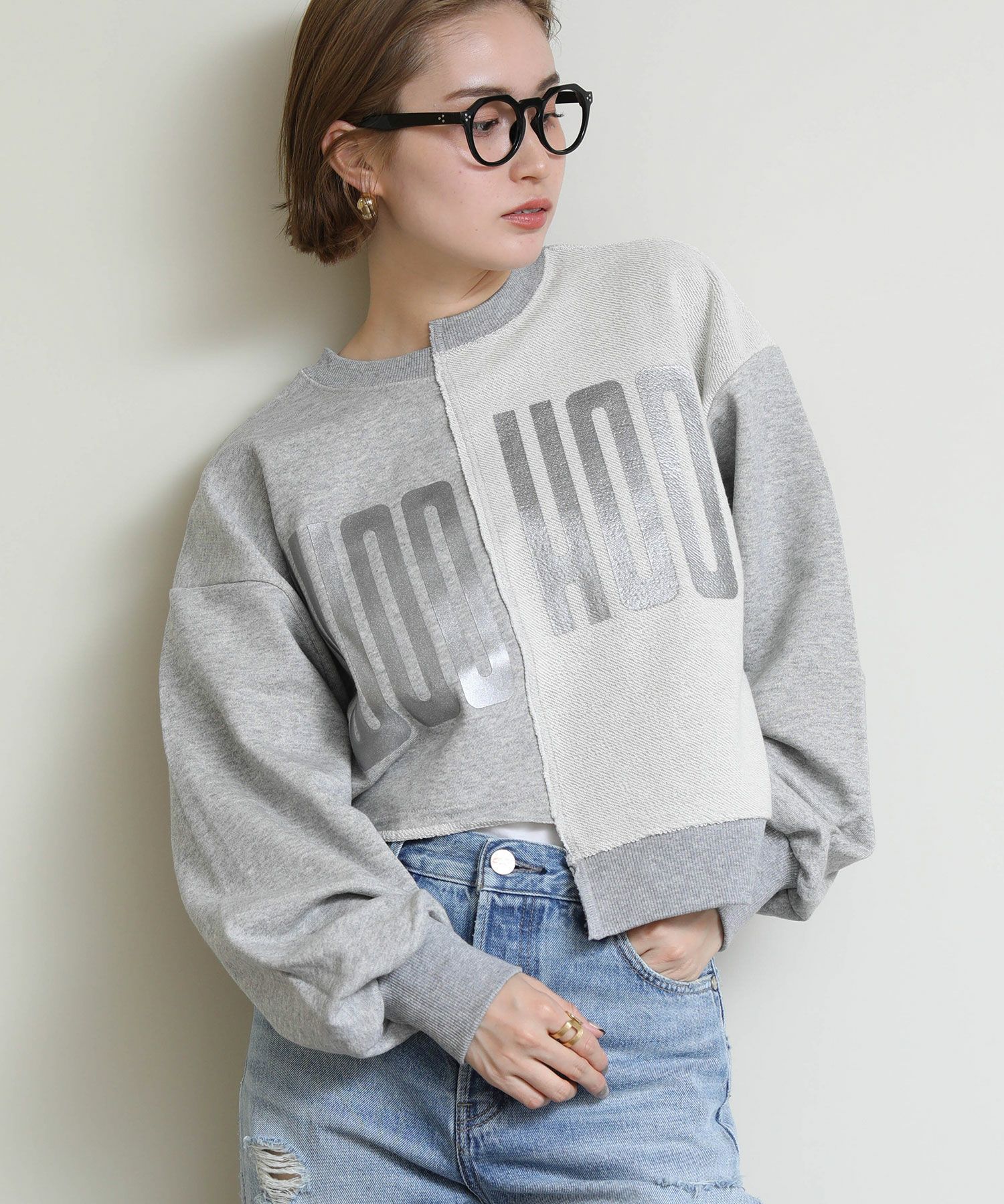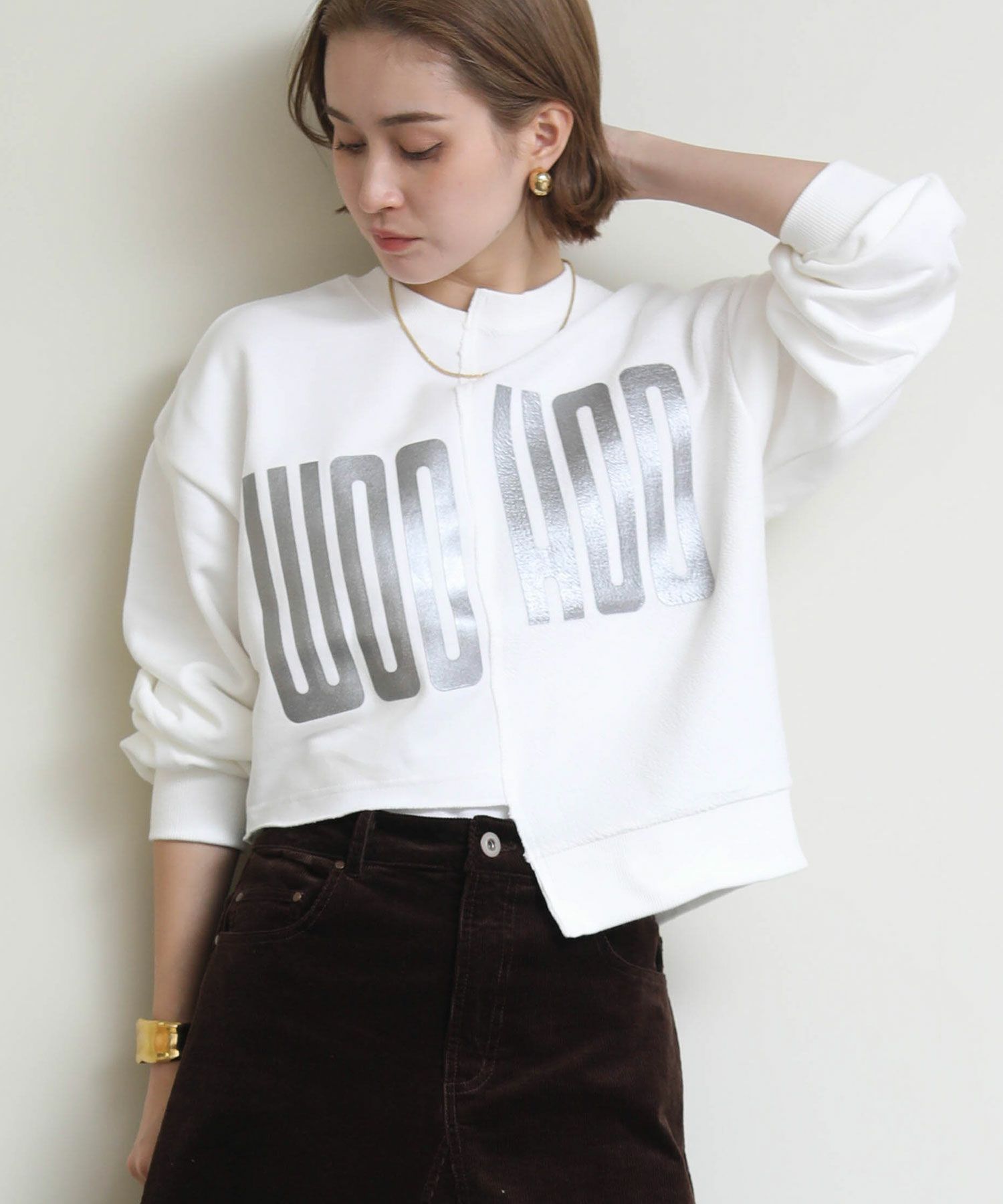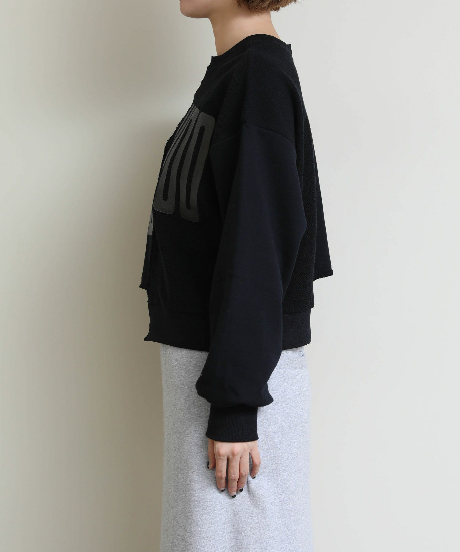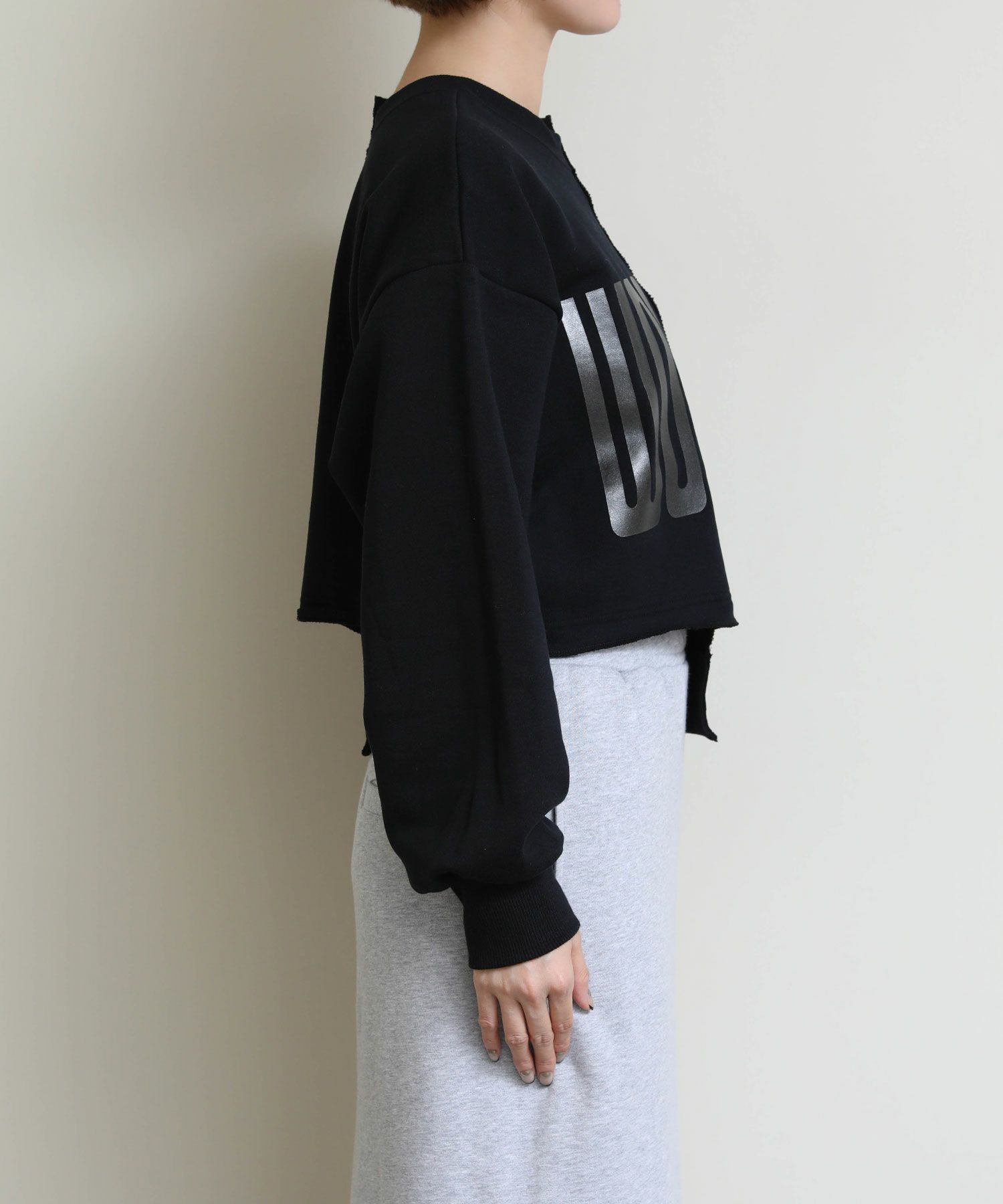 メタリックな風合いのロゴがインパクトがある、デザイン性のあるショート丈スウェットシャツ。