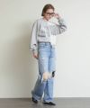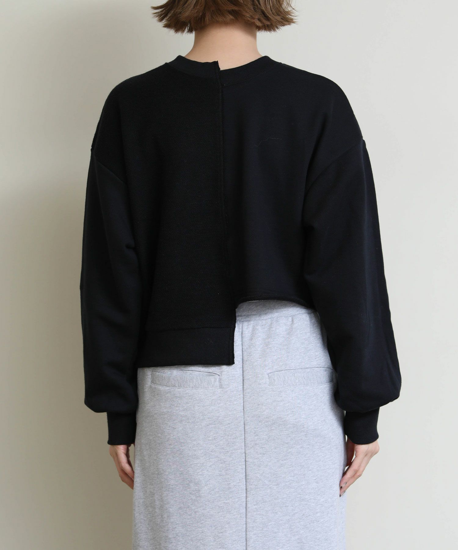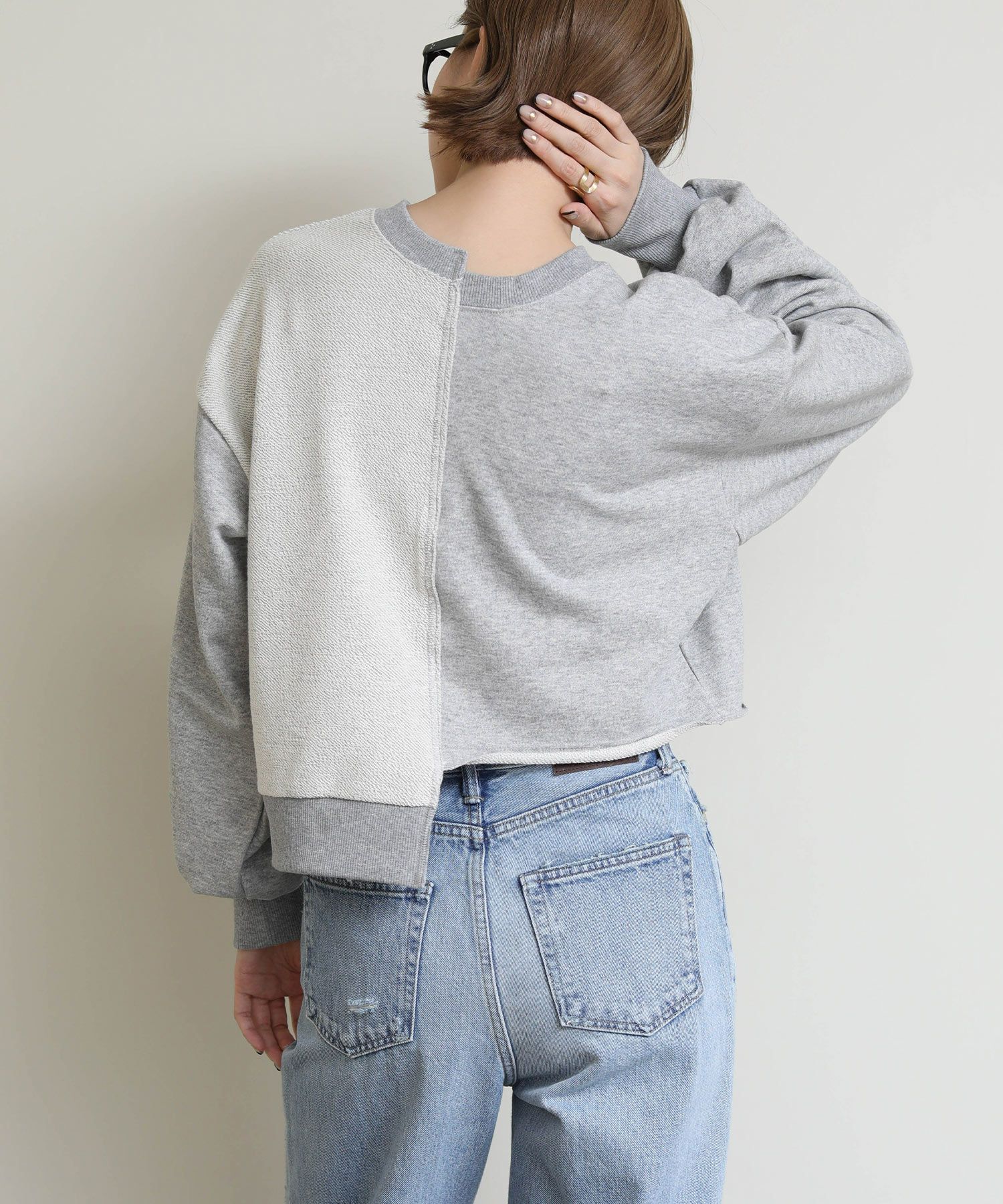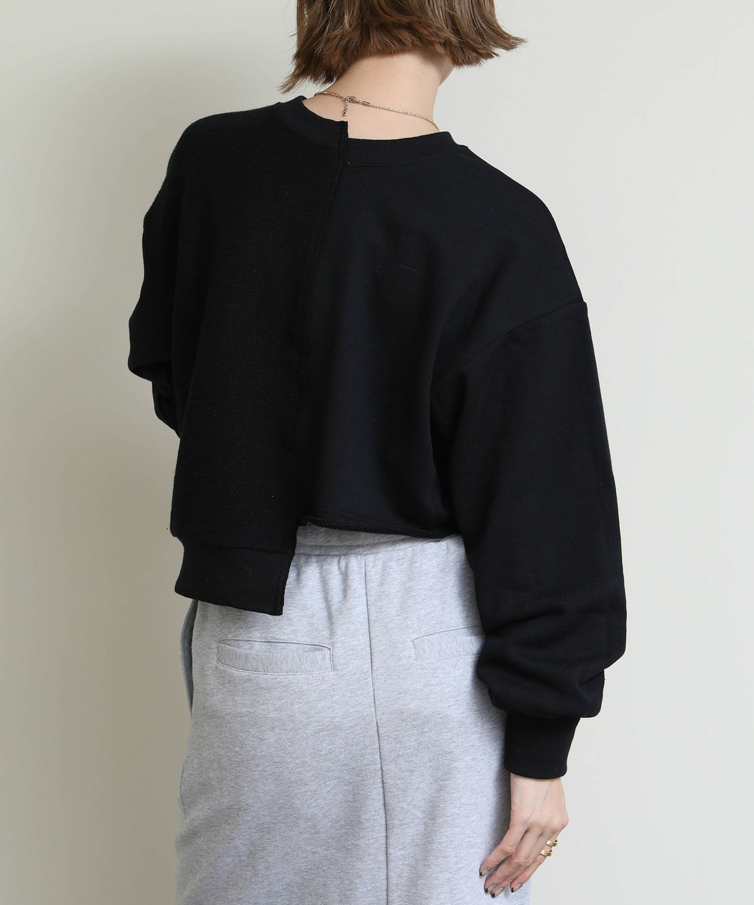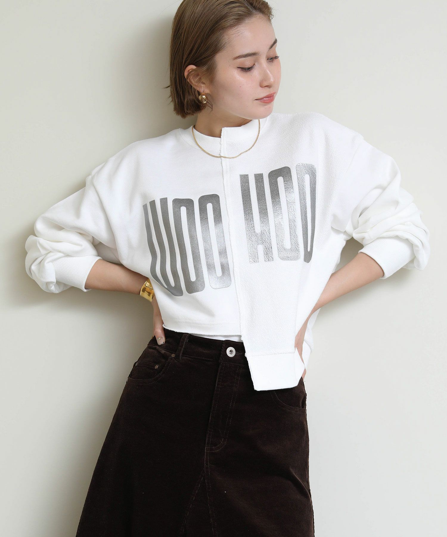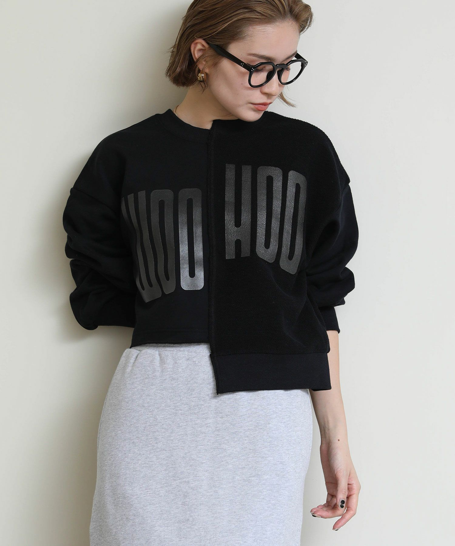 メタリックな風合いのロゴがインパクトがある、デザイン性のあるショート丈スウェットシャツ。