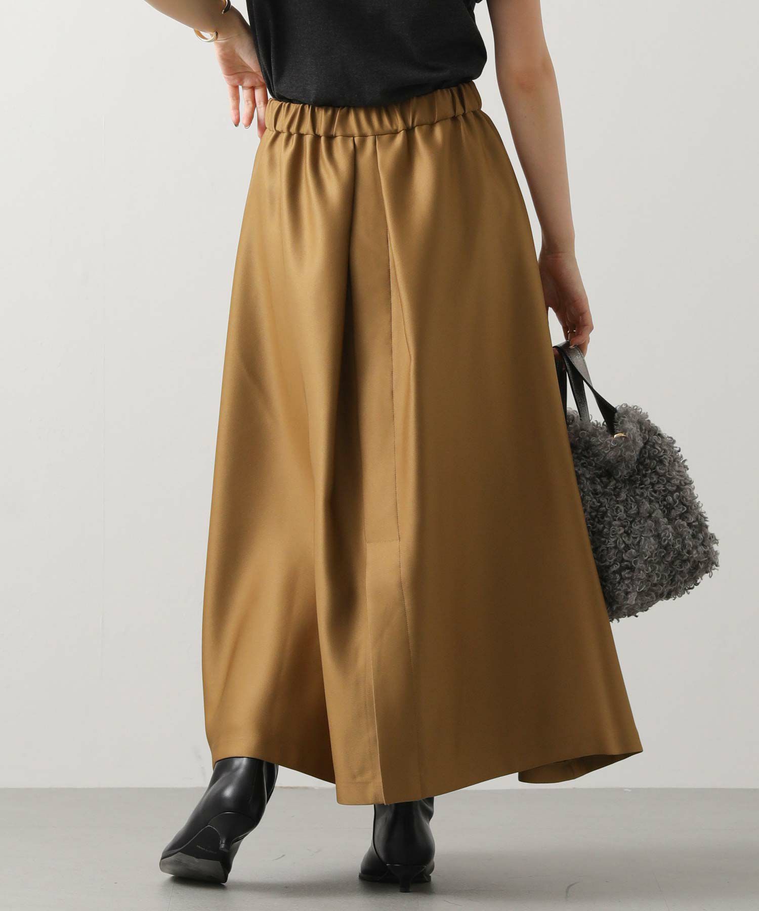 大胆なタックデザインが印象的、後ろ側のフレア分量が多いので、歩いた時の動きが美しいシルエットに。