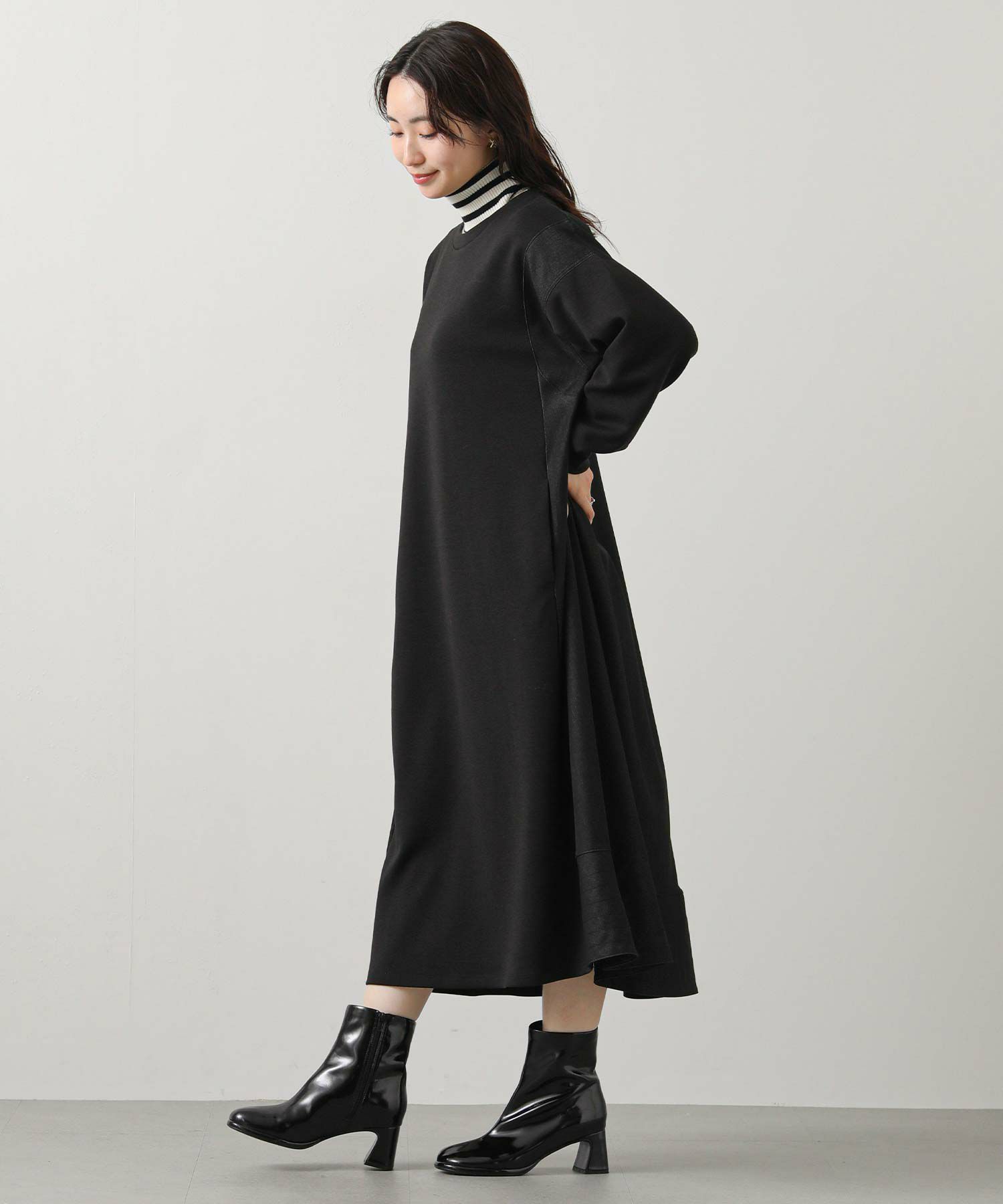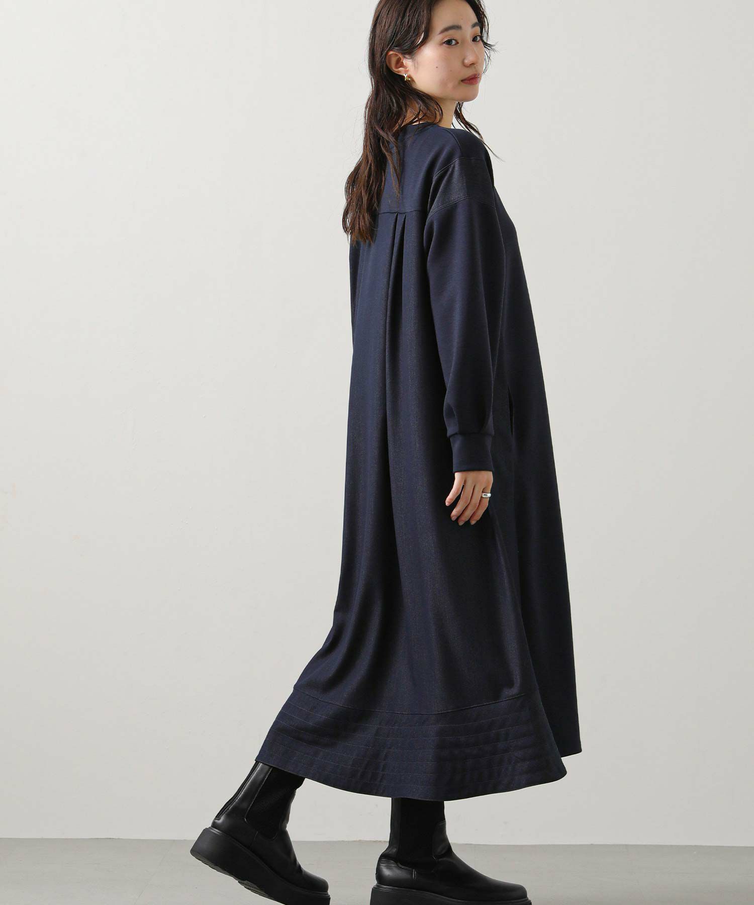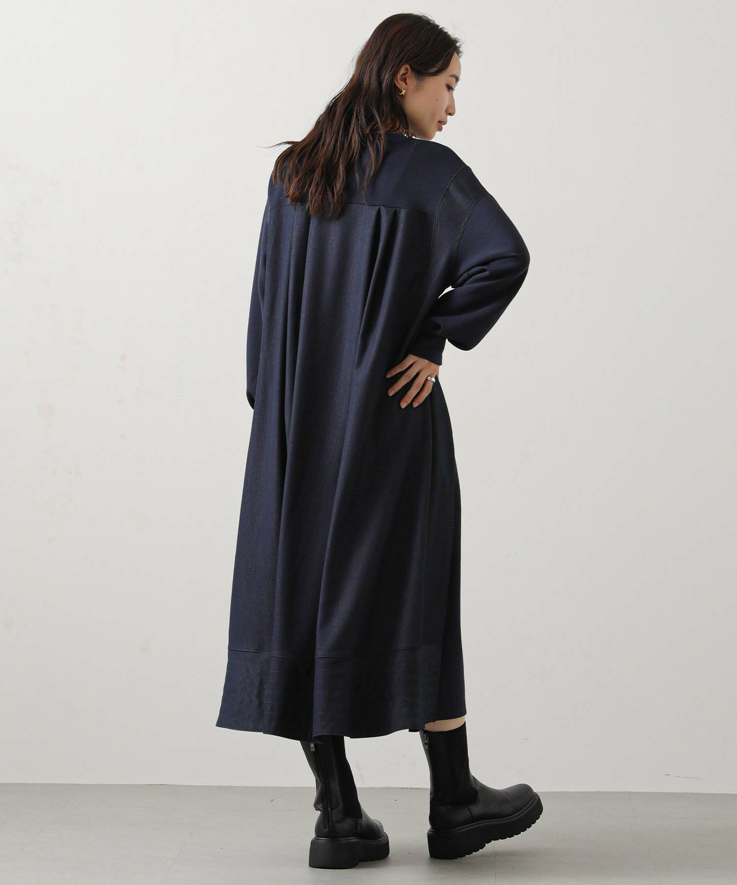 滑らかな素材感のTRデニムとダンボール素材をドッキングしたフレアワンピース。