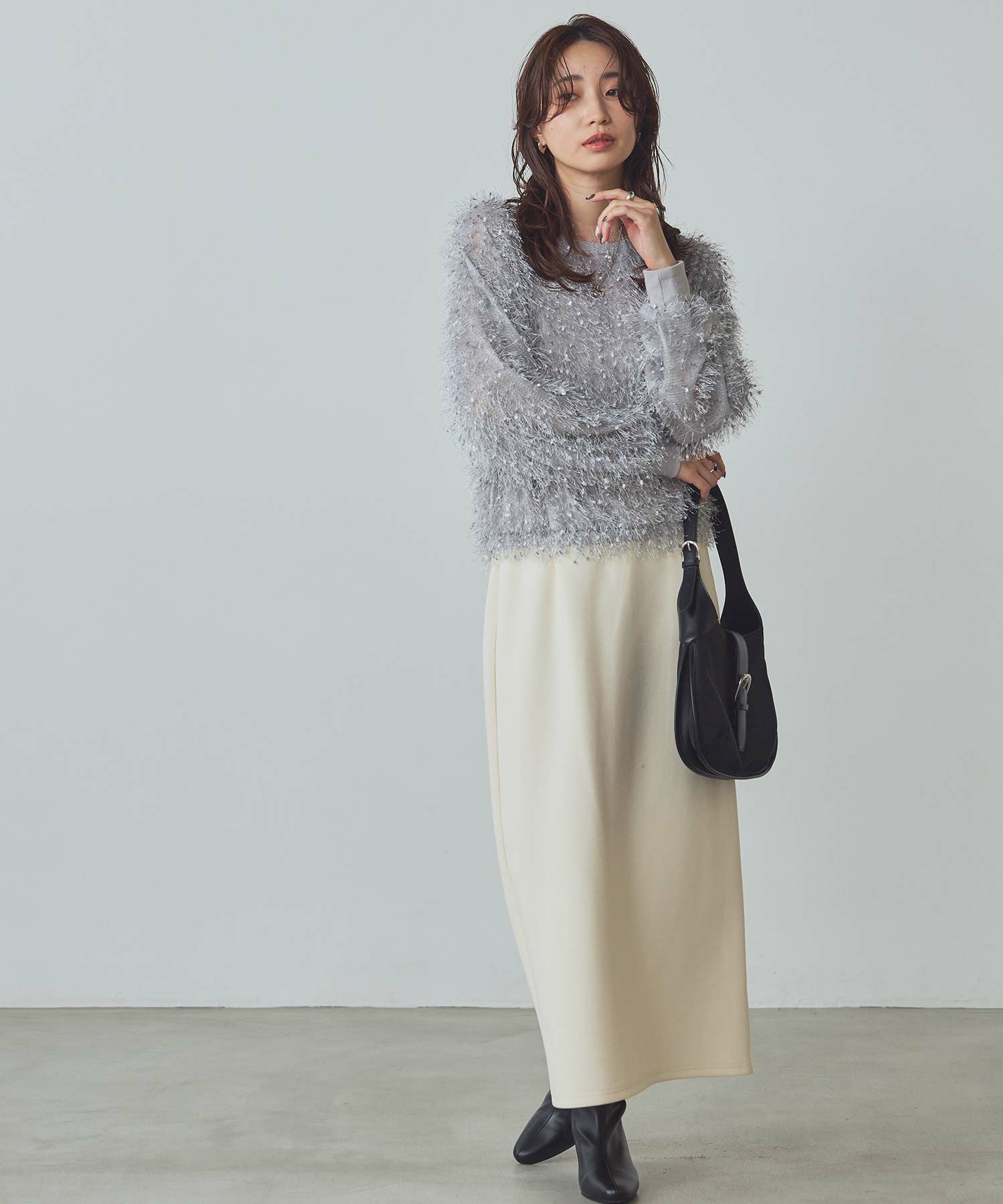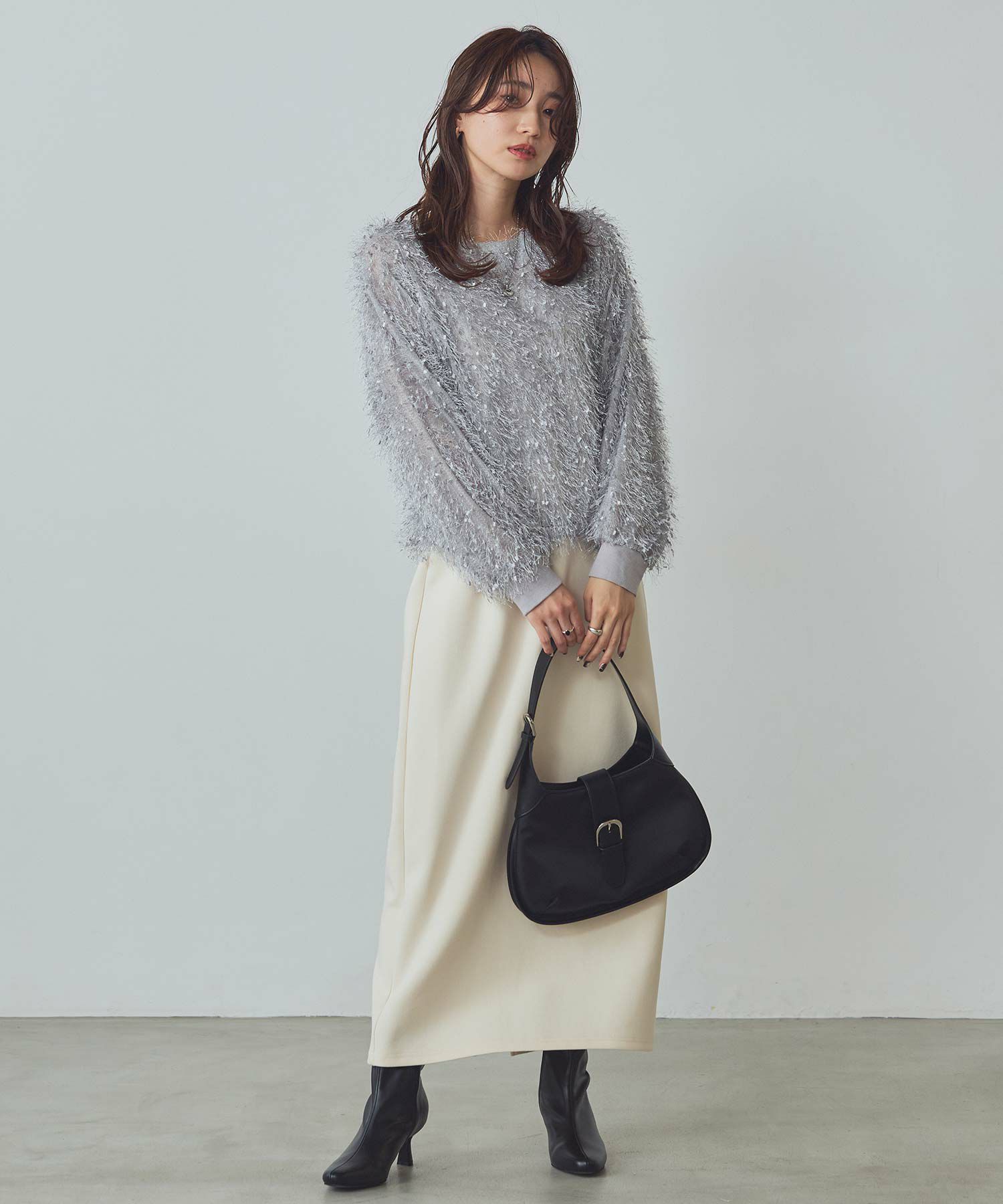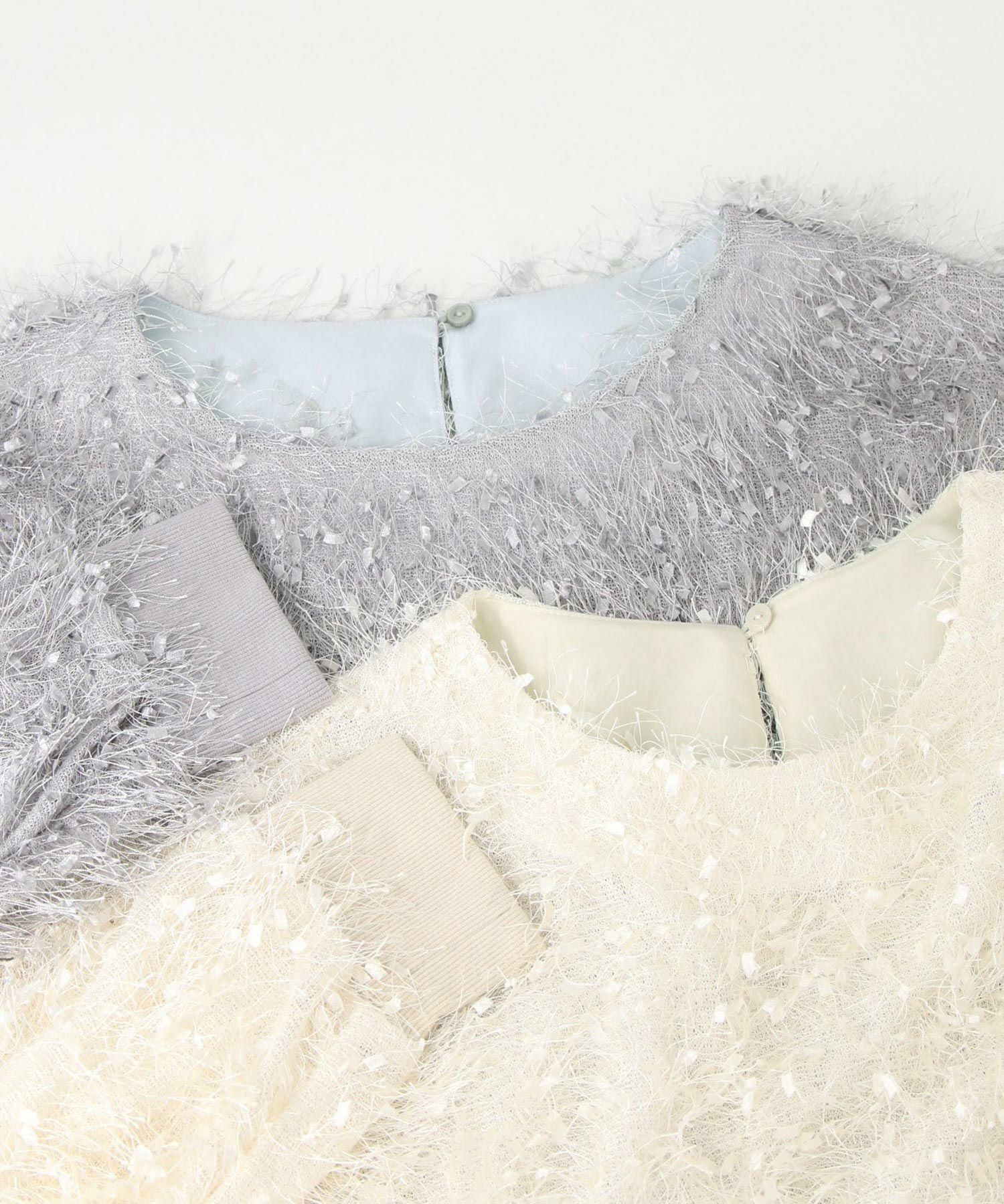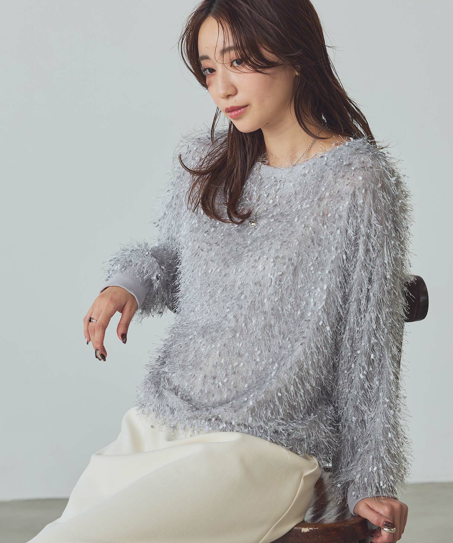 柔らかな毛足と光沢感のある素材が織り込まれたブラウスは、休日のスタイルに上品な華やかさを添えてくれる一枚です。