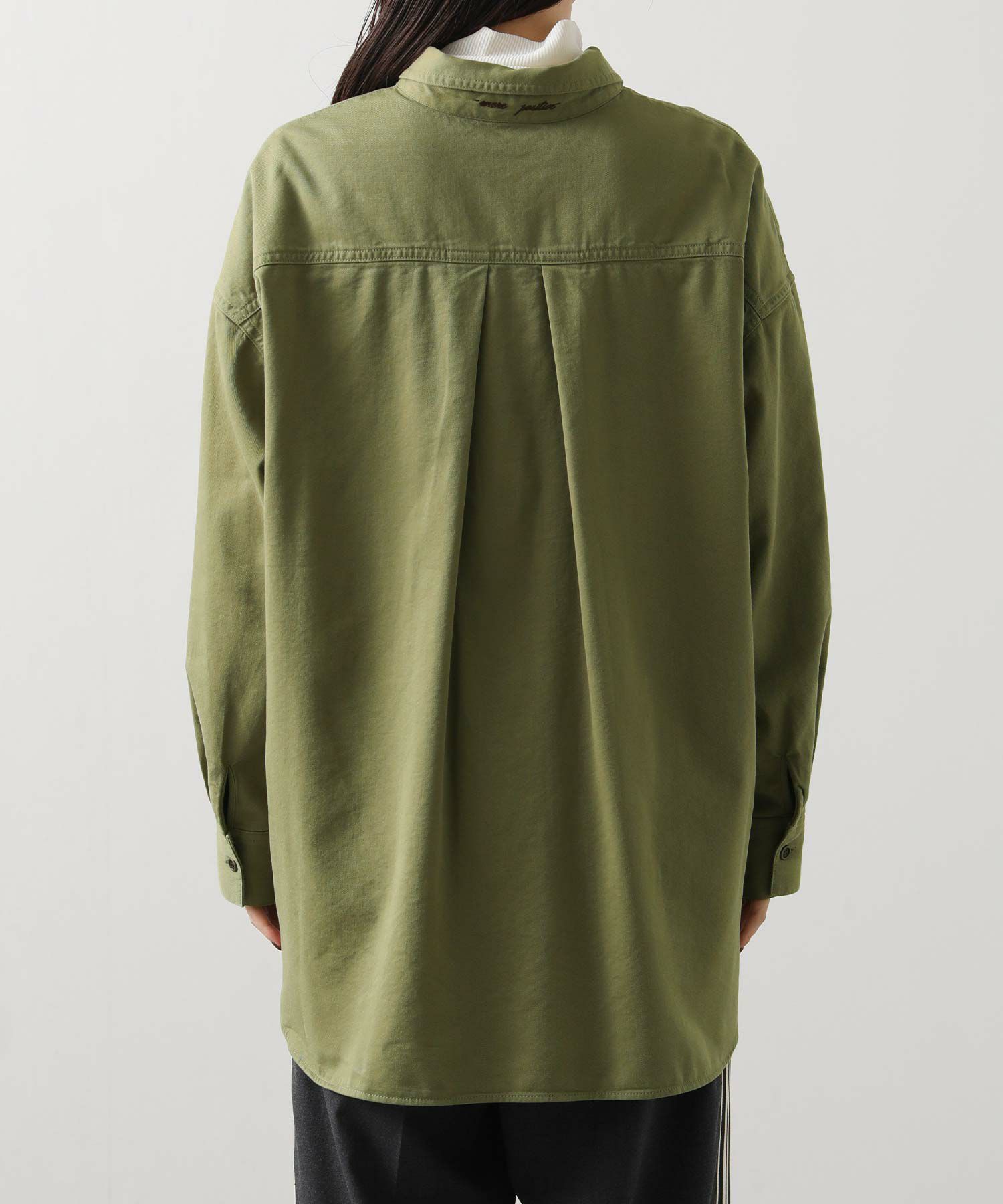 台衿に刺繍ロゴをポイントで入れているので、ラフに襟を立てて刺繍を見せる着こなしがオススメ。