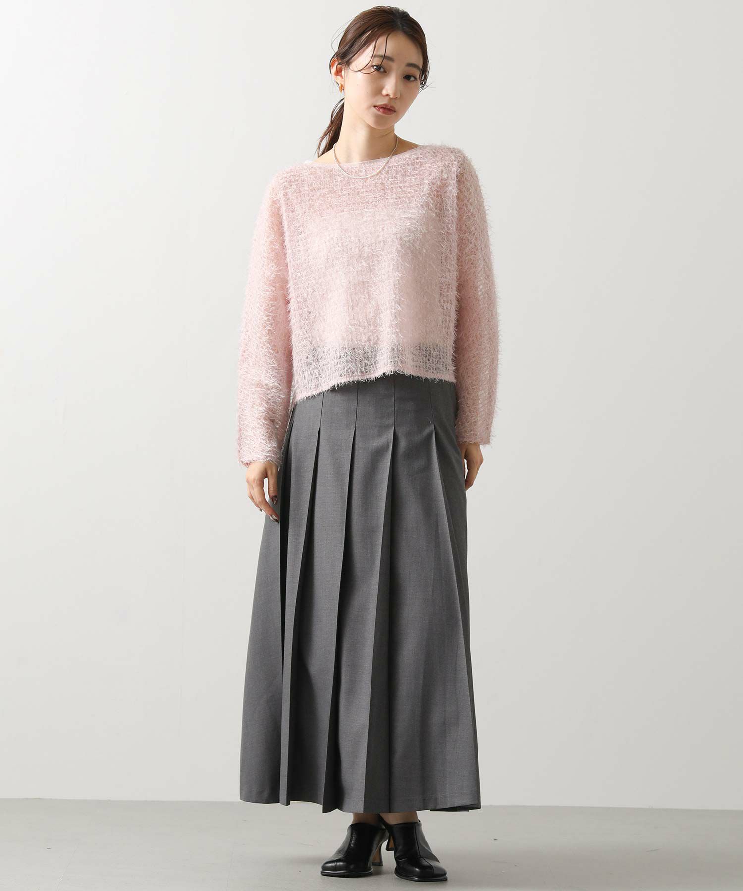 幅広のプリーツがクラシカルなムードに、広がりすぎないので子供っぽくならず、大人の女性も取り入れやすいシルエット。