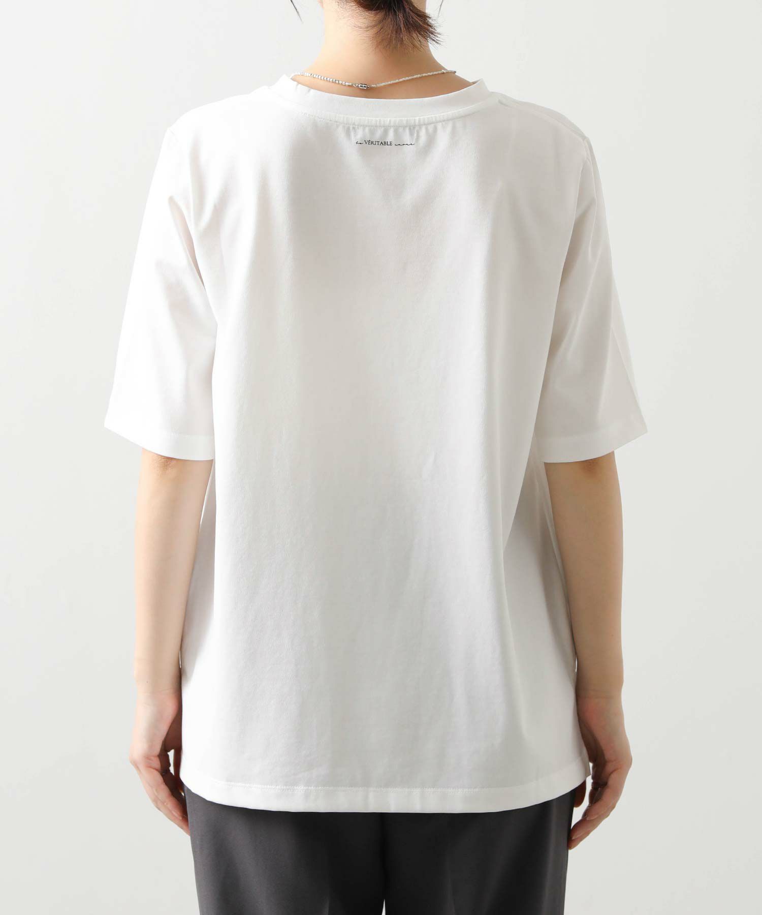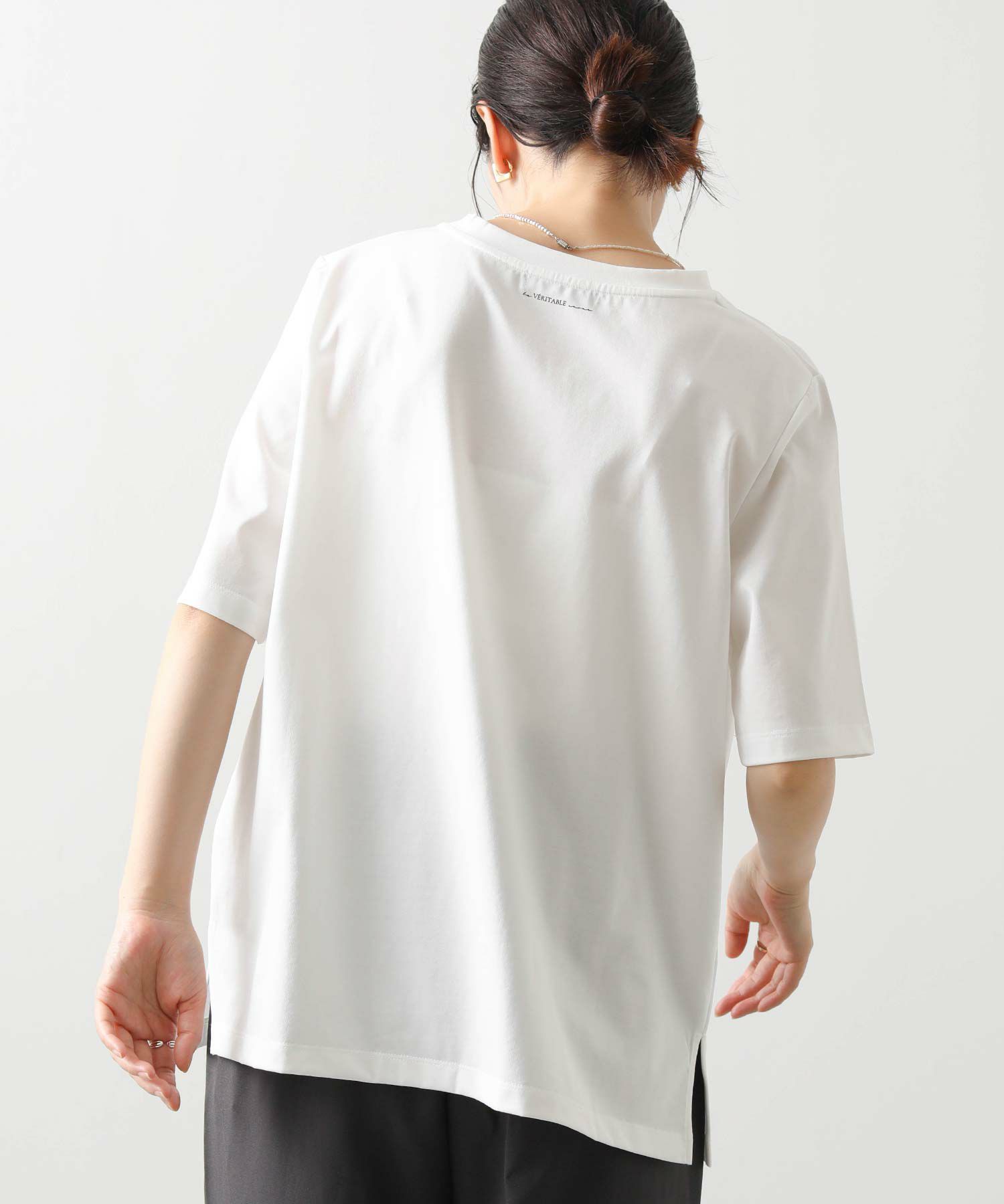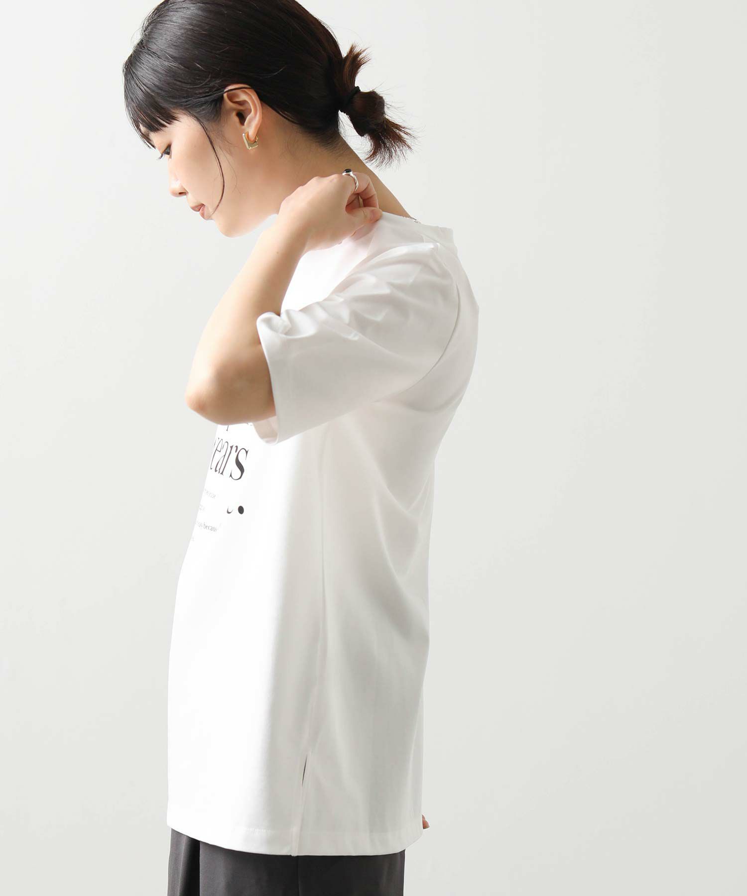 フロントに施されたロゴがシンプルな中にもこなれ感を、サイドにスリットを入れることで抜け感を演出。