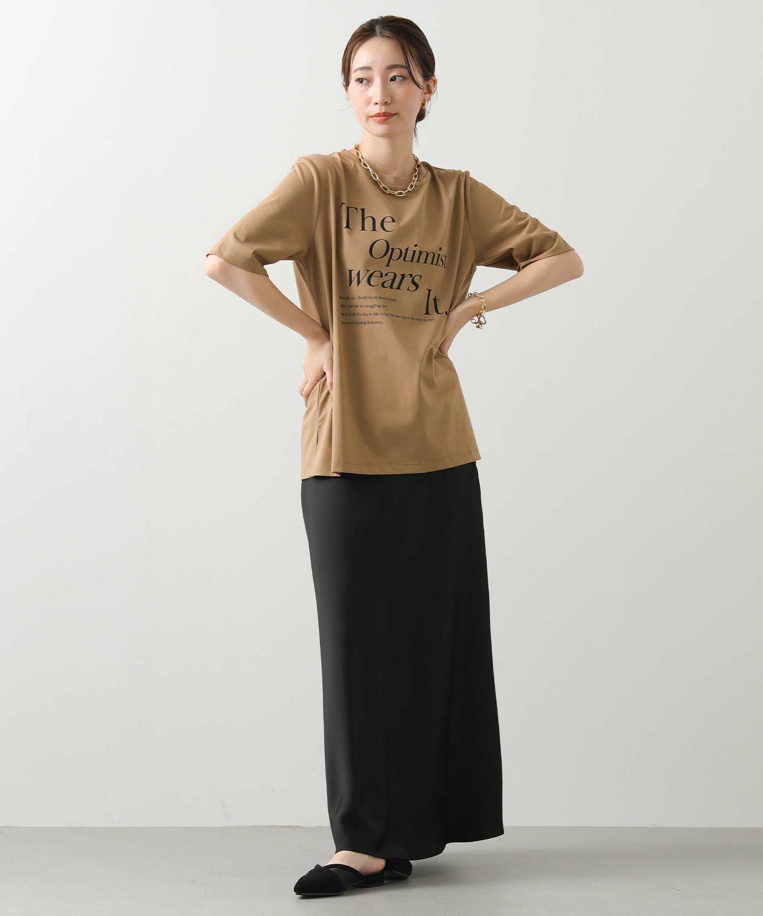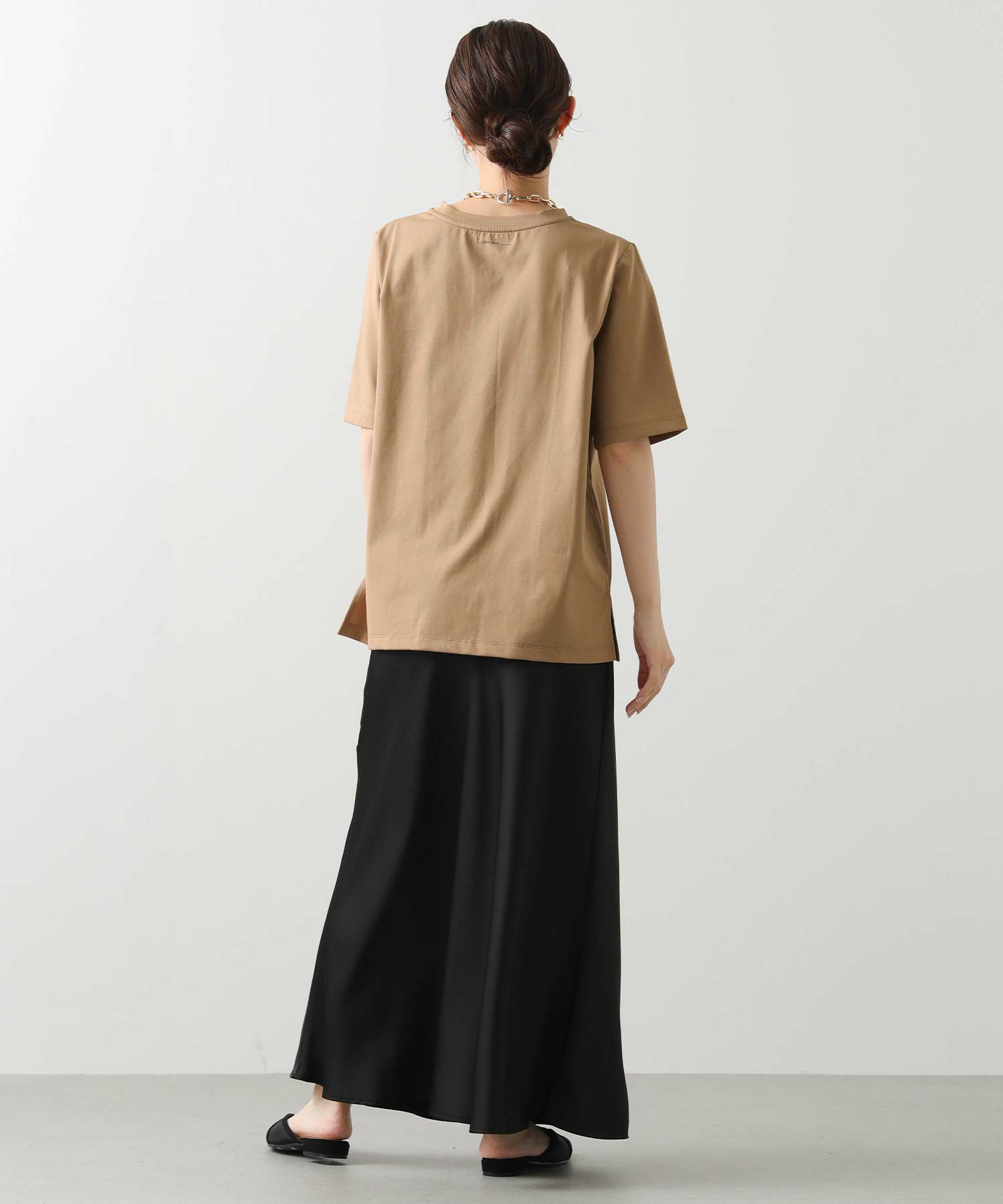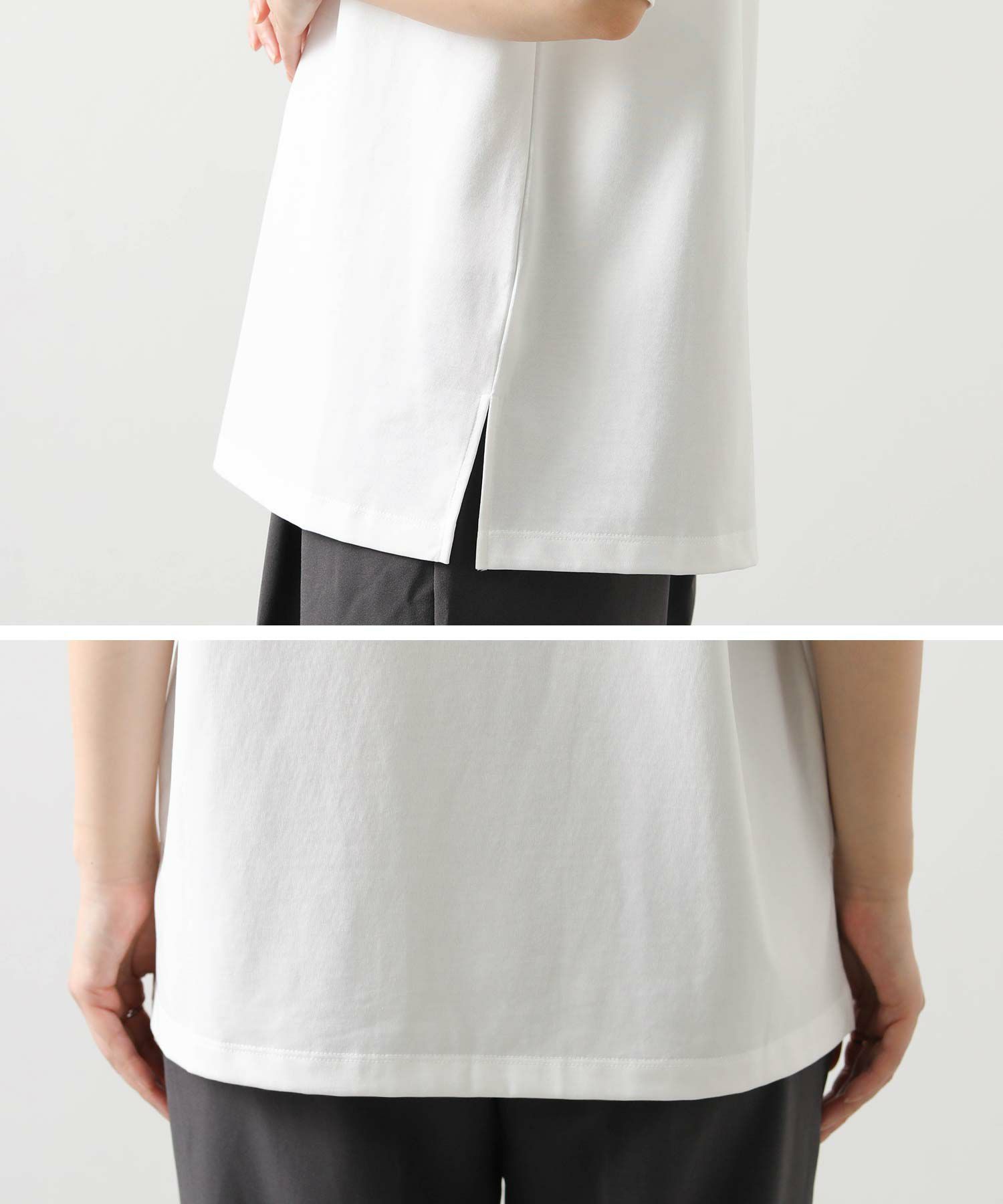 ゆったりとした着心地ながら、シルエットはすっきり見える設計。ワイドパンツやロングスカートとも好相性で、インでもアウトでもバランスよく決まります。