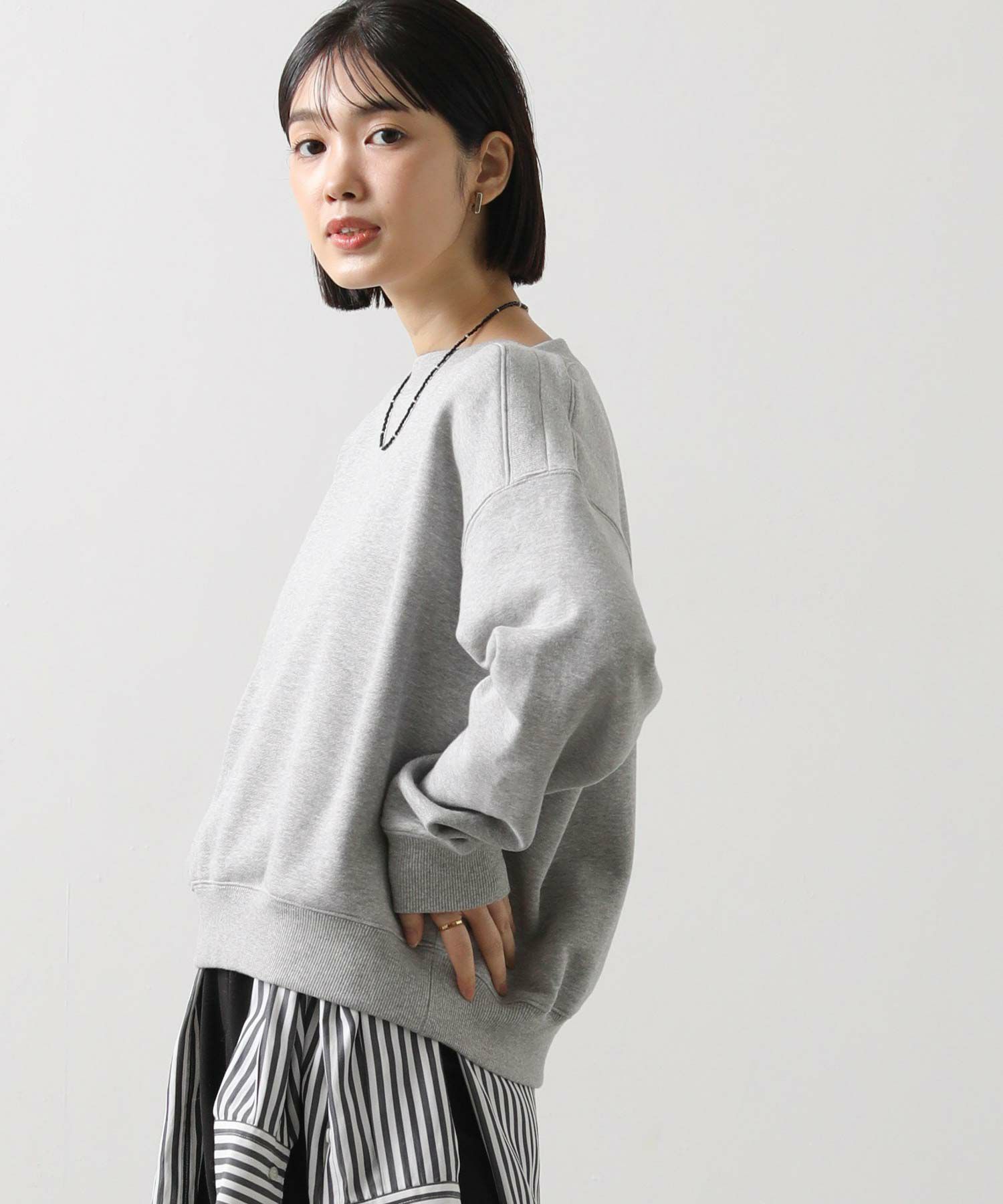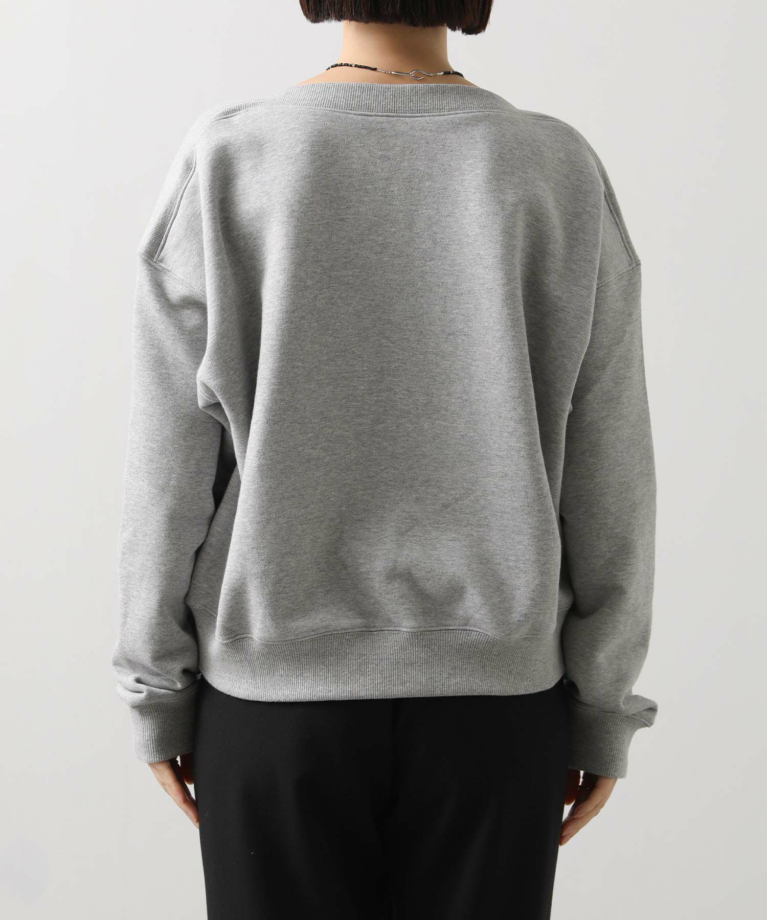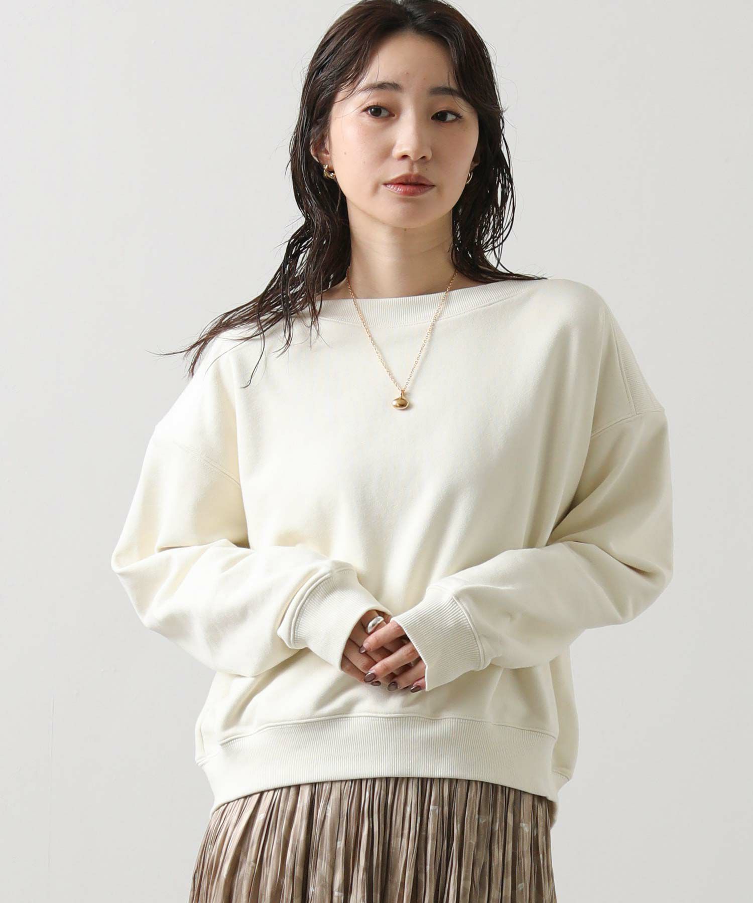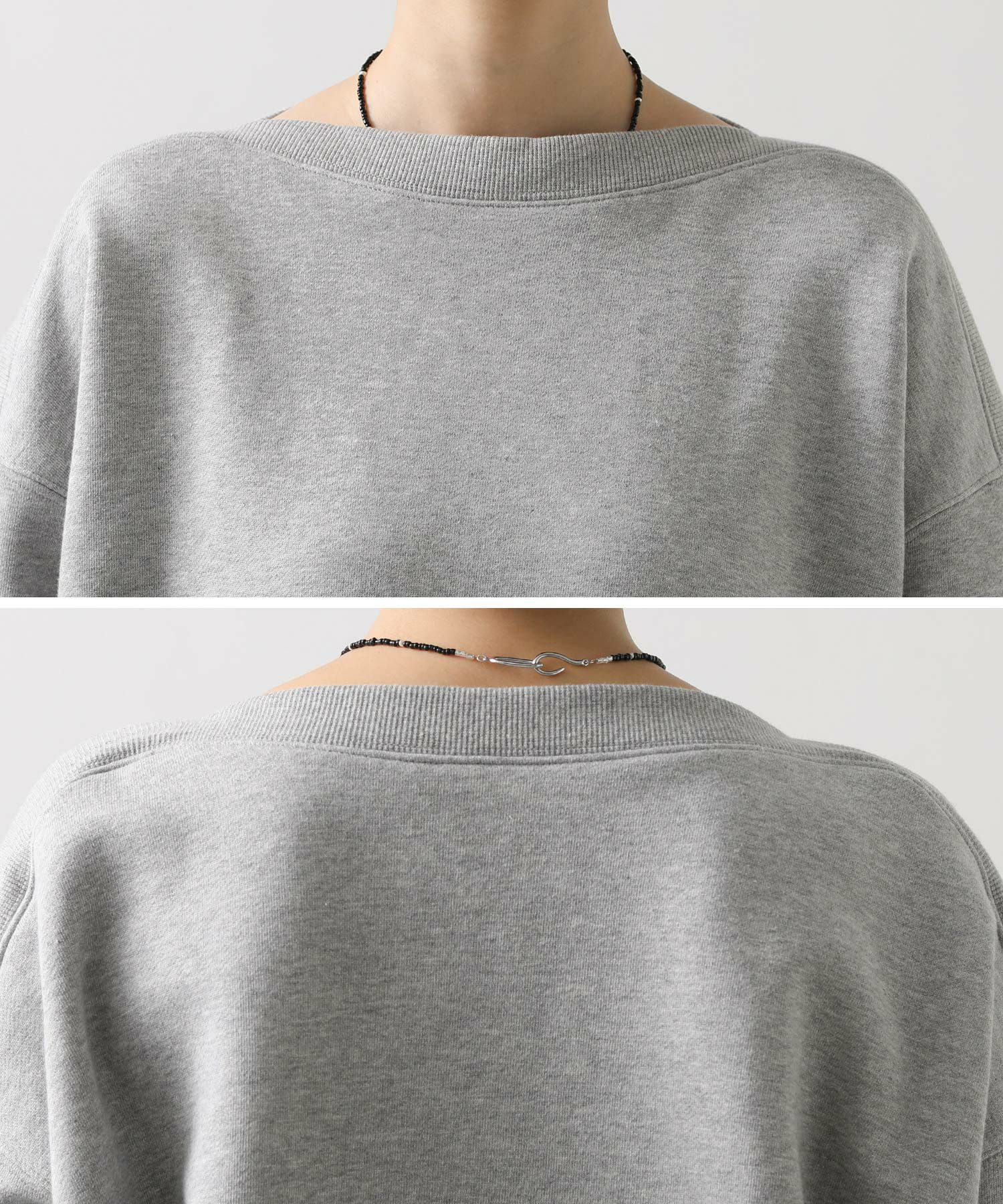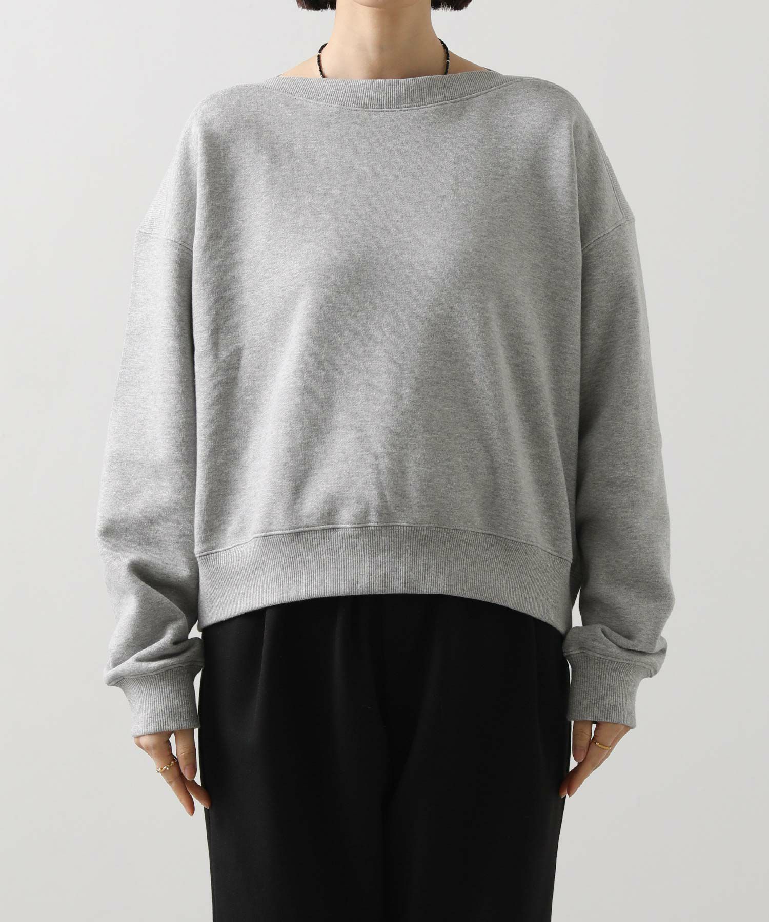 衿周りにリブ素材を用いたボートネックが印象的な裏毛スウェット。