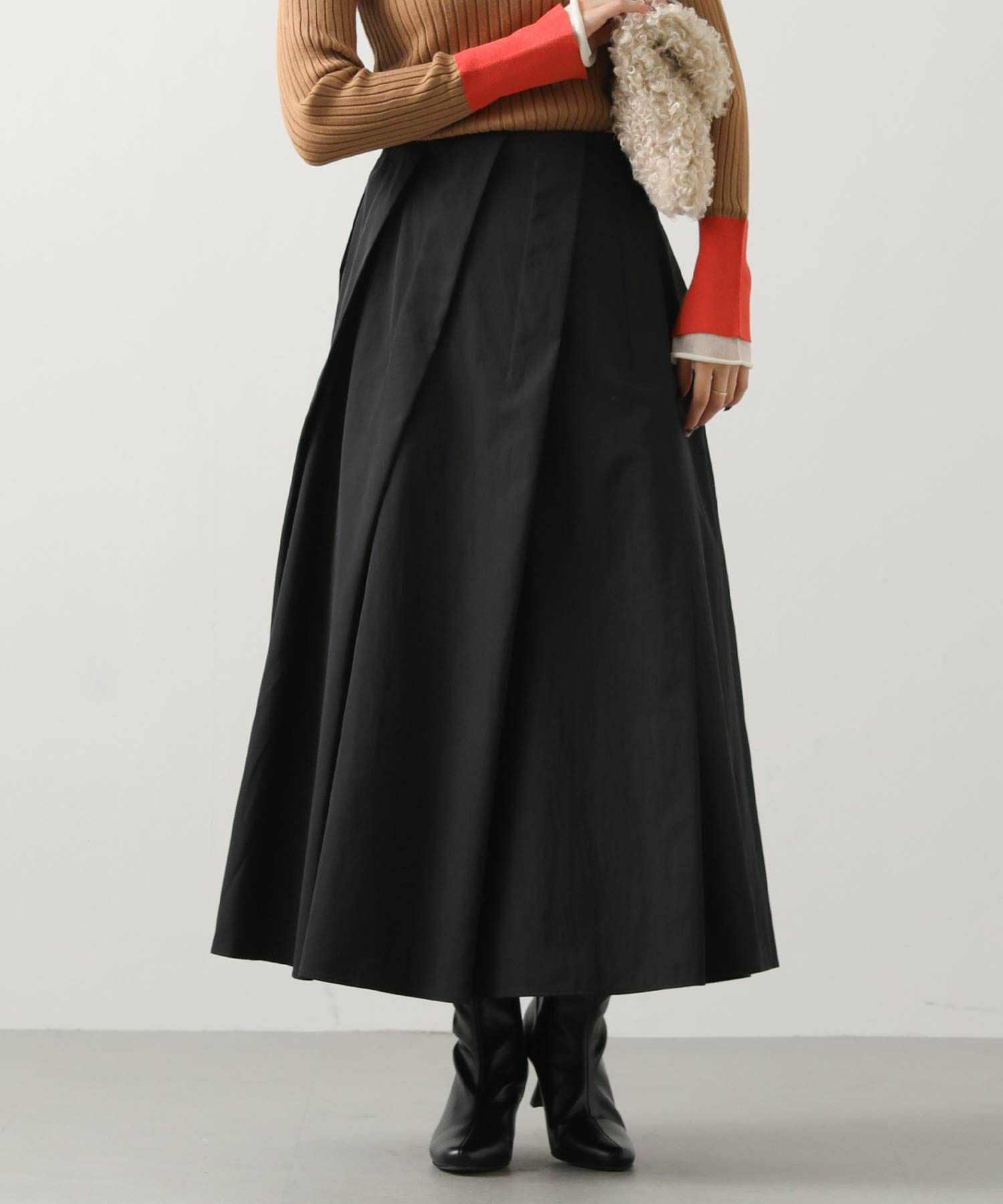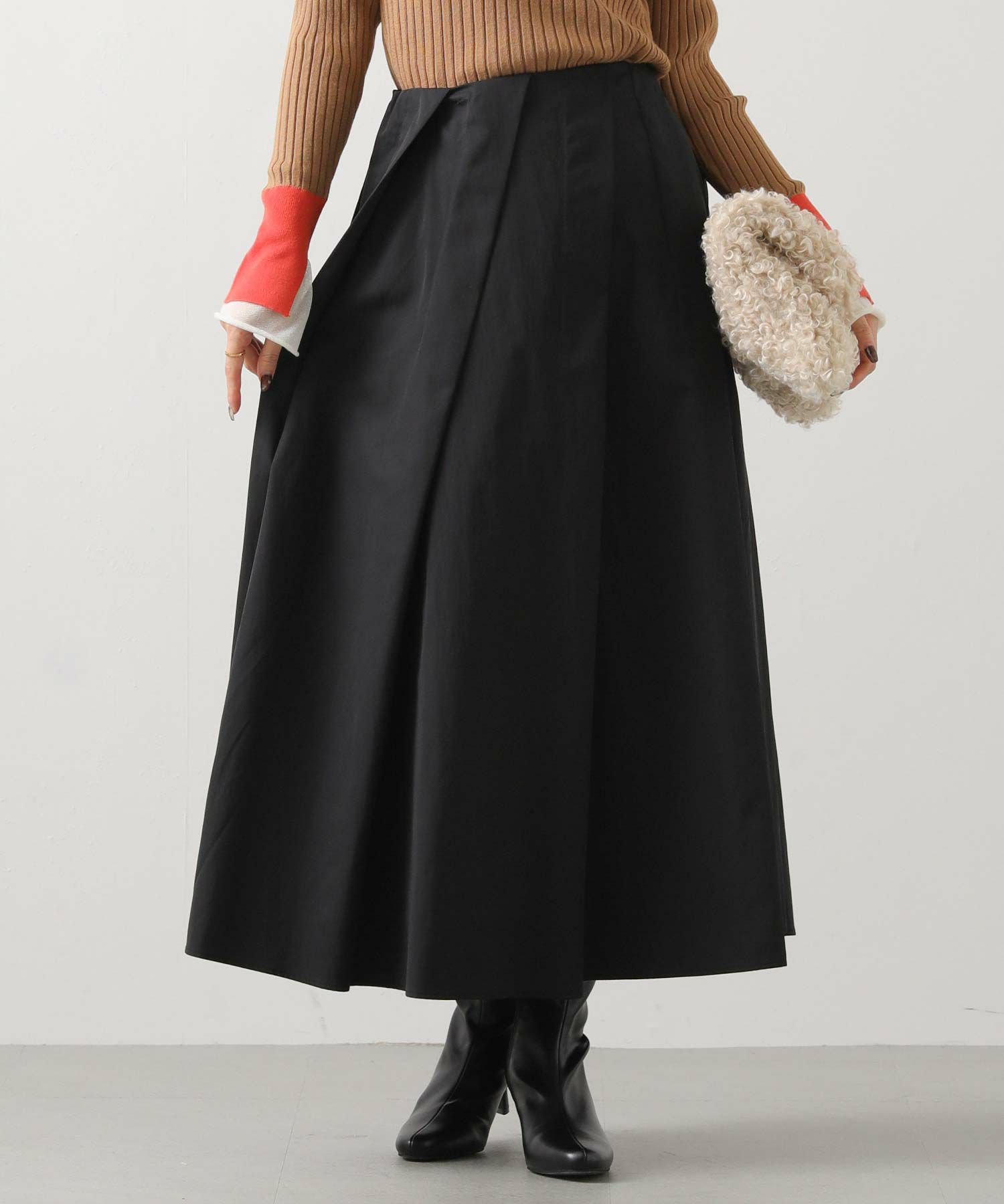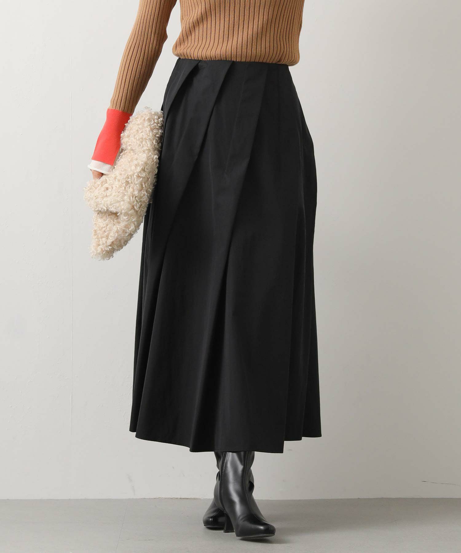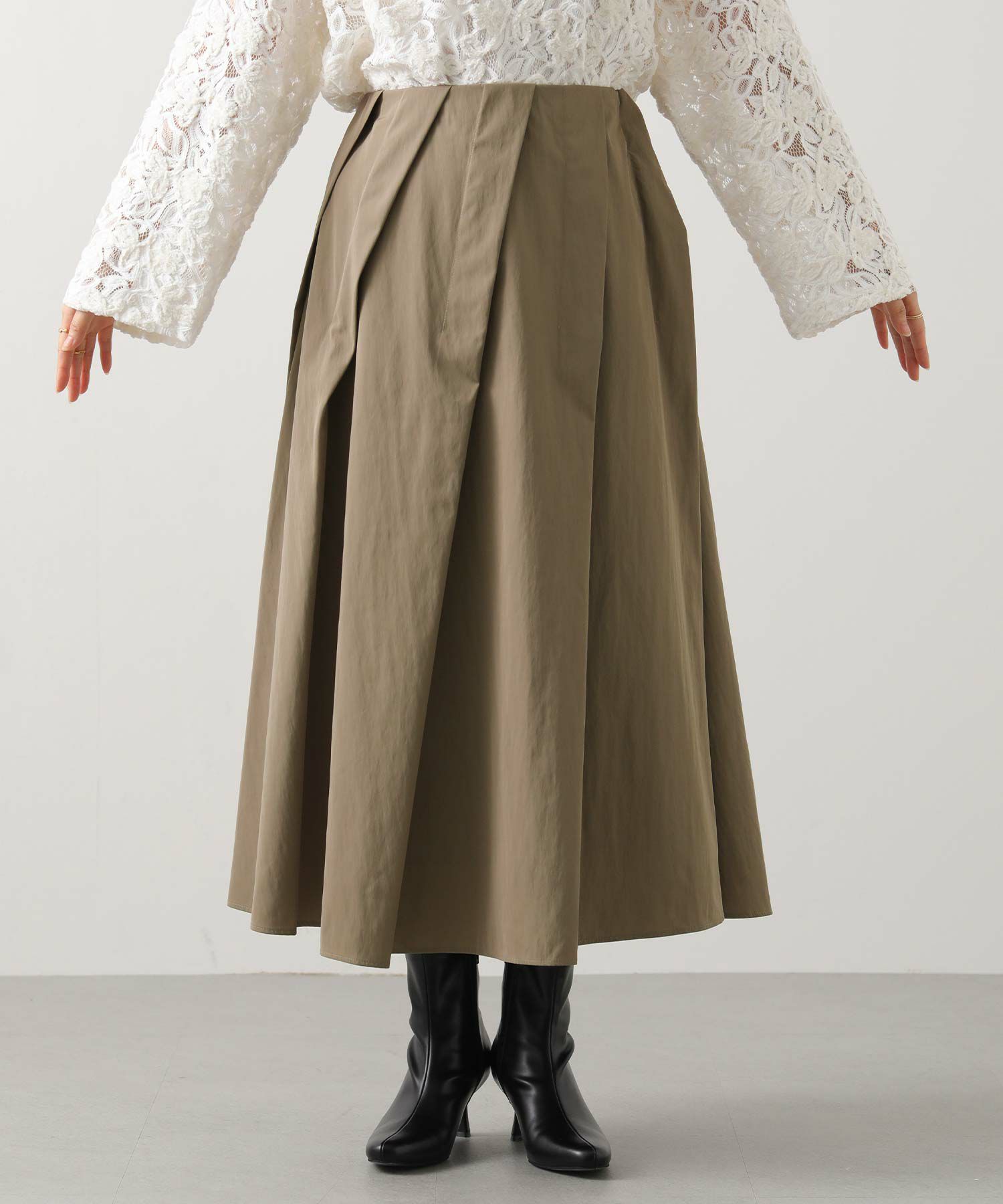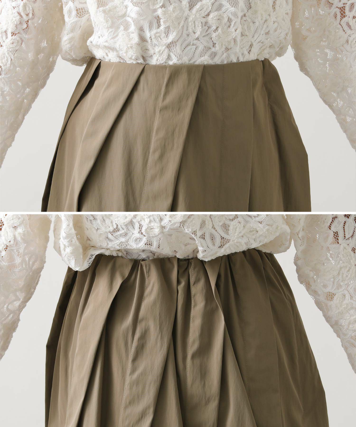 斜めに入ったタックが、ドラマティックなアシメラインを作るスカート。