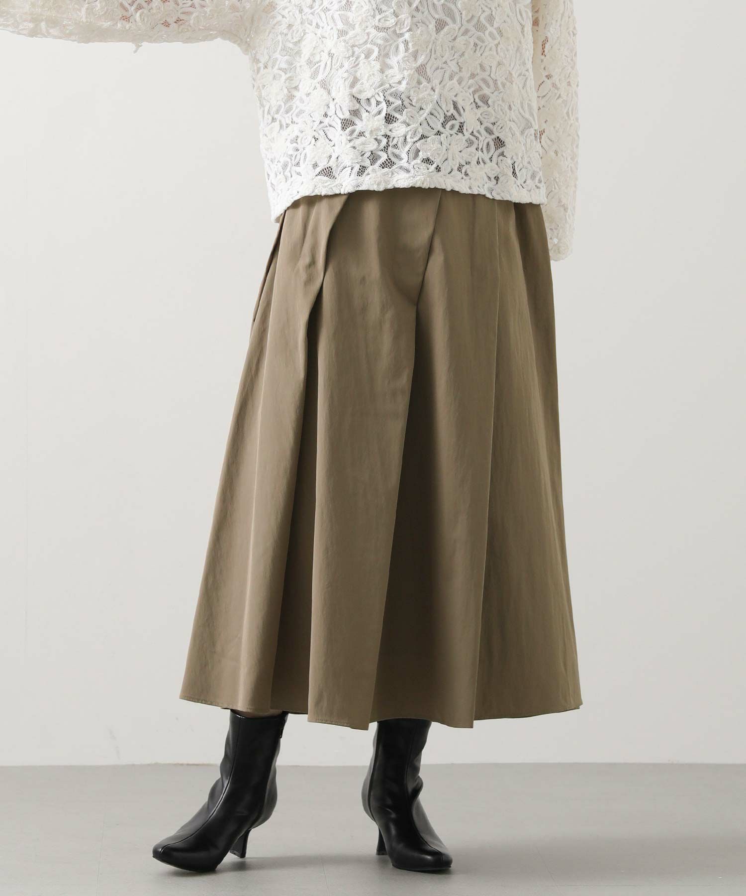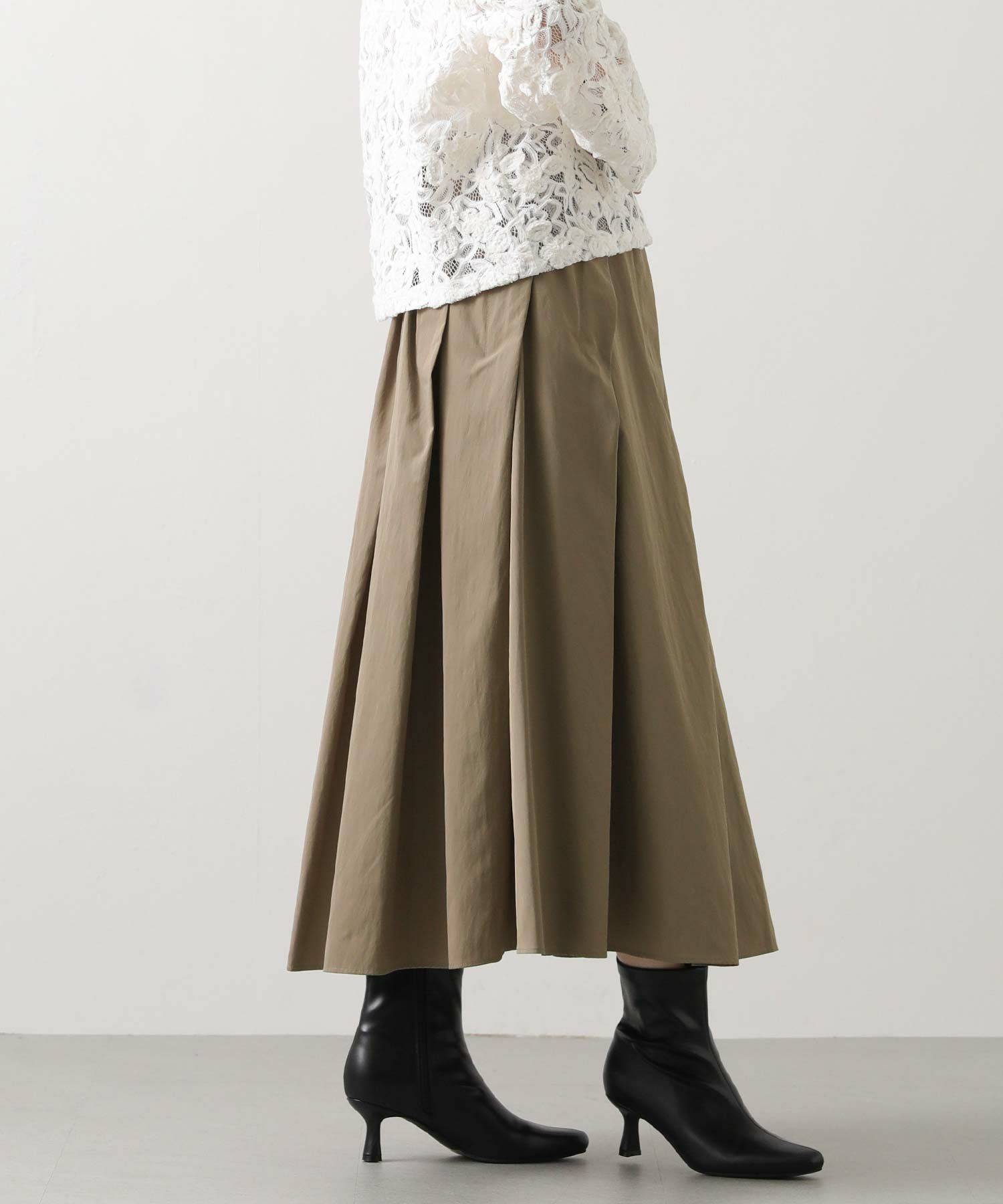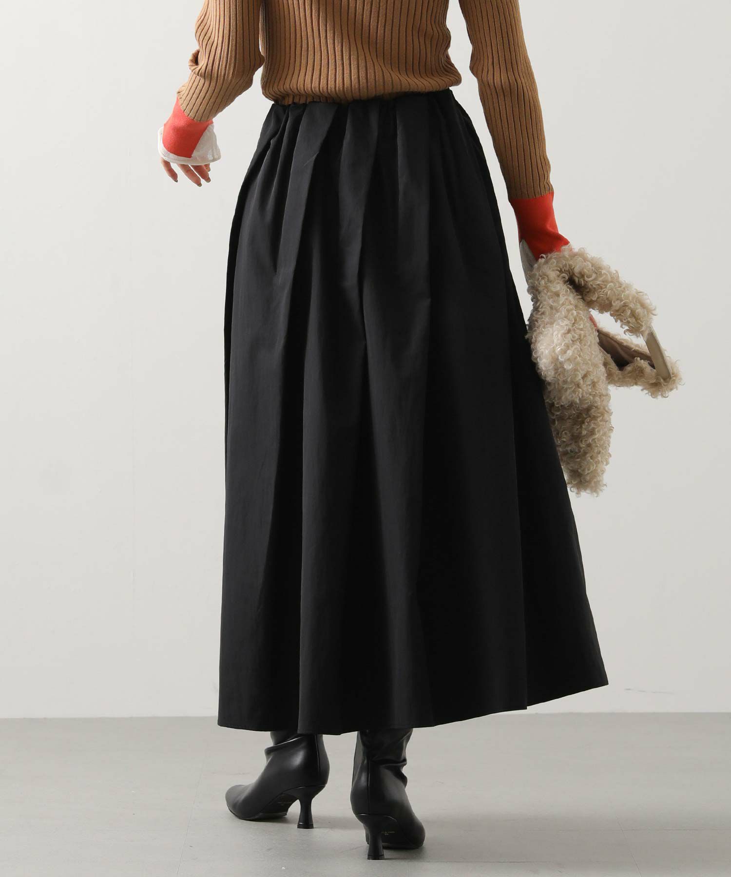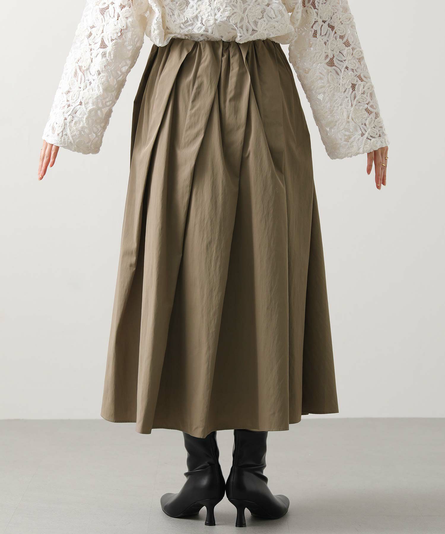 斜めに入ったタックが、ドラマティックなアシメラインを作るスカート。