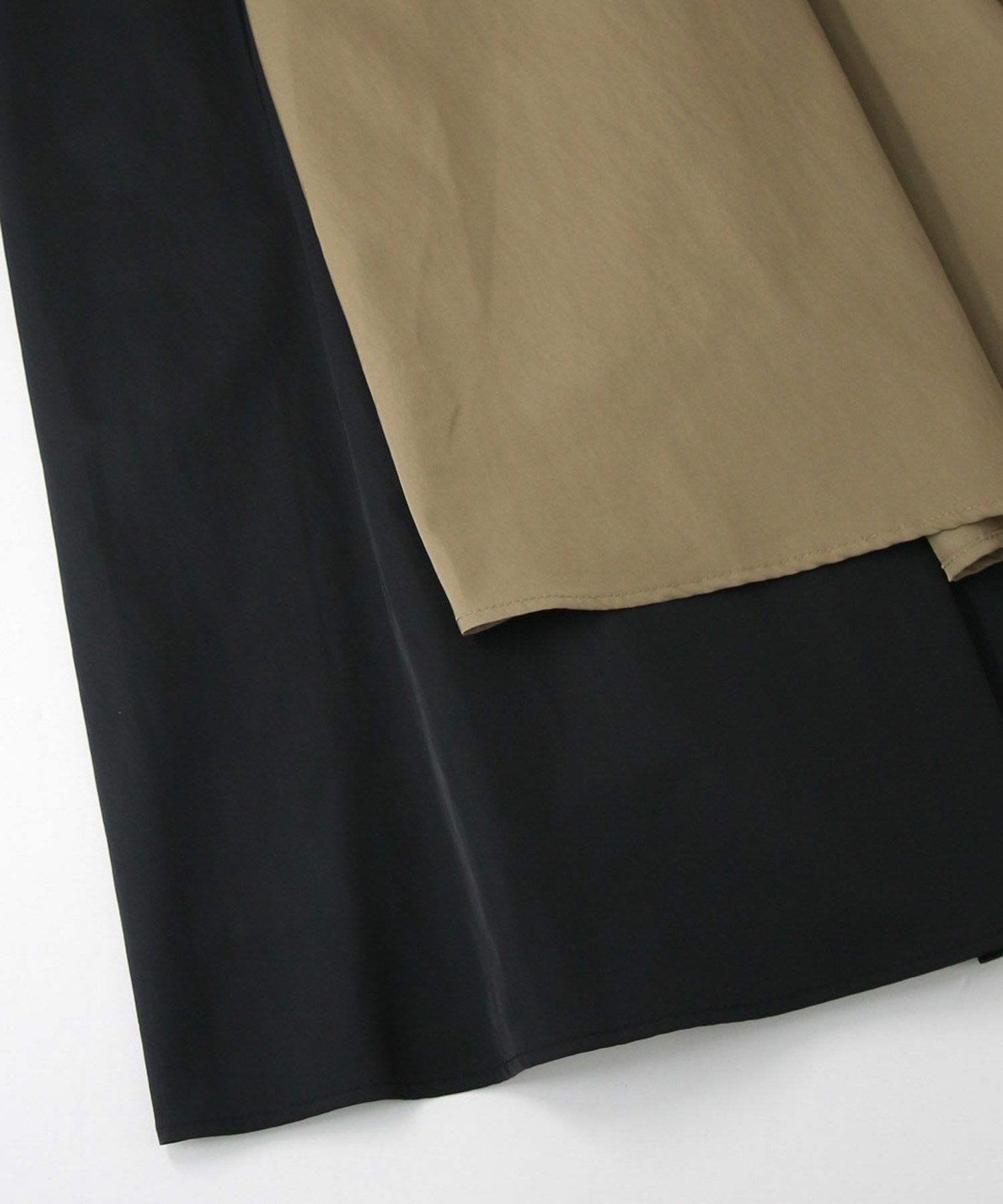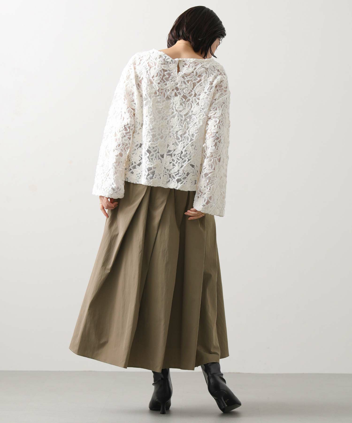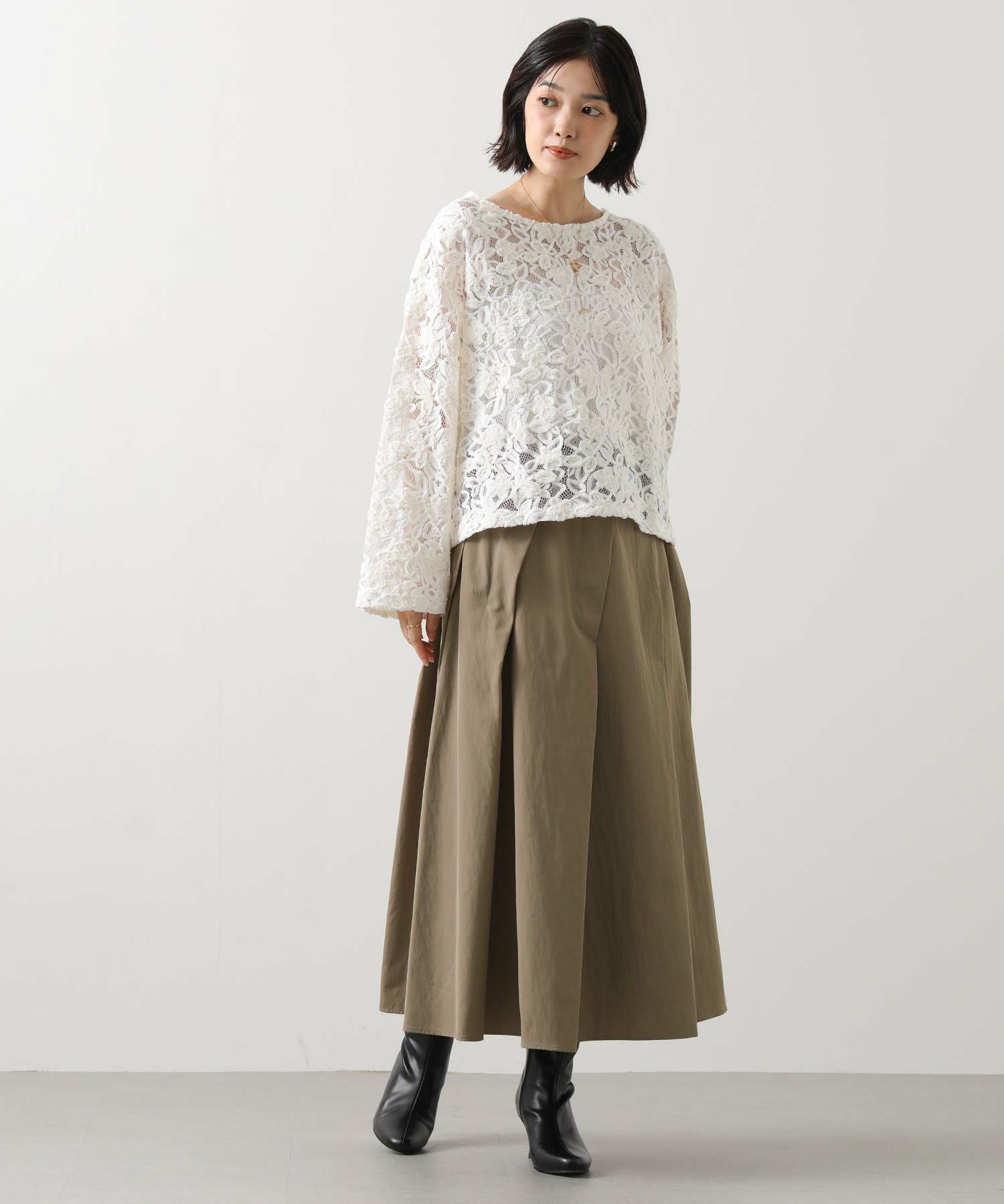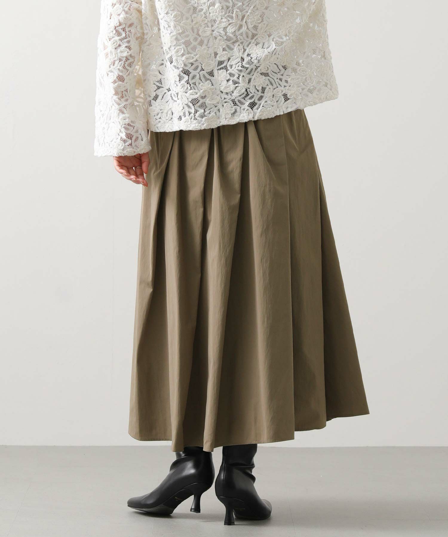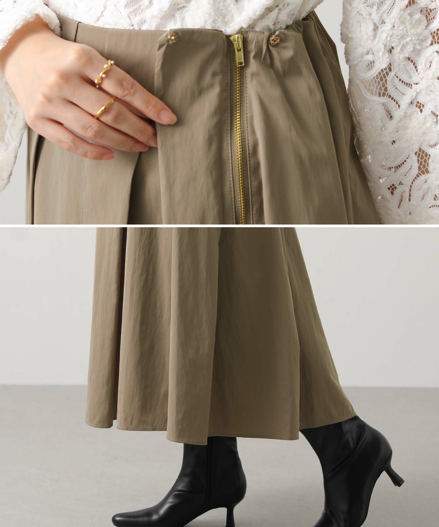 斜めに入ったタックが、ドラマティックなアシメラインを作るスカート。