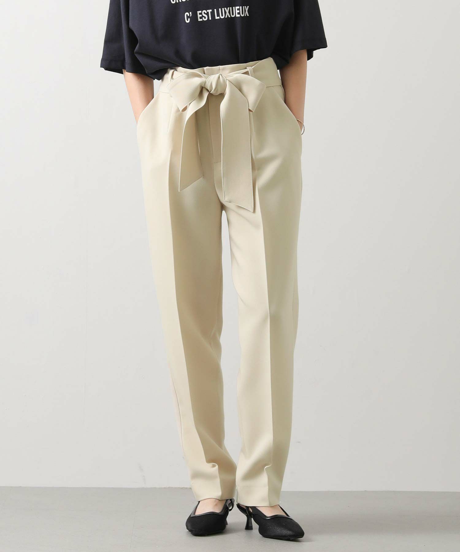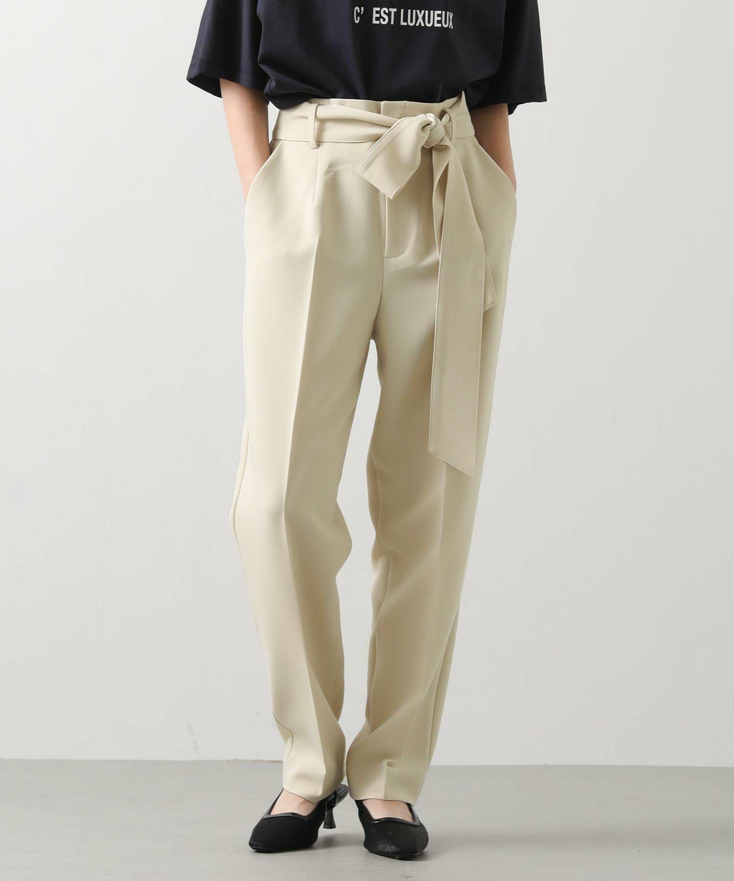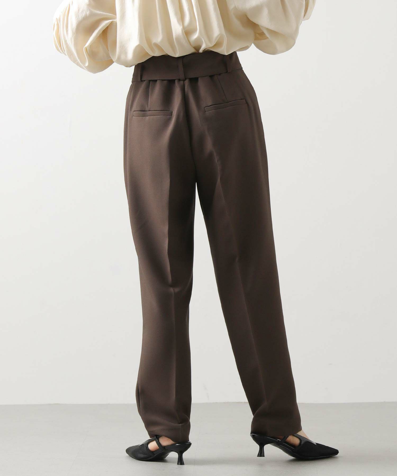 すっきりとしたタックレスのハイウエストデザインで、スタイルアップ効果も期待できるシルエット。