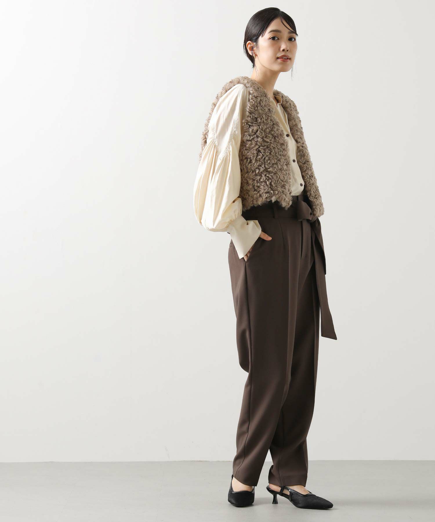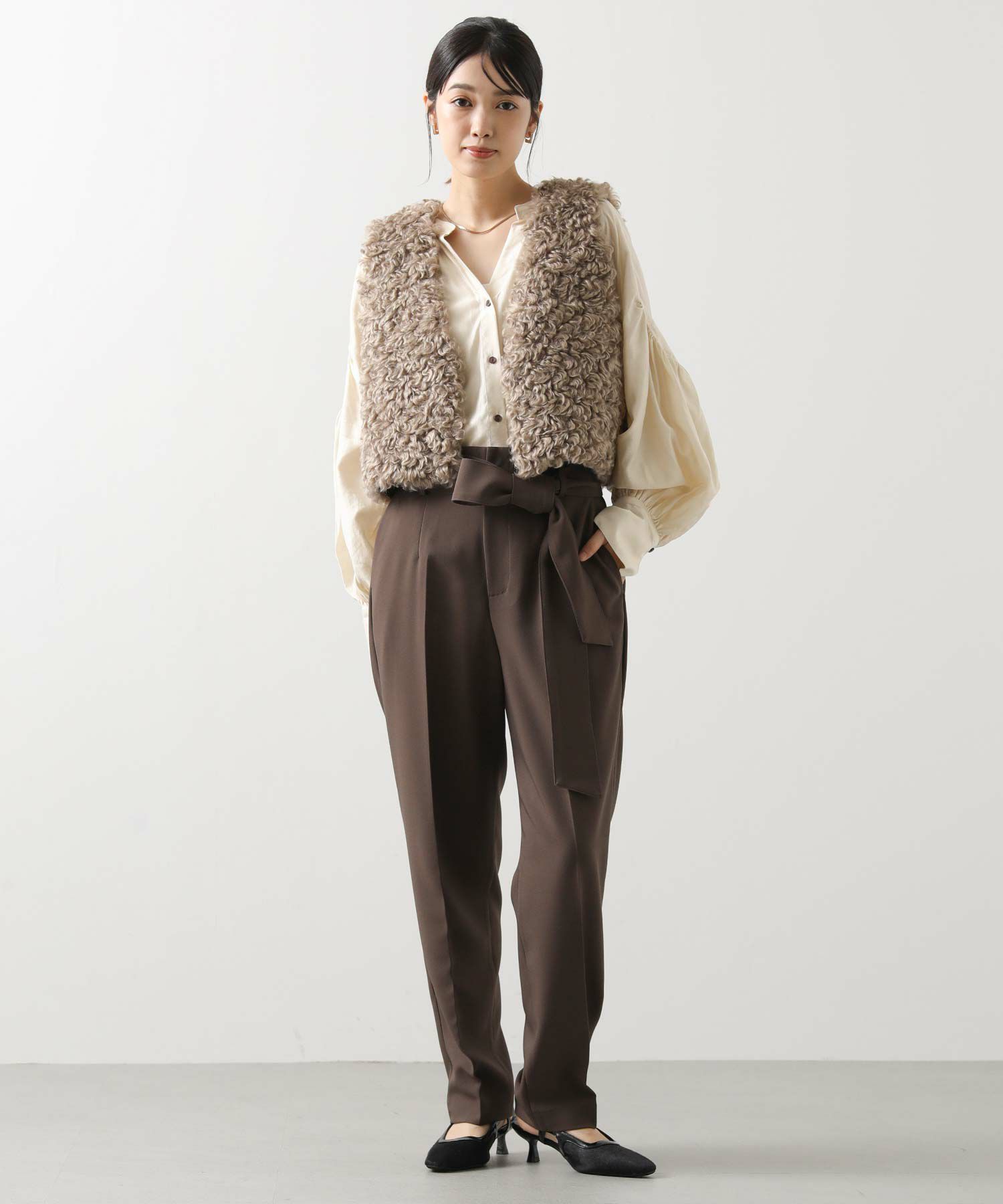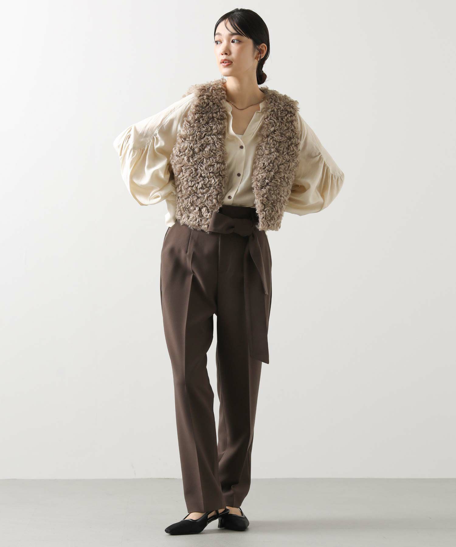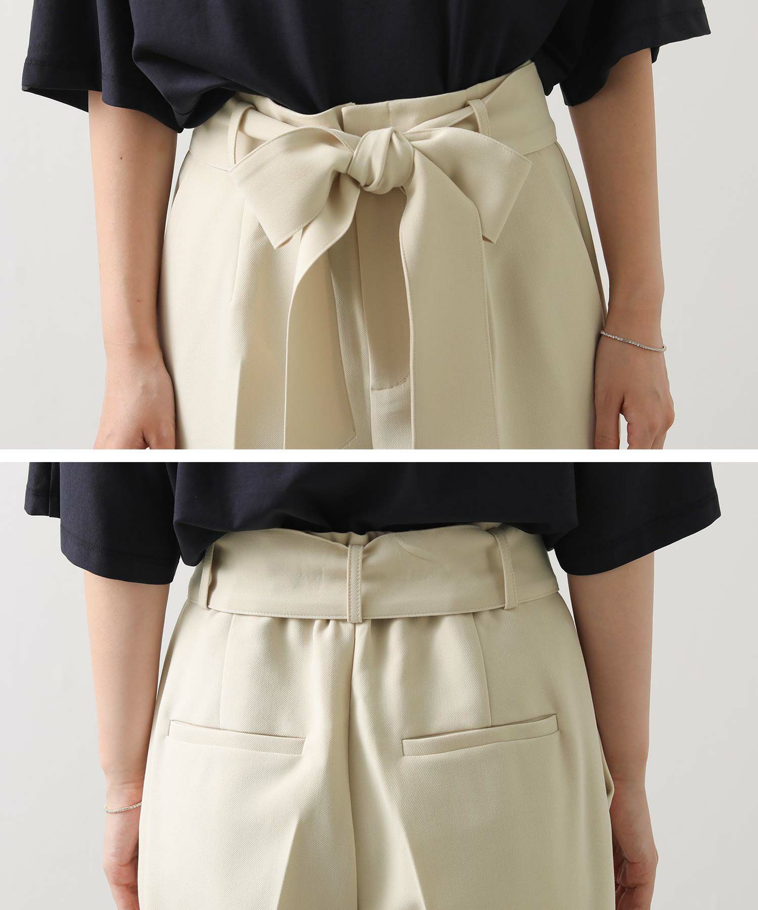 すっきりとしたタックレスのハイウエストデザインで、スタイルアップ効果も期待できるシルエット。