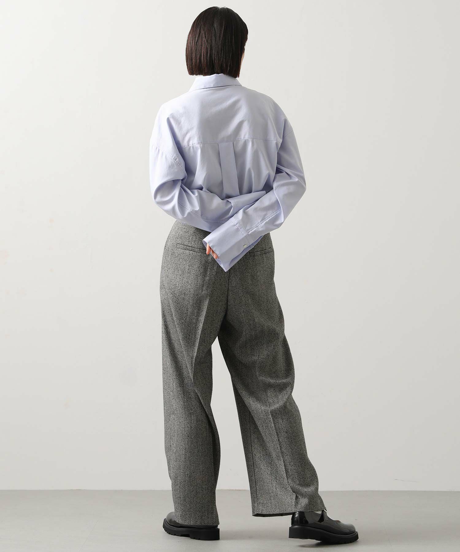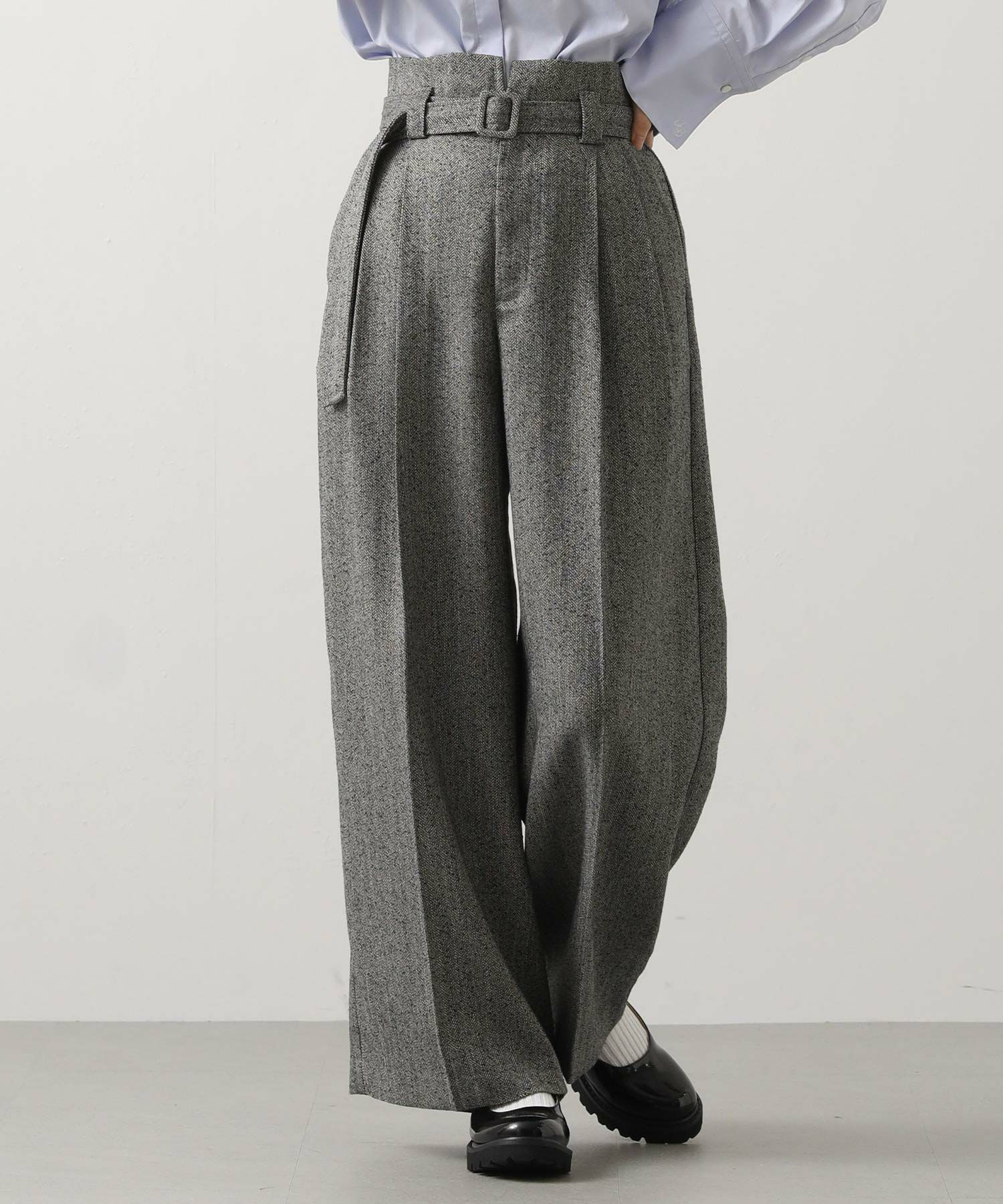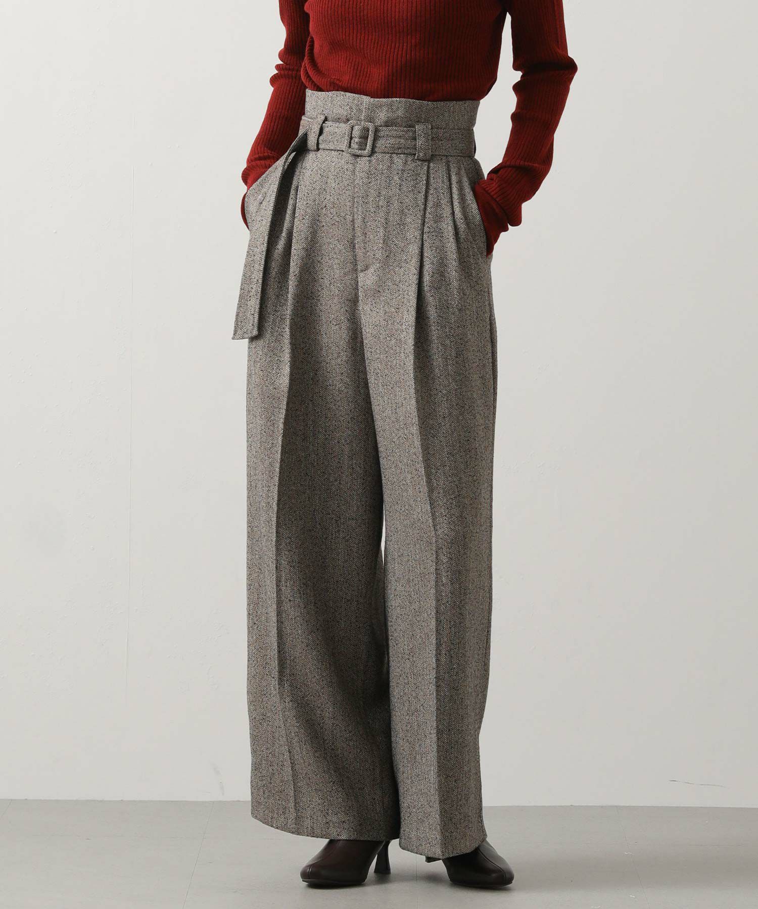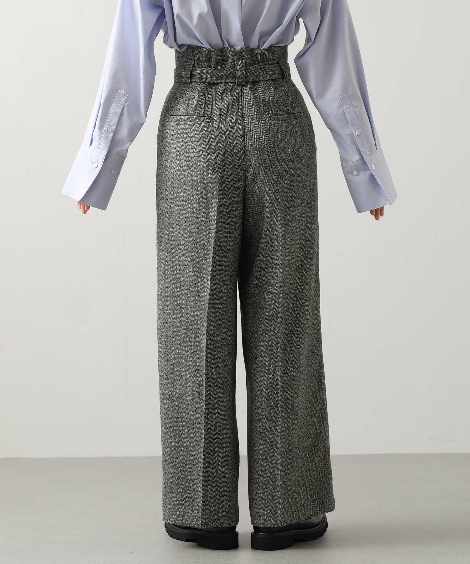ハイウエストで脚長効果があり、フロントのタックとセンタープレスが美しいシルエットを強調、スッキリとしたラインを演出。