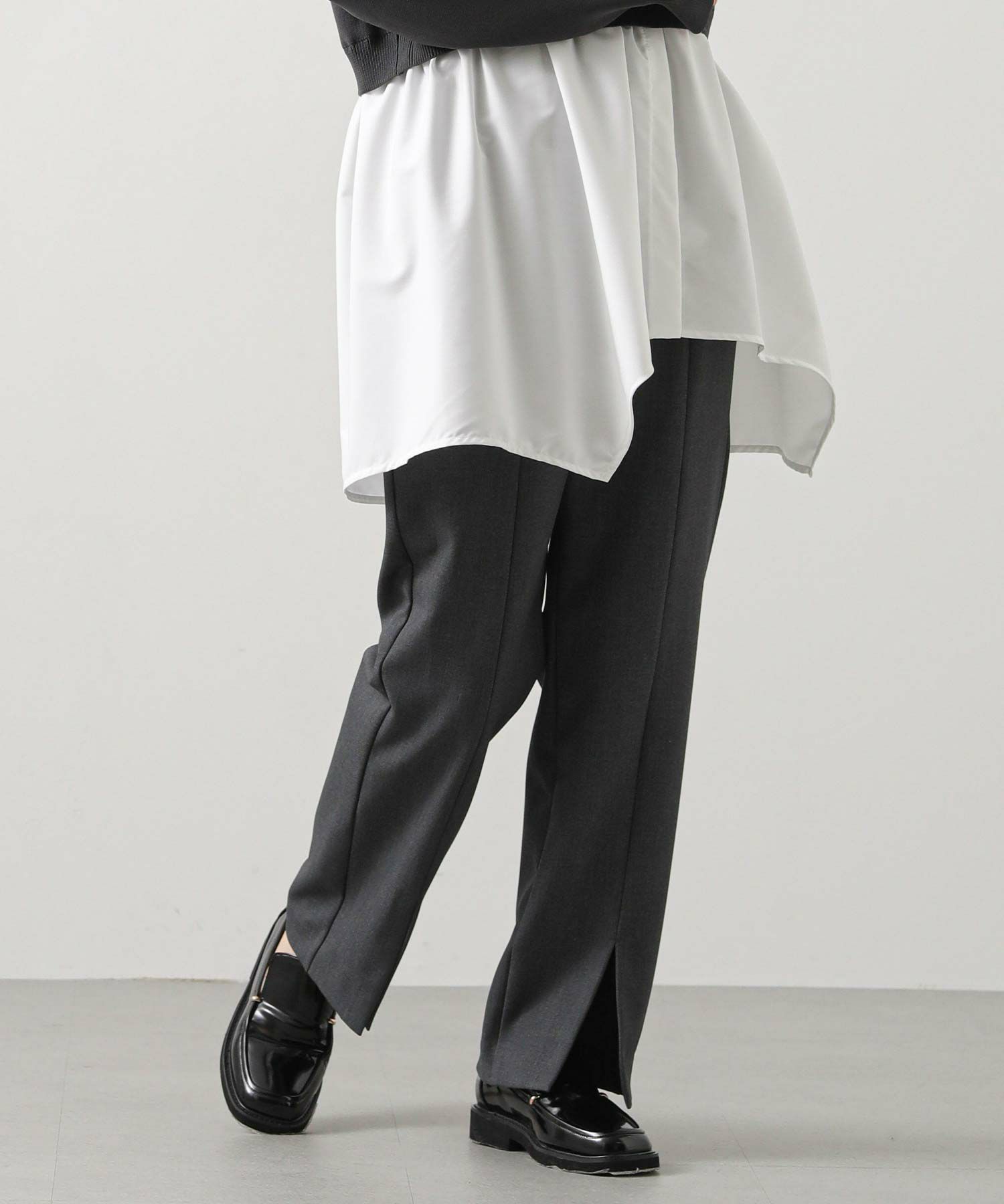 フロントにスリットが入ったスッキリ見えパンツ。